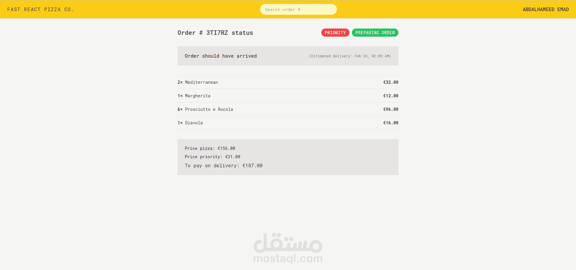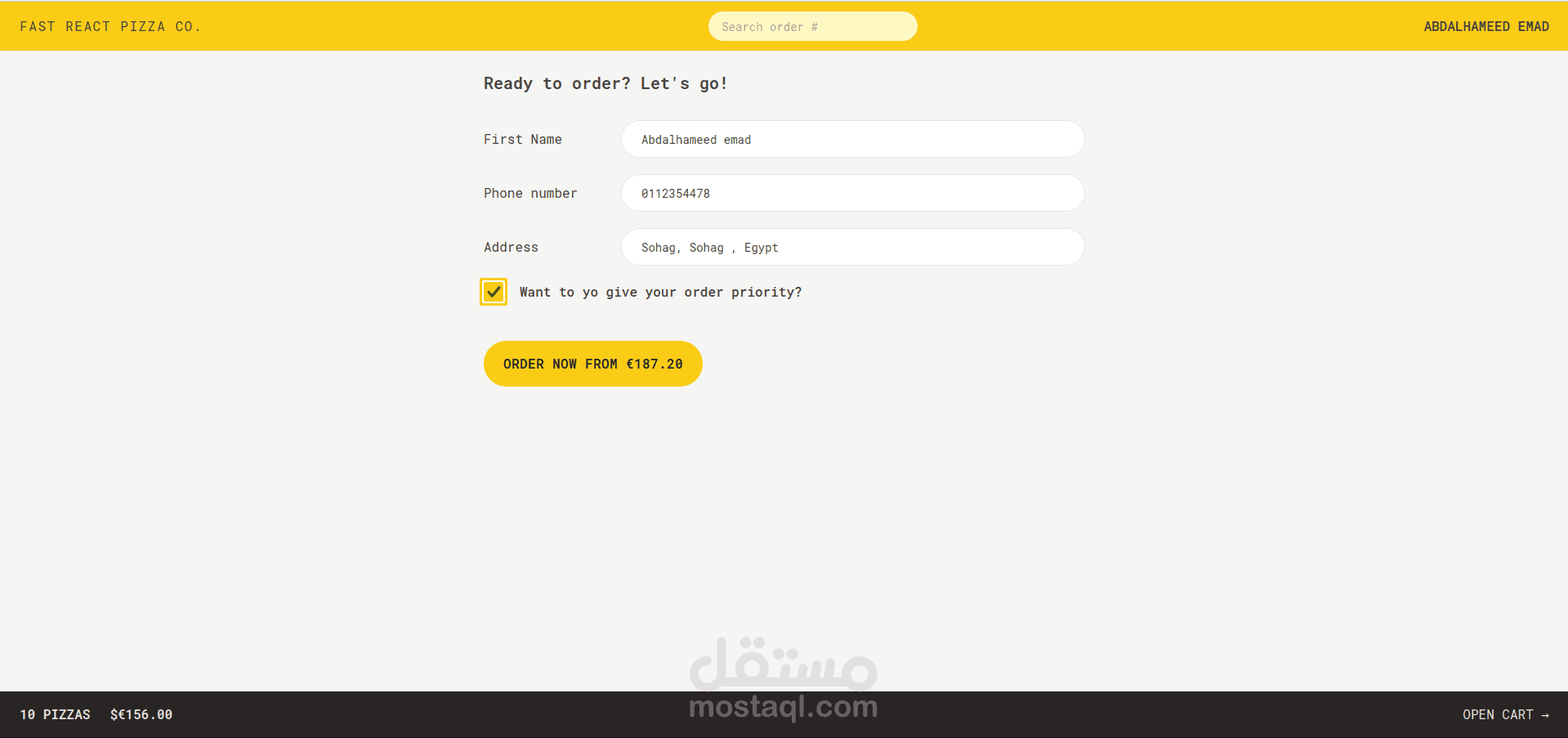 The pizza ordering Front-end application facilitates user interaction with a dynamic menu to select and place orders conveniently. It offers users the ability to specify pizza quantity, adjust quantities as desired, and express priority preferences for their orders. Automatic location detection expedites the ordering process. The application operates on a simplified model, devoid of user accounts and login requirements. Instead, users provide their names upon initiating app usage. Menu information is retrieved from an API, ensuring seamless updates to the menu contents.