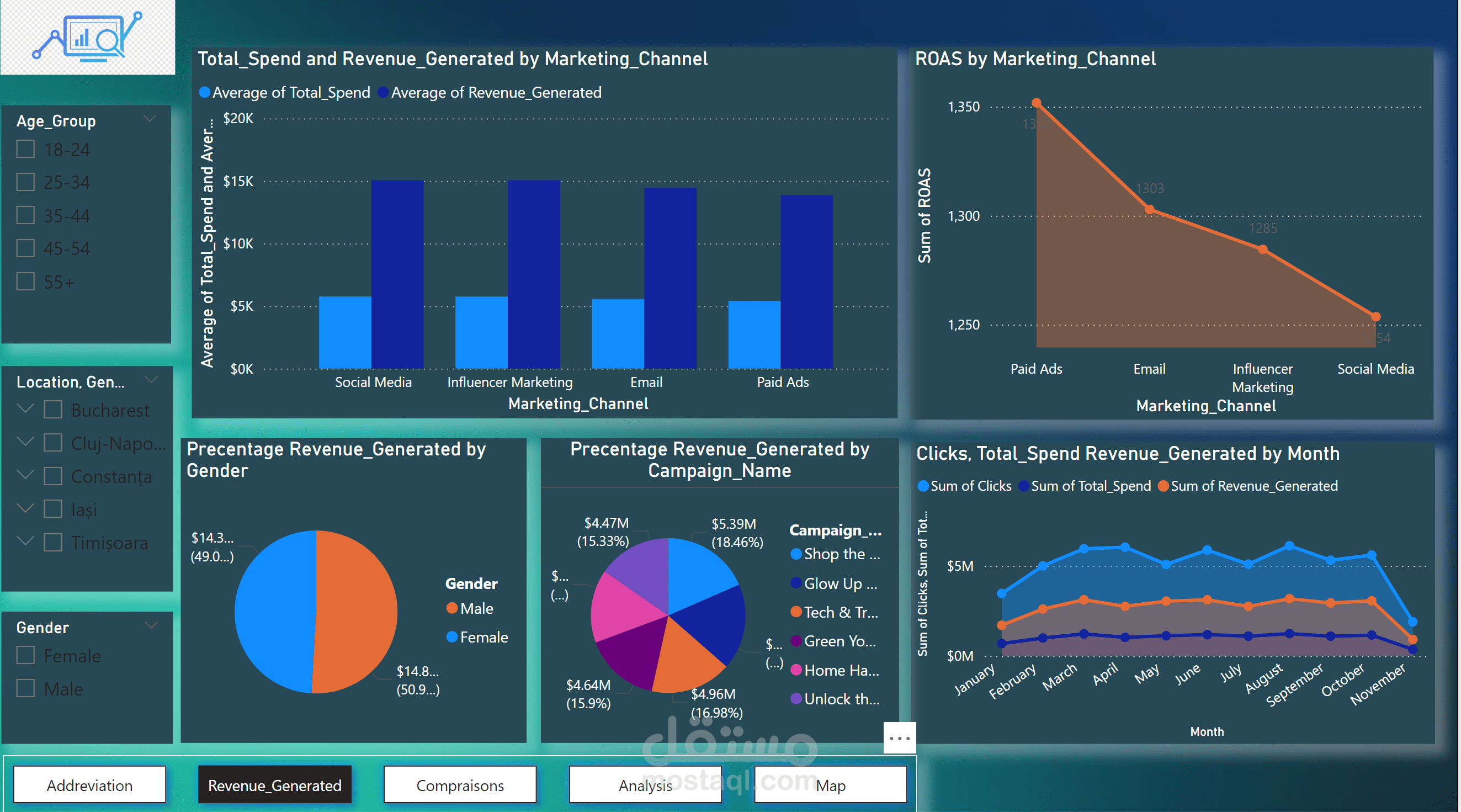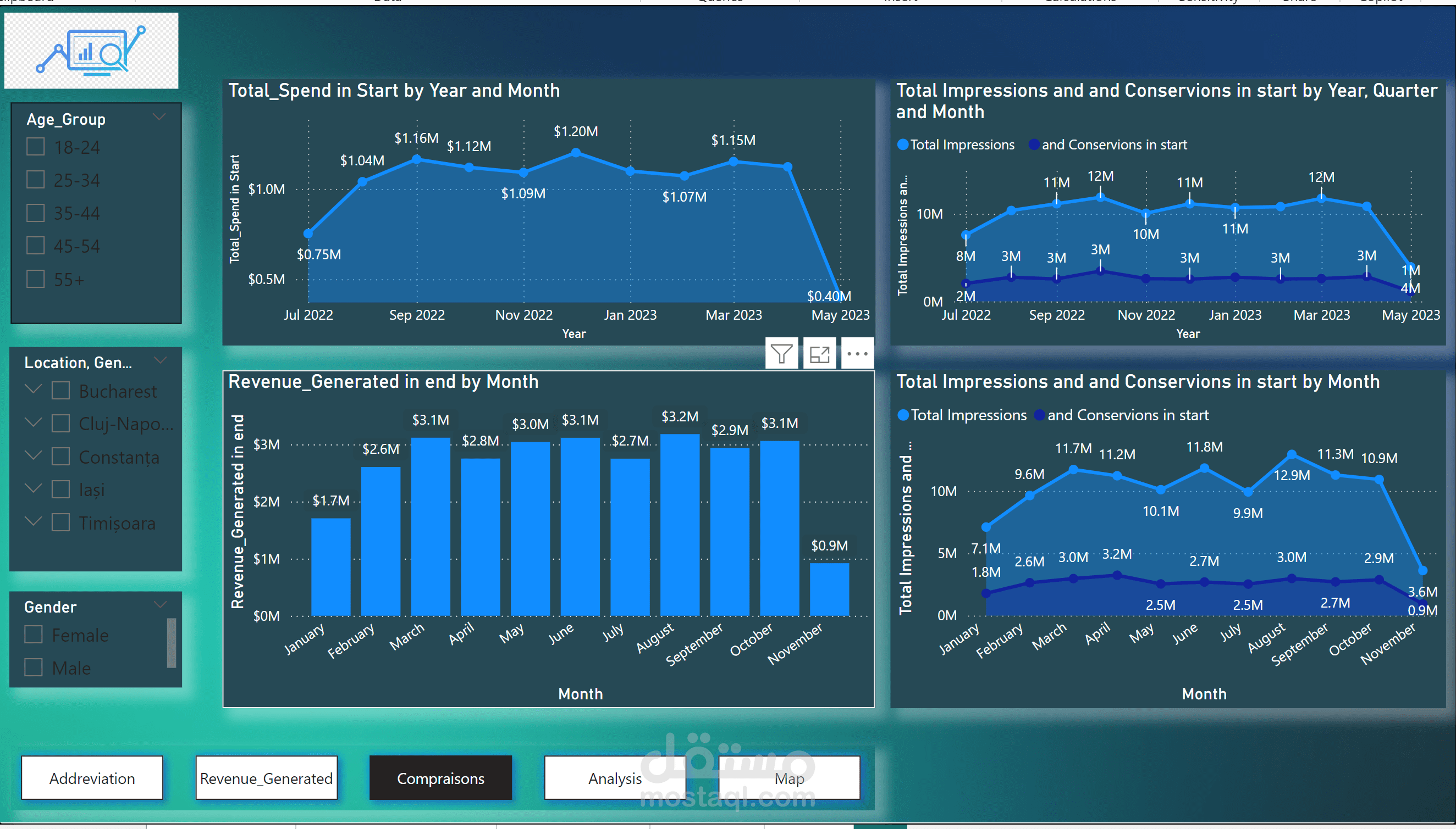 ●Demographics Insights: Charts showing the breakdown of conversions and revenue by age, gender, and location.