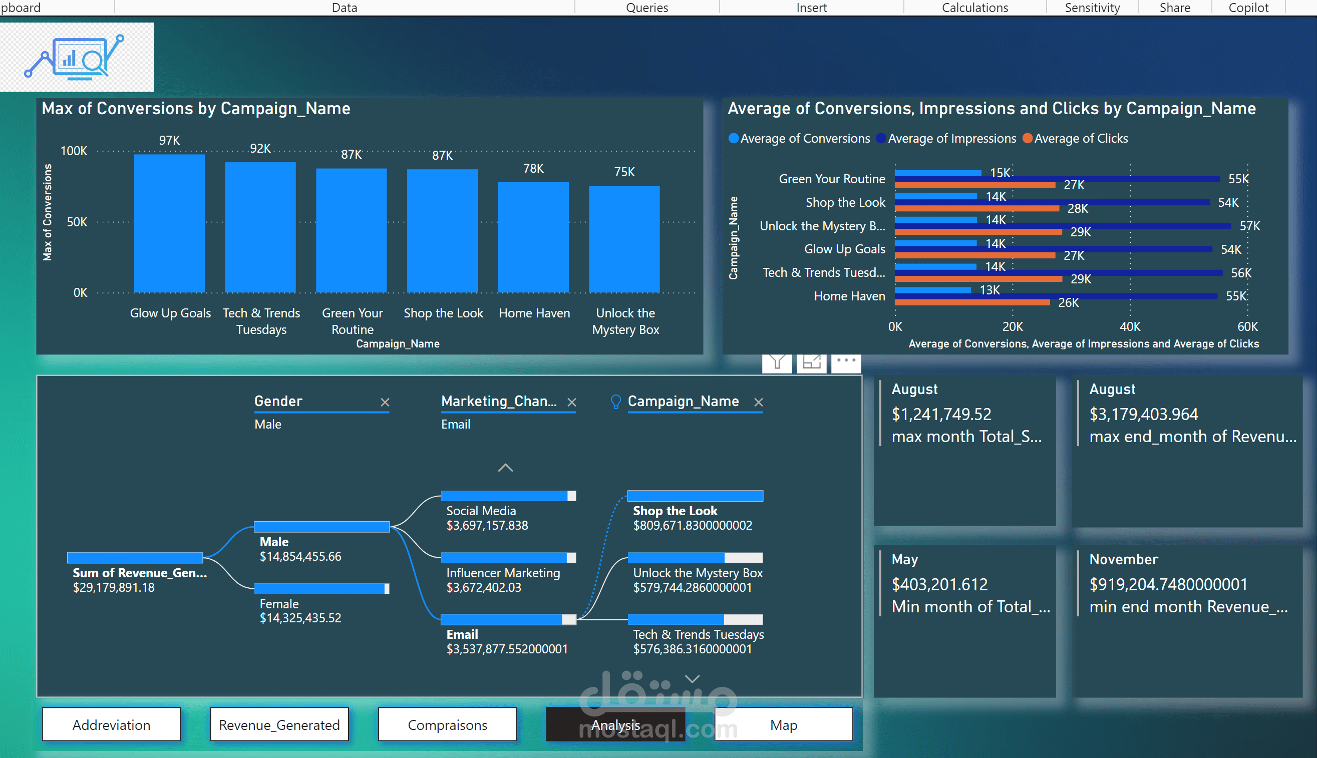 ●KPIs Summary: Include total impressions, total clicks, total conversions, total spend, total revenue, average CTR, and ROAS.
