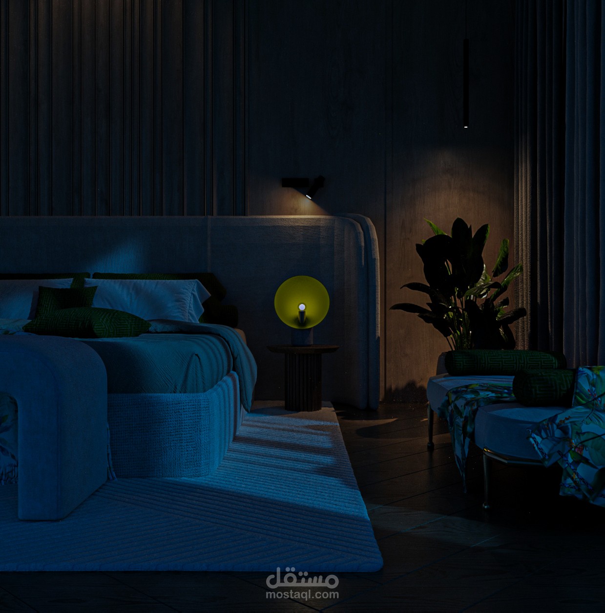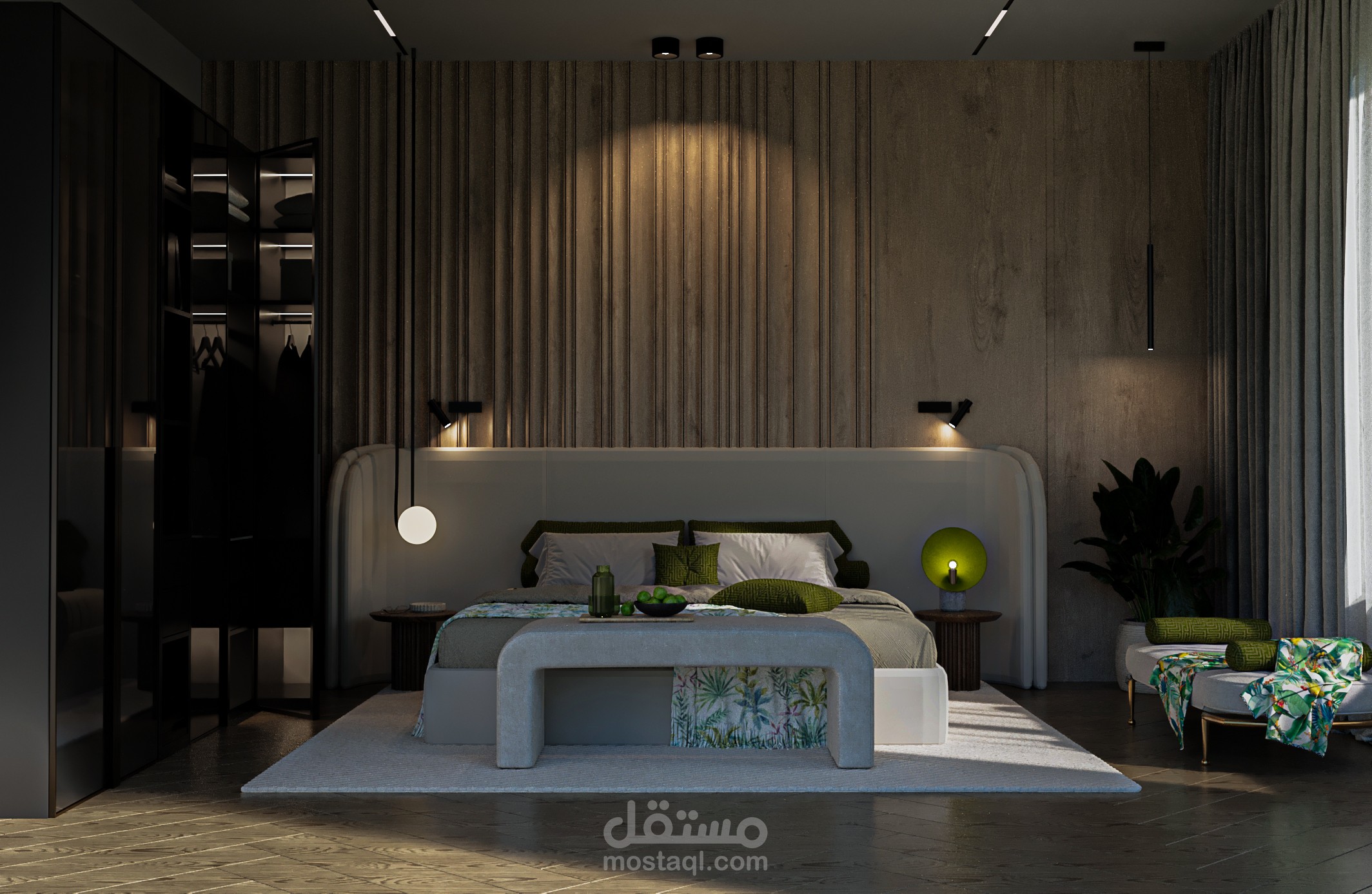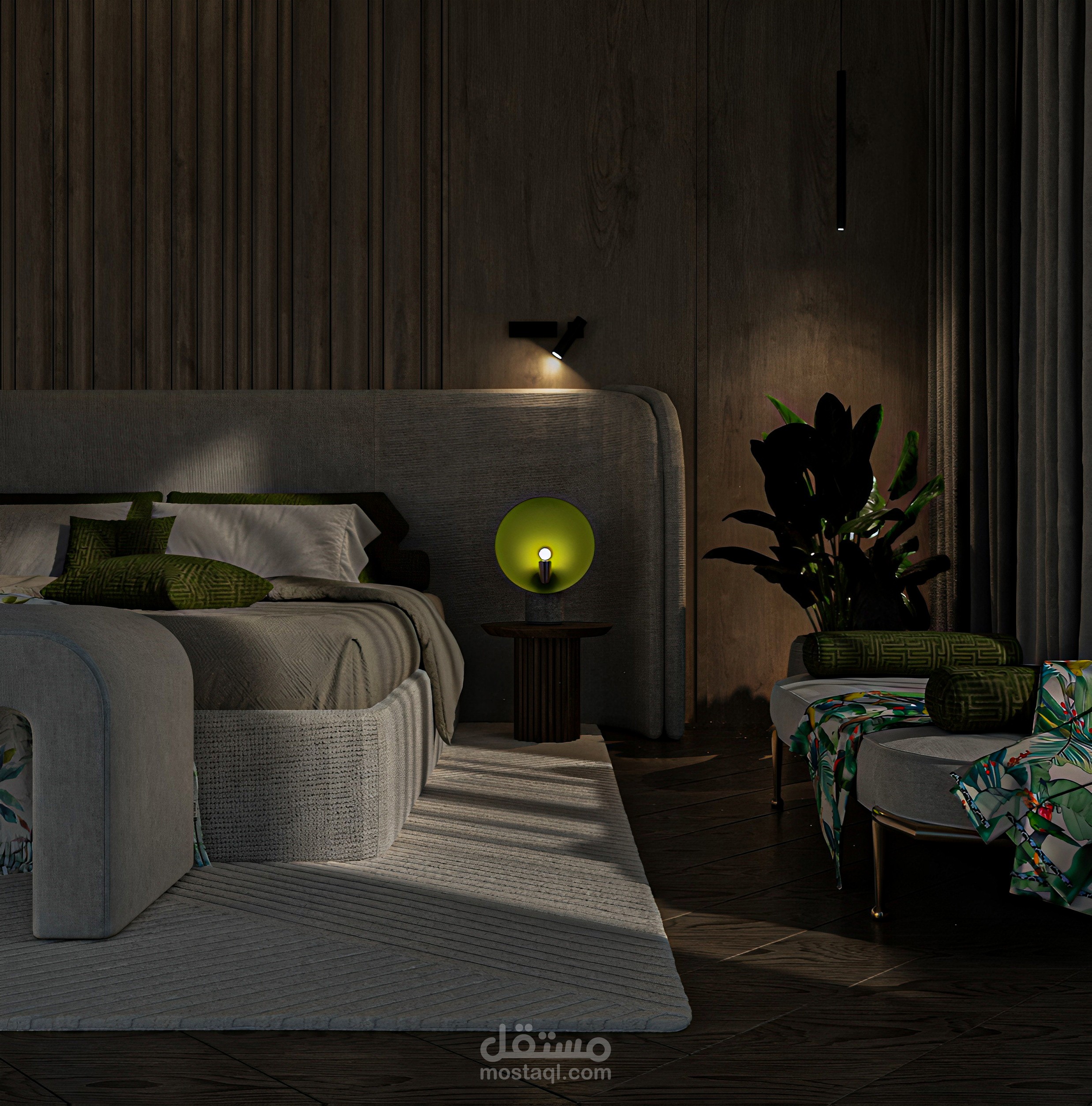 غرفة نوم أنيقة، تمتاز بتصميم معاصر وجريء، يمزج بين الألوان الهادئة والتفاصيل الفريدة. الجدران الخلفية المغطاة بتأثيرات خشبية عامودية تضفي إحساسًا بالدفء والرقي، بينما توحي الأضواء المعلقة بجو من الهدوء والجاذبية. السرير بتصميمه البسيط والراقي يتوسط الغرفة، مع طقم سرير يجمع بين اللونين الأخضر والأبيض، مما يضيف لمسة طبيعية وانسجام مع النبات الجانبي.