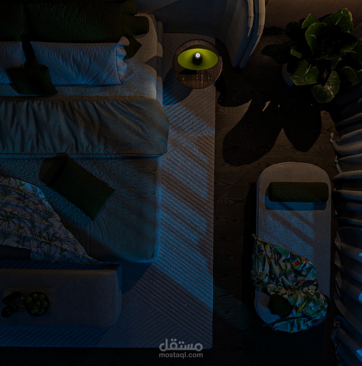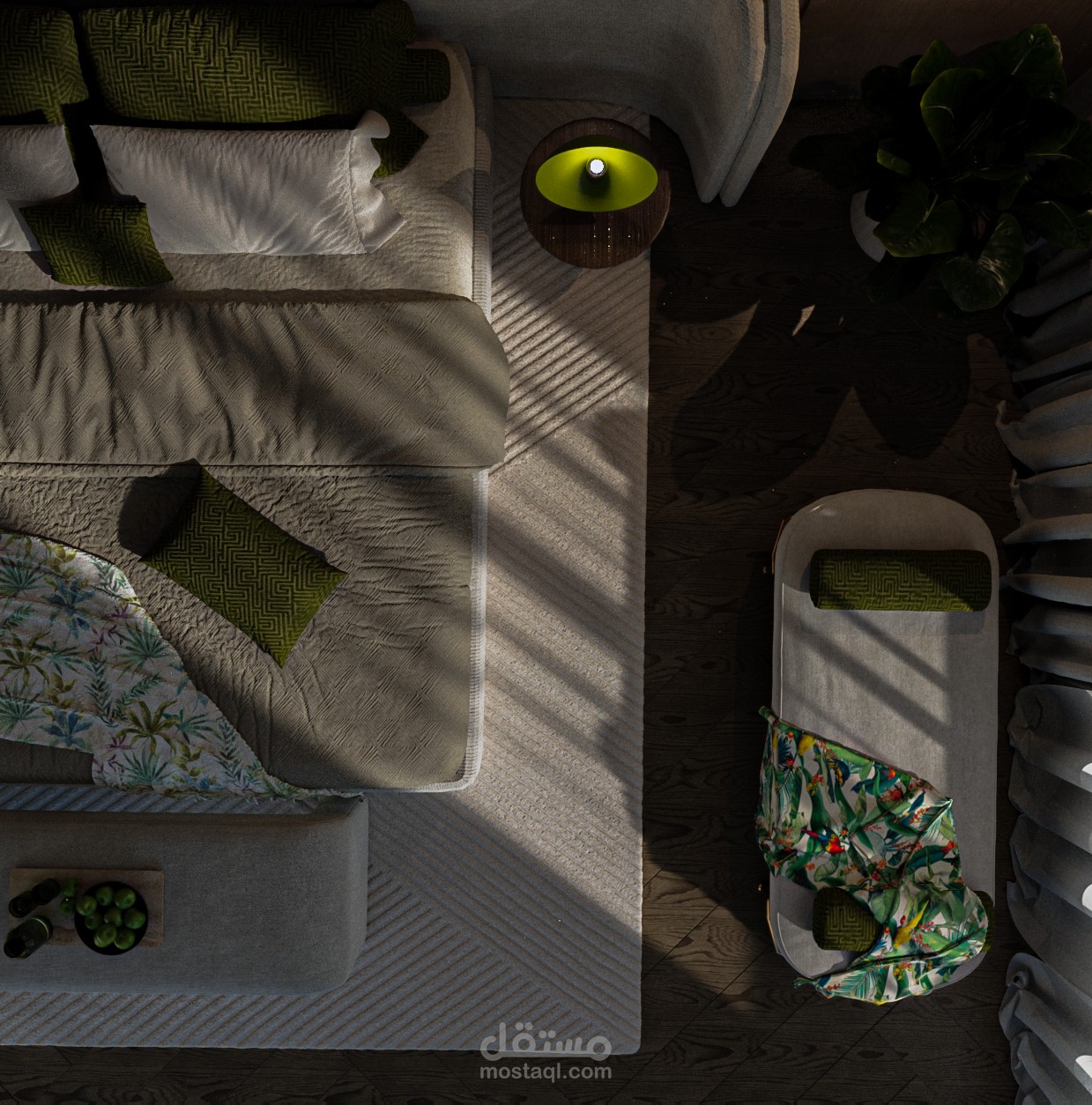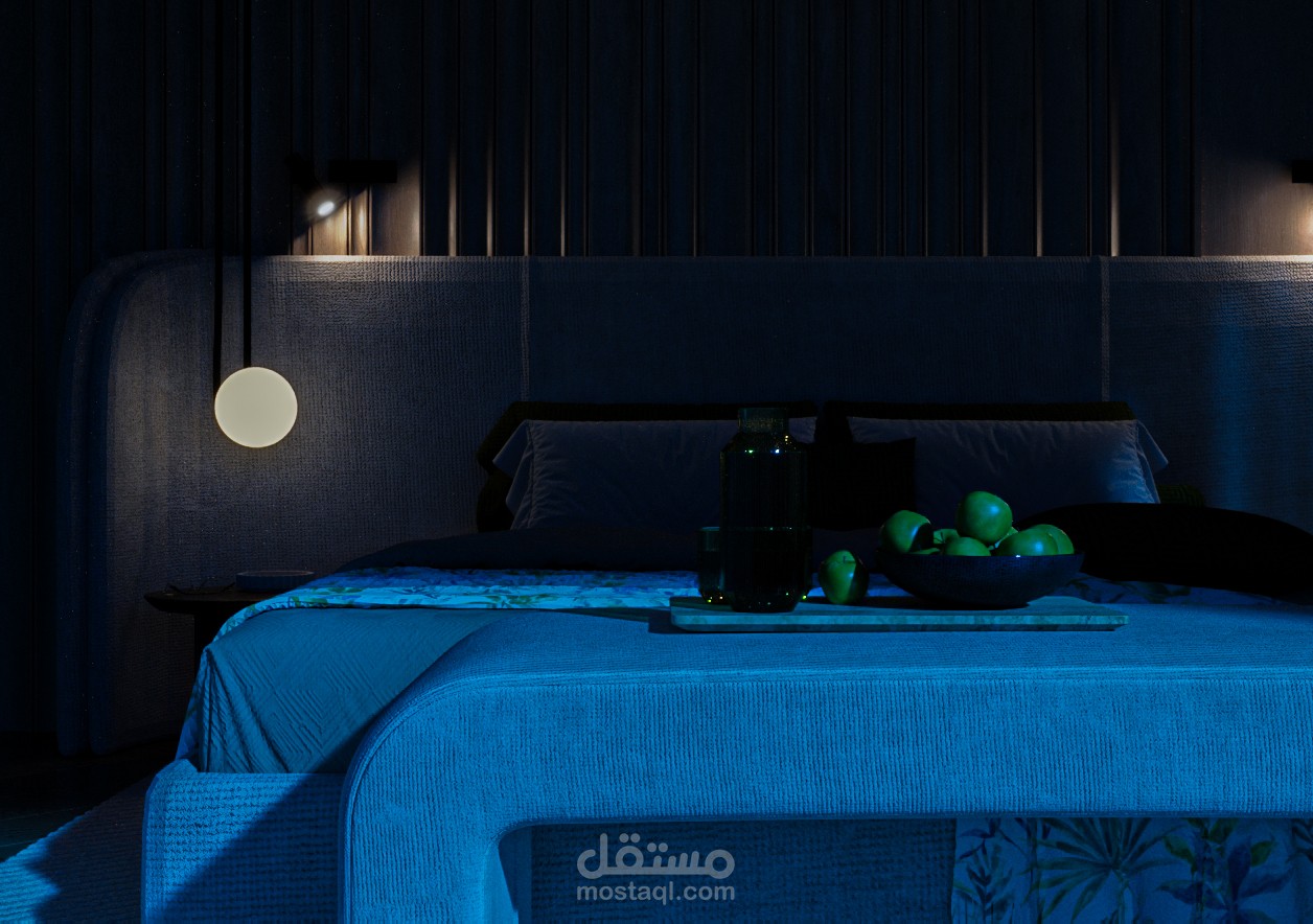 غرفة نوم أنيقة، تمتاز بتصميم معاصر وجريء، يمزج بين الألوان الهادئة والتفاصيل الفريدة. الجدران الخلفية المغطاة بتأثيرات خشبية عامودية تضفي إحساسًا بالدفء والرقي، بينما توحي الأضواء المعلقة بجو من الهدوء والجاذبية. السرير بتصميمه البسيط والراقي يتوسط الغرفة، مع طقم سرير يجمع بين اللونين الأخضر والأبيض، مما يضيف لمسة طبيعية وانسجام مع النبات الجانبي.