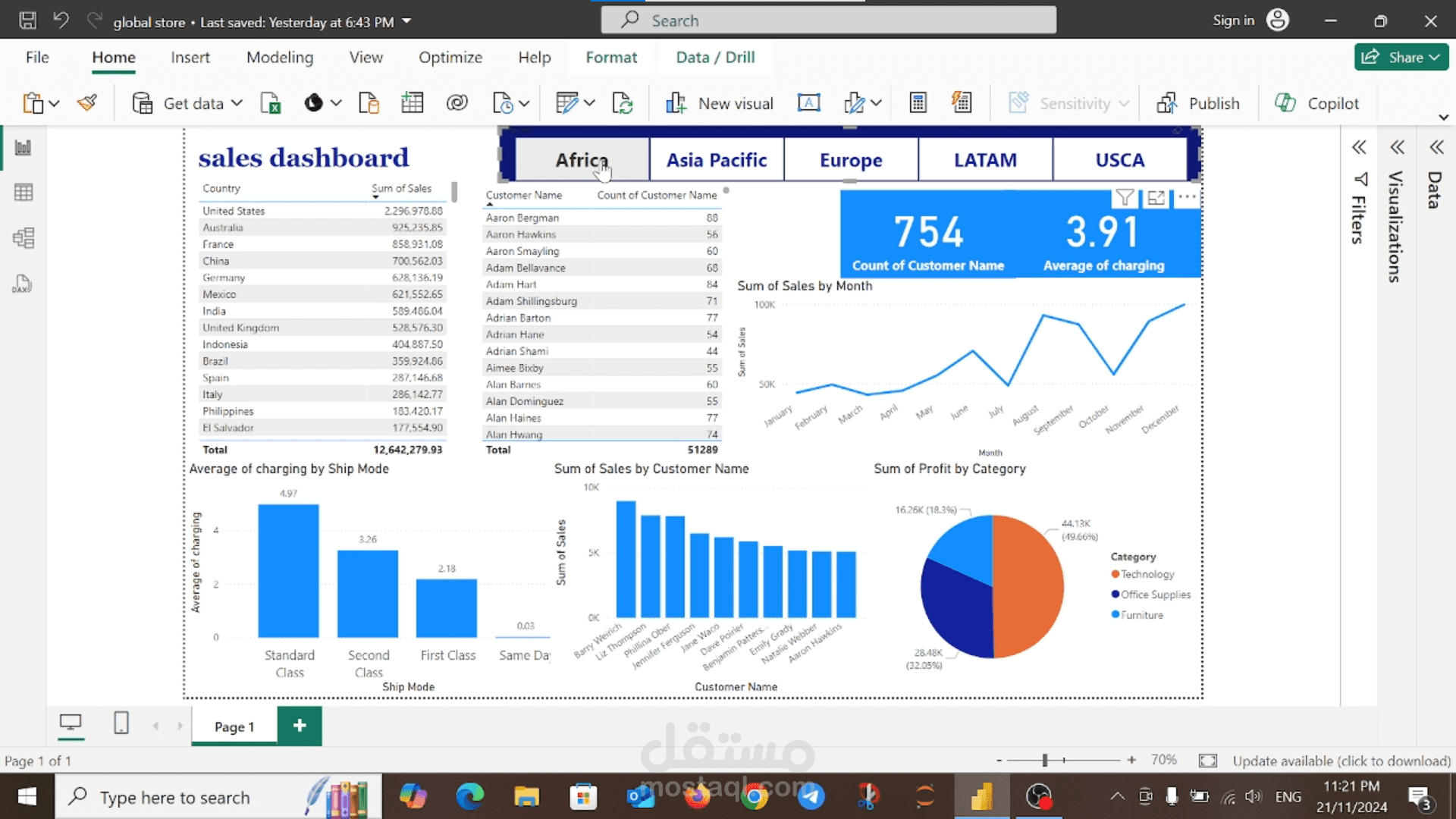 تحليل بيانات لمورد عالمى باستخدام برنامج power bi تحليل تفصيلى للولايات والعملاء و العناصر والبيع والعائد وطريقة الشحن وغيرها الكثير