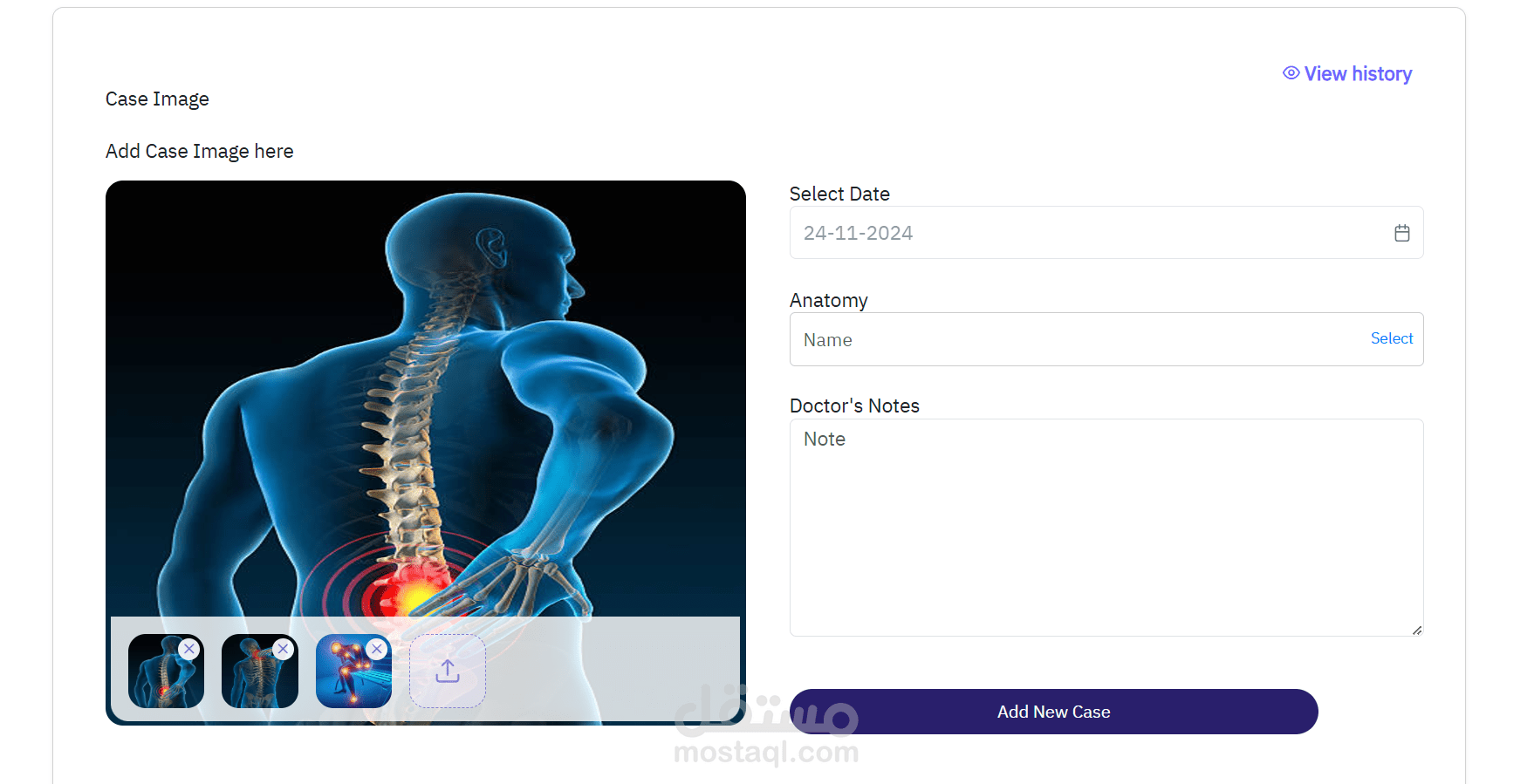 تطوير موقع ويب يسمح برفع الحالات الطبية (Upload Case) مع إضافة صور للحالة الطبية، حيث يتم تحميل الحالات مع التفاصيل مثل التاريخ الطبي والملاحظات. يتيح الموقع للمستخدمين البحث في سجل الحالات الطبية وتصفية النتائج بسهولة. كما يتم تضمين واجهة مستخدم مرنة تمكن من عرض الصور والتفاصيل ذات الصلة بكل حالة، مع إمكانية الوصول إلى تاريخ الحالات الطبية السابقة لمراجعتها.