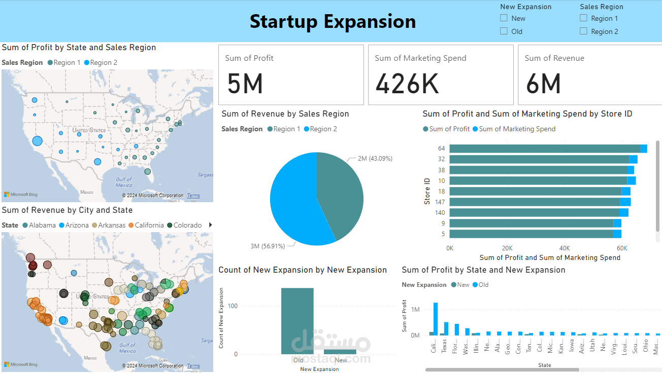 - تصميم لوحة تحكم تحتوي على محددات (Slicers) لفلترة البيانات حسب التوسّع الجديد أو القديم.