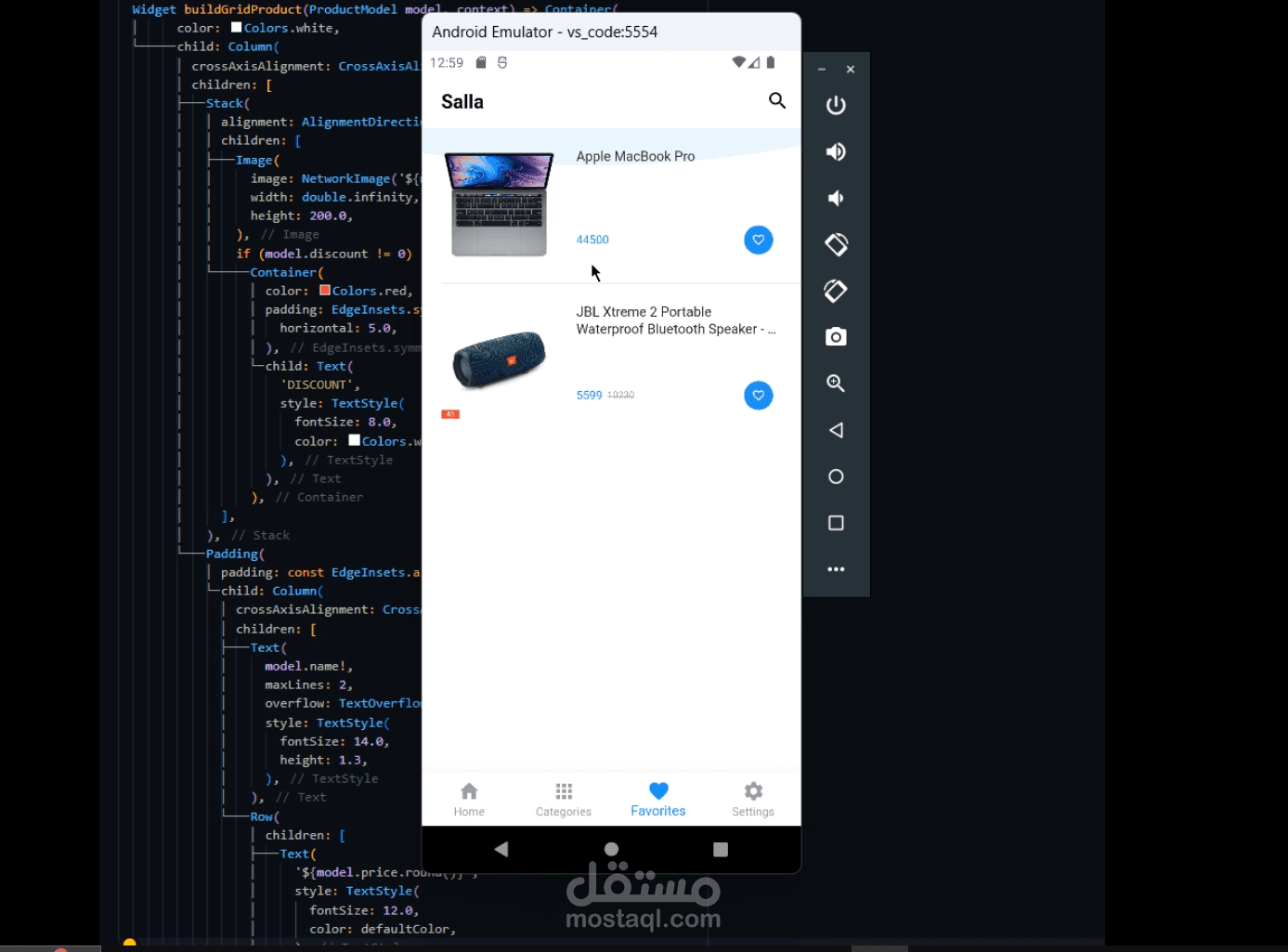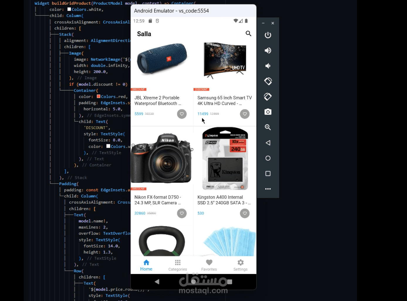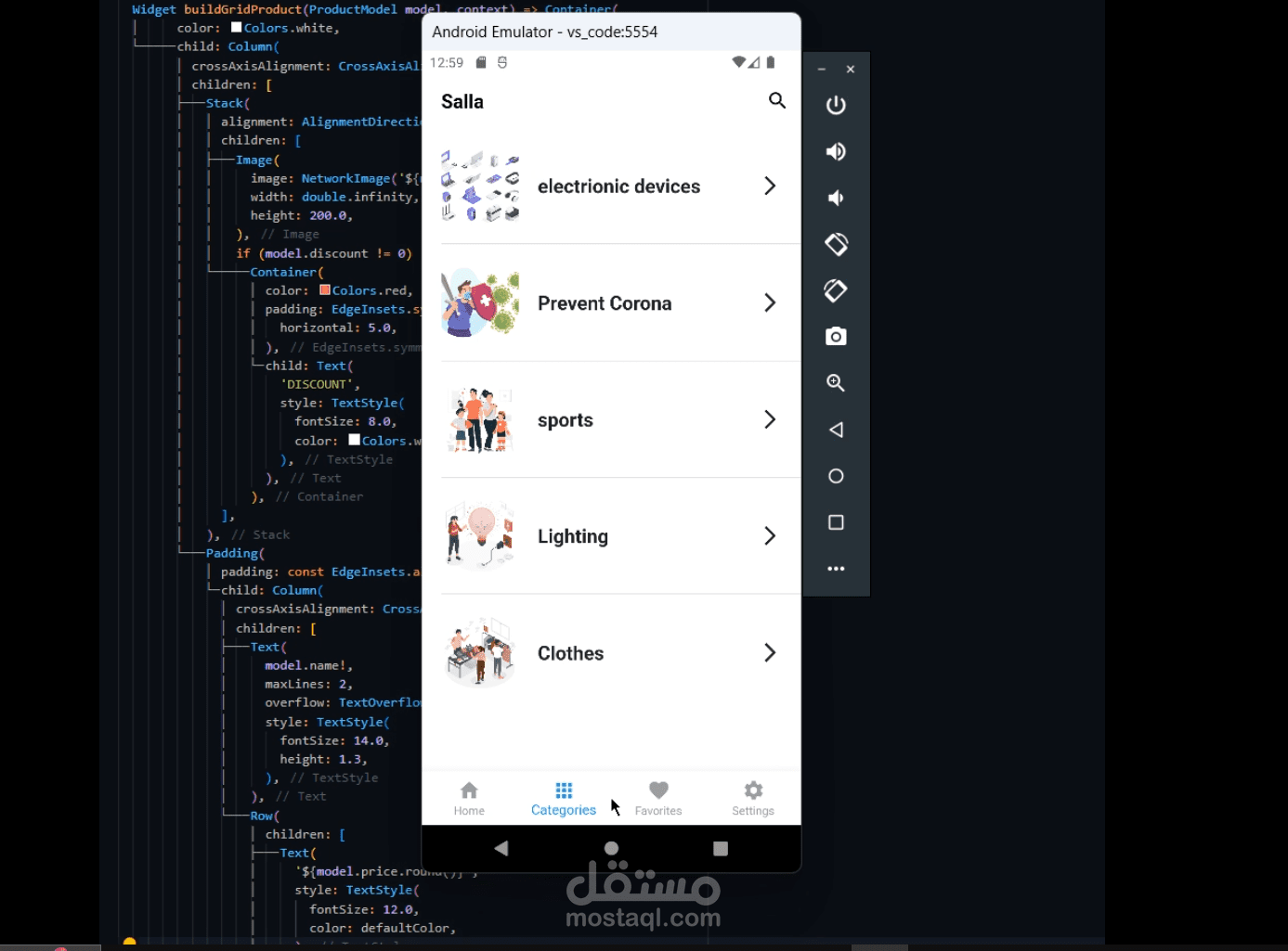 قائمة سفلية للتنقل بين الصفحات (Home, Categories, Favorites, Settings).