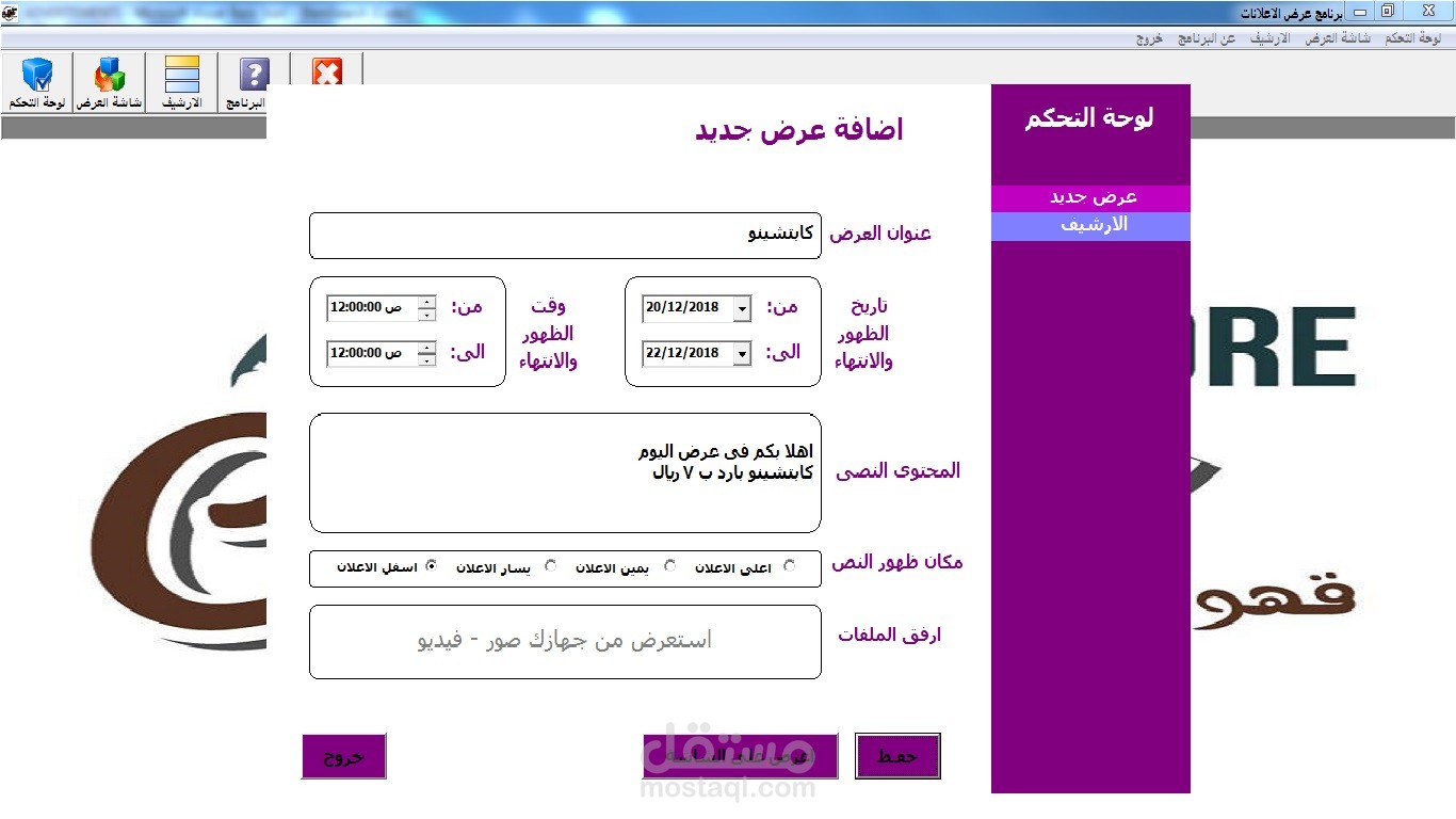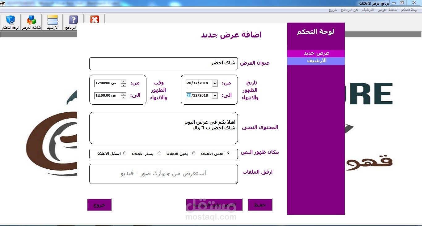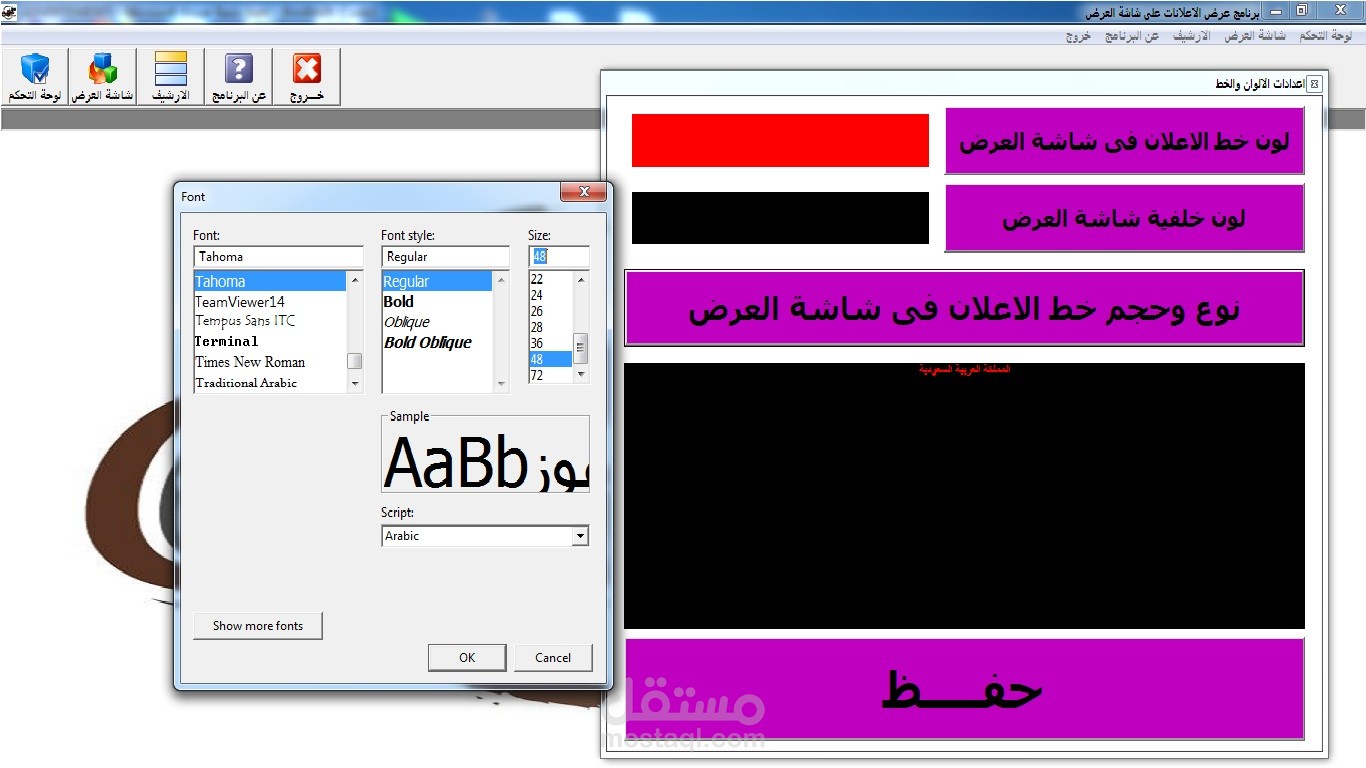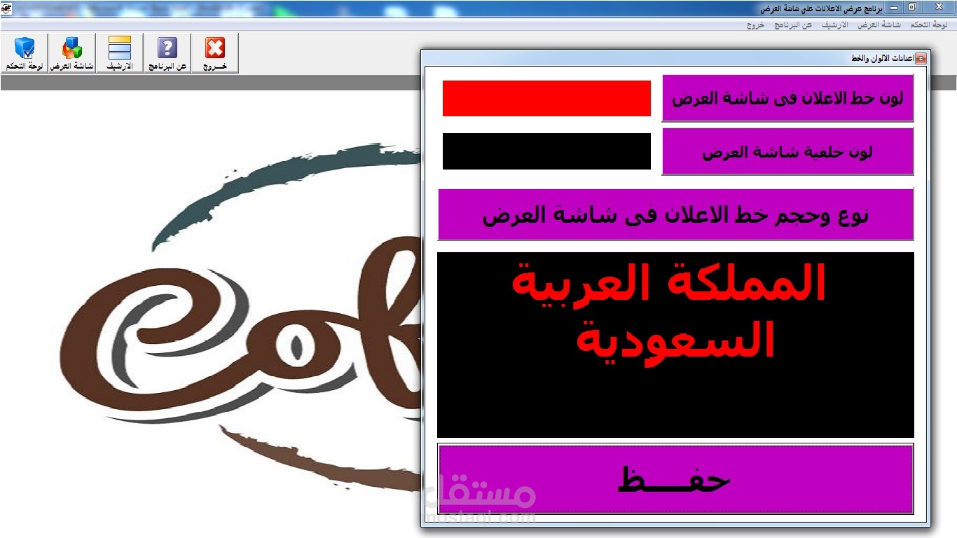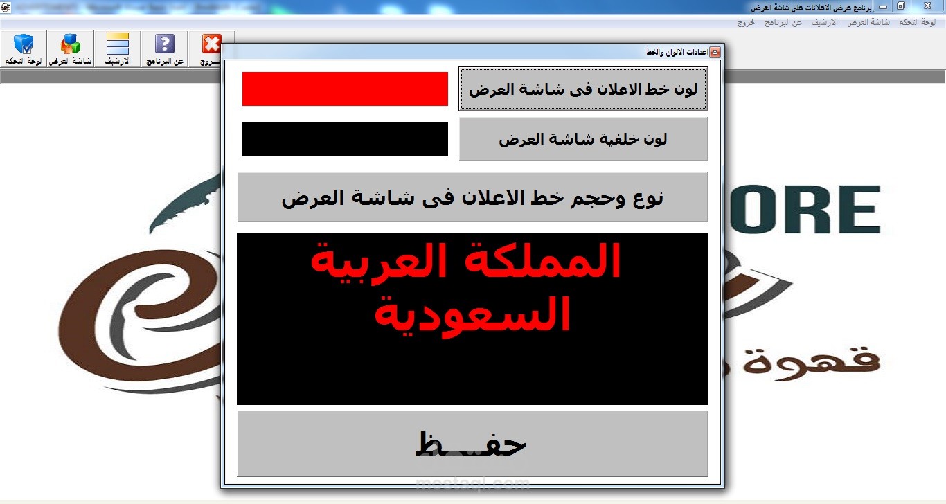 وكذلك يمكن التحكم فى اعدادات عرض الاعلان (ظبط لون خد محتوى الاعلان - تغيير خلفية شاشة العرض - نوع وحجم الخط لمجتوى الاعلان).