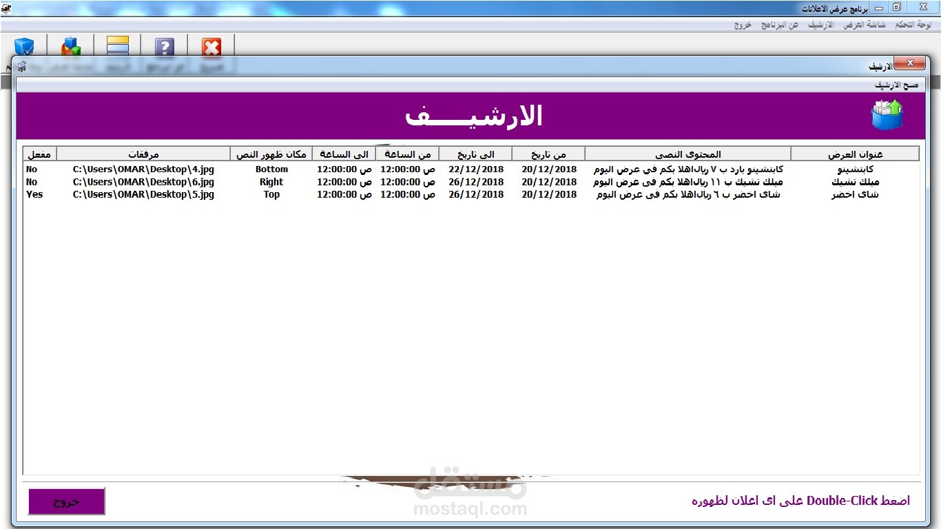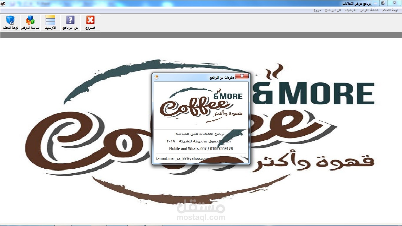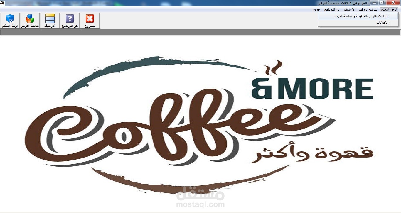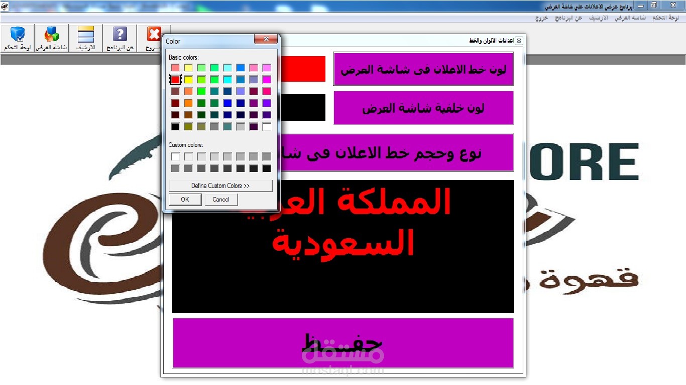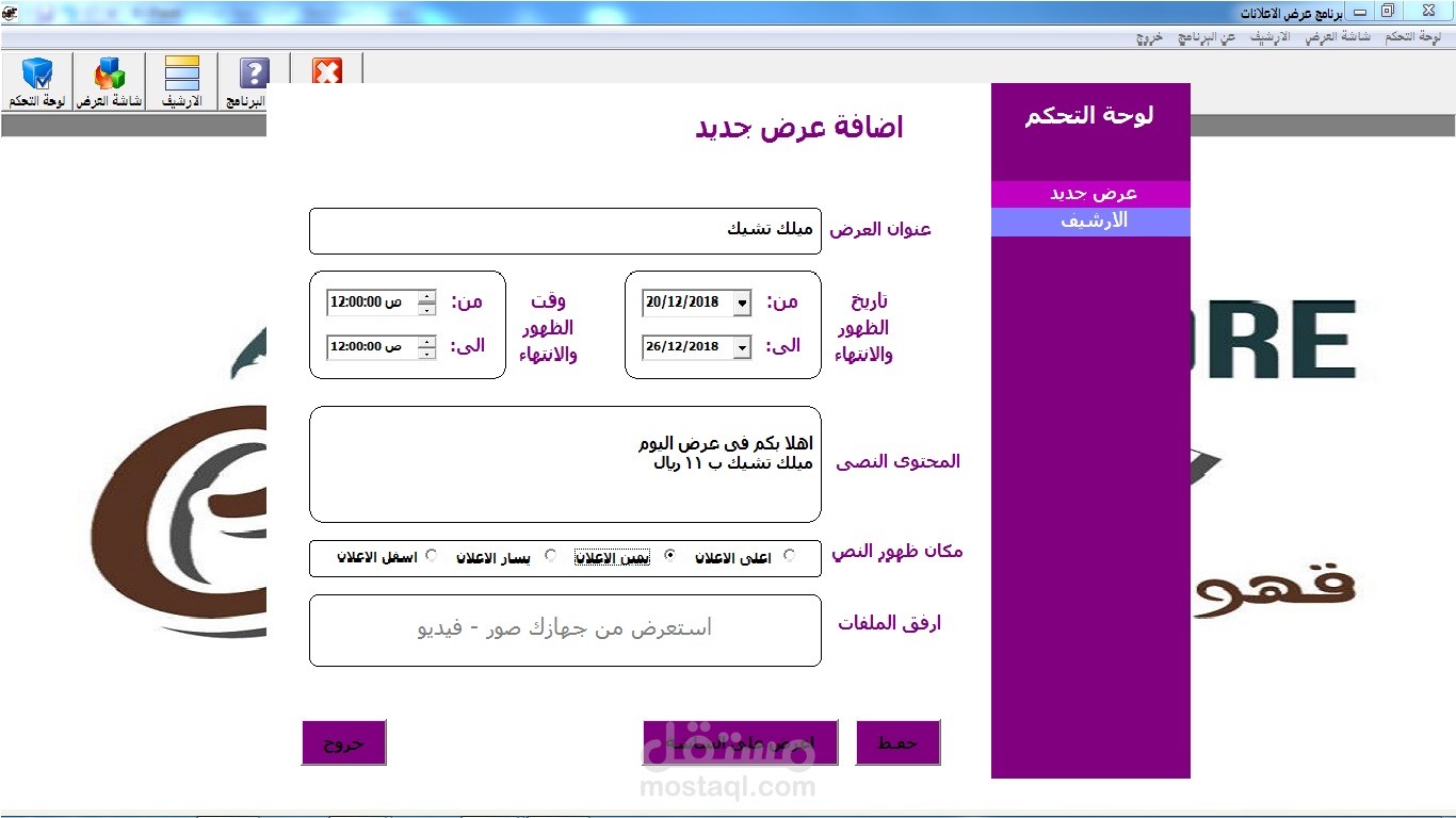 وكذلك يمكن التحكم فى اعدادات عرض الاعلان (ظبط لون خد محتوى الاعلان - تغيير خلفية شاشة العرض - نوع وحجم الخط لمجتوى الاعلان).
