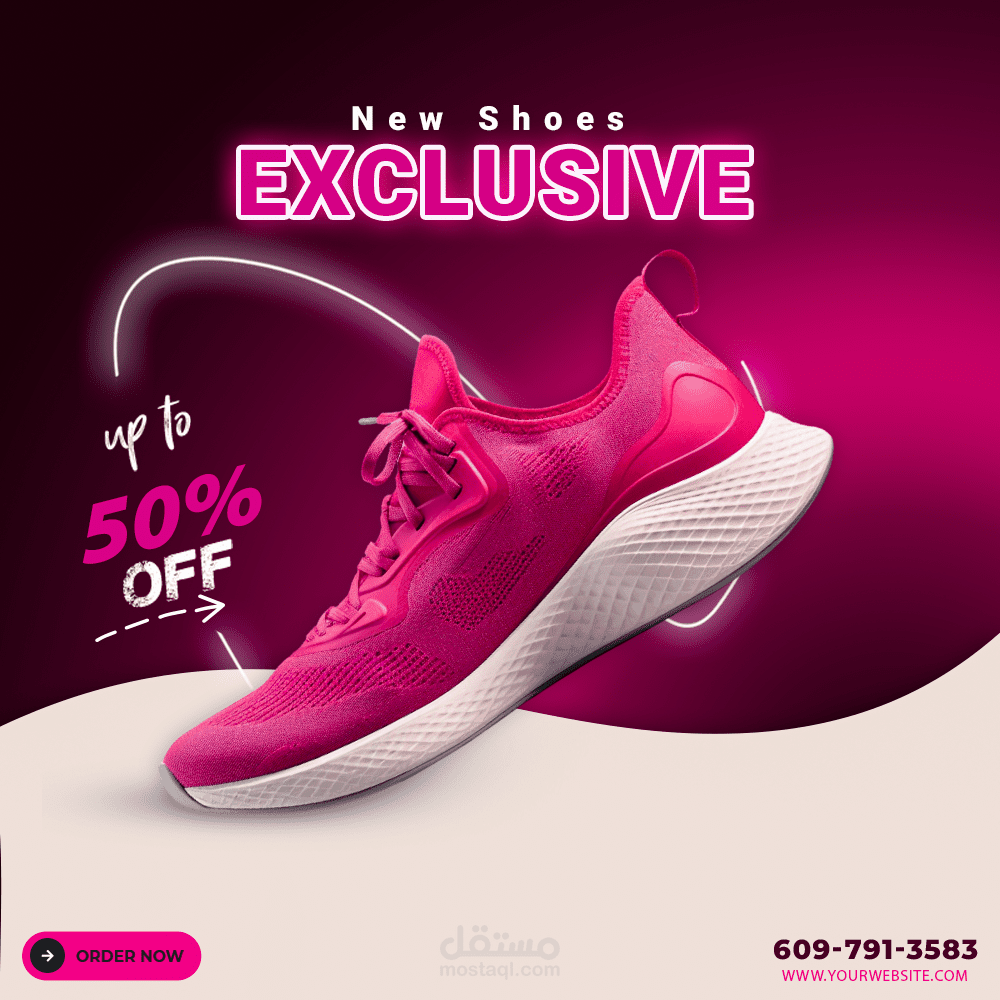 "هذا تصميم إعلان احترافي للأحذية تم تنفيذه بأسلوب حديث وديناميكي لإبراز المنتج بشكل جذاب ومميز. يعتمد التصميم على تخطيط أنيق وألوان زاهية ونصوص بارزة لجذب الانتباه وإبراز قيمة المنتج.