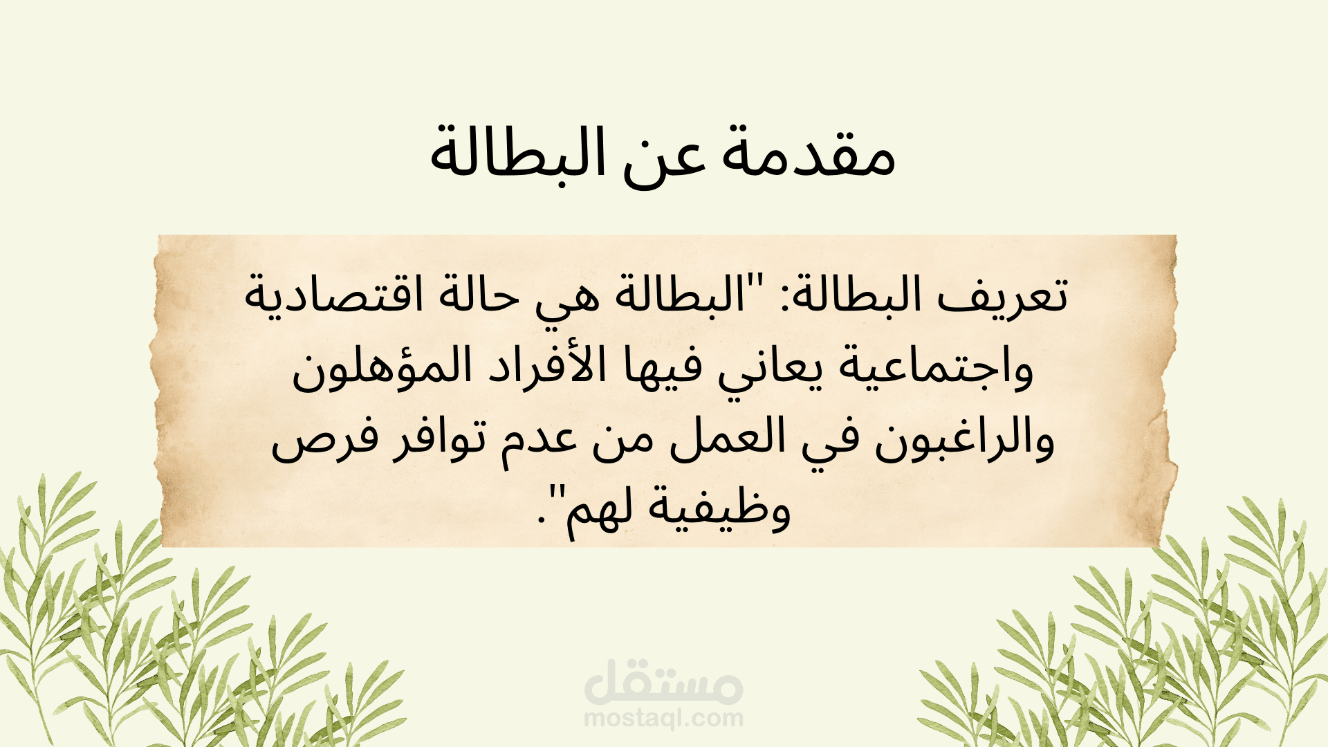 تُعد البطالة واحدة من أبرز التحديات الاقتصادية والاجتماعية التي تواجه المجتمعات في العصر الحديث. يعكس هذا البحث أهمية دراسة البطالة كونها قضية تمس حياة الأفراد وأداء الاقتصاد الوطني. سنتناول في هذا البحث تعريف البطالة، تصنيفاتها المختلفة، أسبابها، الآثار المترتبة عليها، وأبرز الحلول المقترحة لمعالجتها.