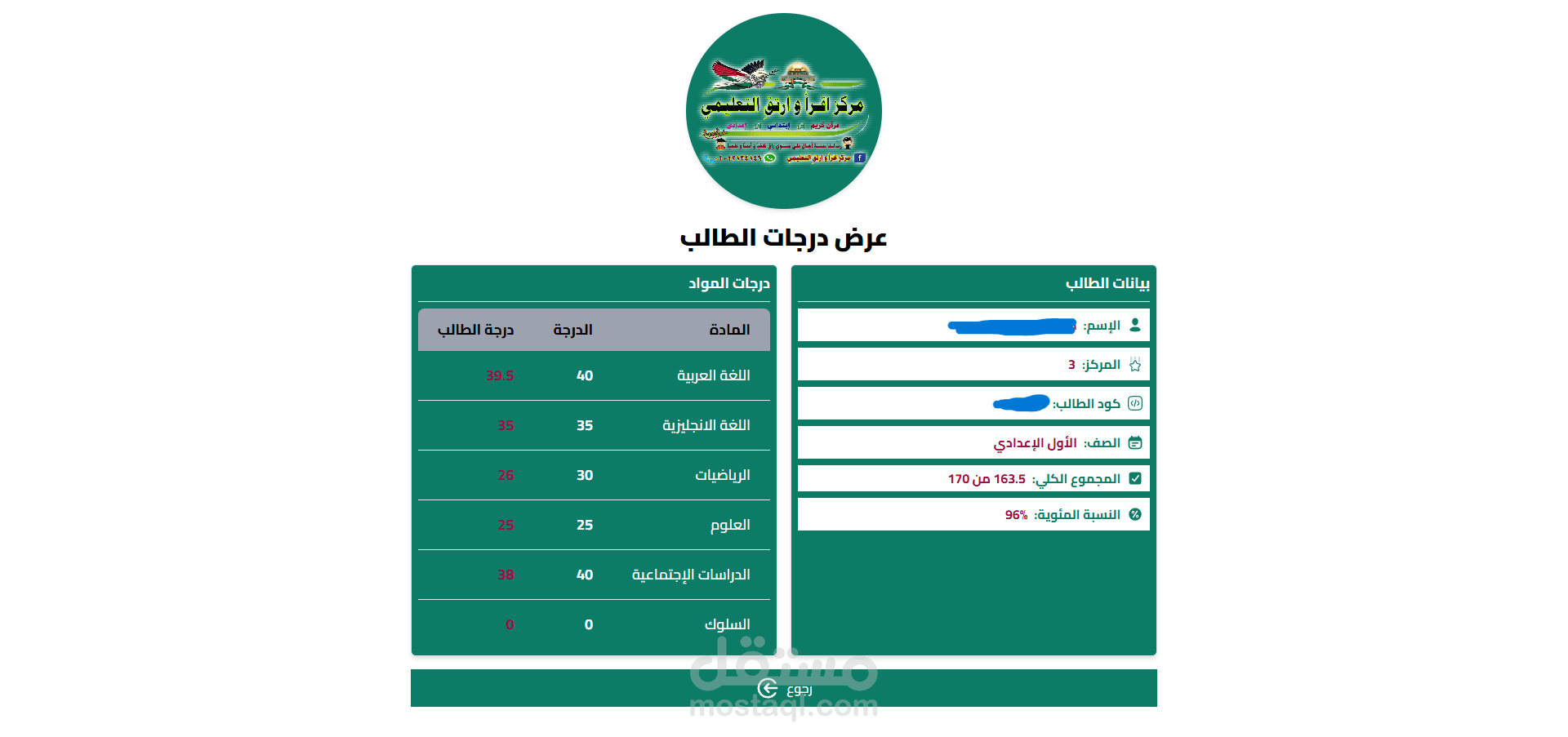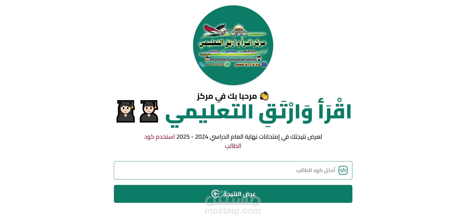 • نتيجة تطبيق متكامل مصمم للمراكز التعليمية لنشر وإدارة نتائج امتحانات الطلاب بكفاءة. تستخدم المنصة ملف xlsx.js لاستيراد ملفات الدرجات بسلاسة وتخزينها في قاعدة بيانات، مما يُسهّل على الطلاب والمسؤولين الوصول إلى النتائج.
