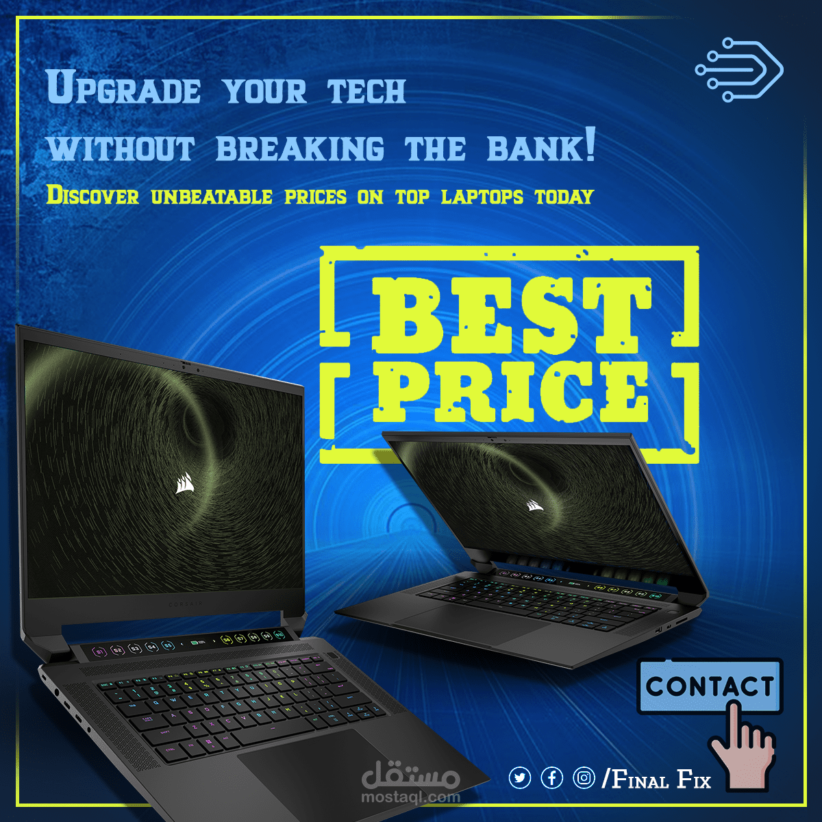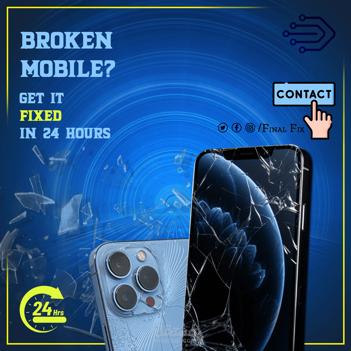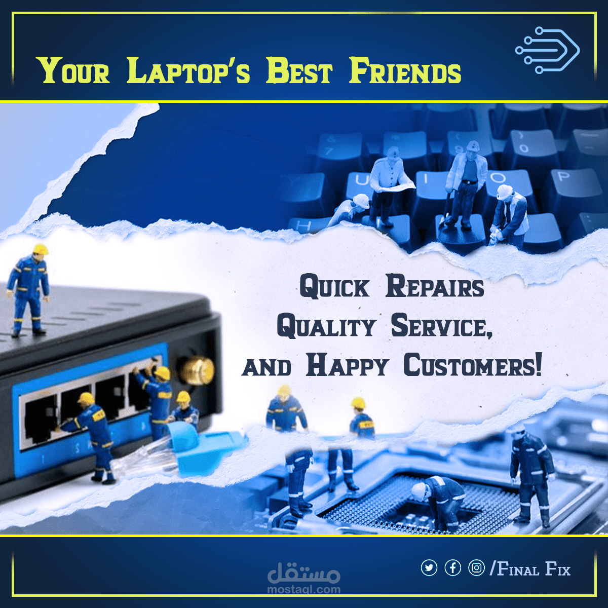 قمت بتصميم مجموعة من الإعلانات الجذابة لمتجر إصلاح الأجهزة الإلكترونية باستخدام لوحة ألوان زرقاء تعكس الثقة والمهنية، مع لمسات من اللون الأصفر لتسليط الضوء على التفاصيل المهمة. التصميم بسيط وعصري، مما يضمن بروز المعلومات الأساسية. يعكس التصميم خبرة المتجر، موثوقيته، وحيويته، مما يجعله مثاليًا لجذب العملاء وبناء الثقة من النظرة الأولى.