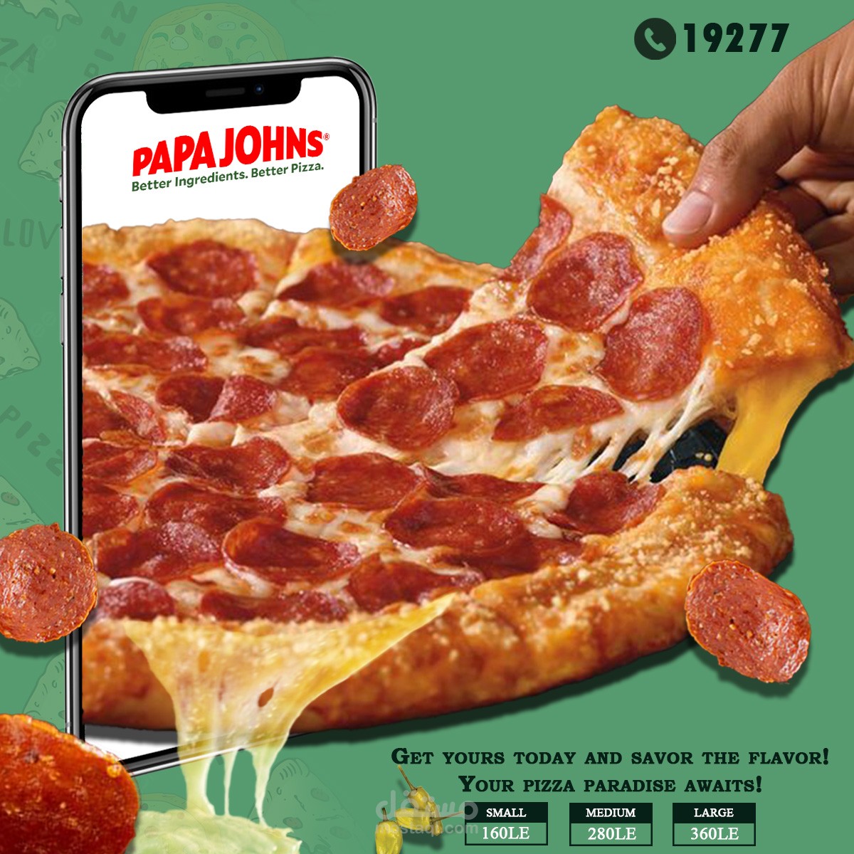 قمت بتصميم إعلان مبتكر لبيتزا بابا جونز يظهر يدًا تمسك شريحة بيتزا من شاشة الهاتف المحمول، مما يعكس سهولة الوصول إلى البيتزا اللذيذة عبر الاتصال بالخط الساخن. تم استخدام اللونين الأحمر والأخضر المستمدين من شعار بابا جونز لإضفاء الطابع الرسمي والمميز للعلامة التجارية، مع تصميم جذاب يسلط الضوء على فكرة الاتصال السريع بالخط الساخن لطلب البيتزا. يهدف الإعلان إلى جذب انتباه العملاء وتحفيزهم على الاتصال للحصول على وجبتهم المفضلة فورًا.