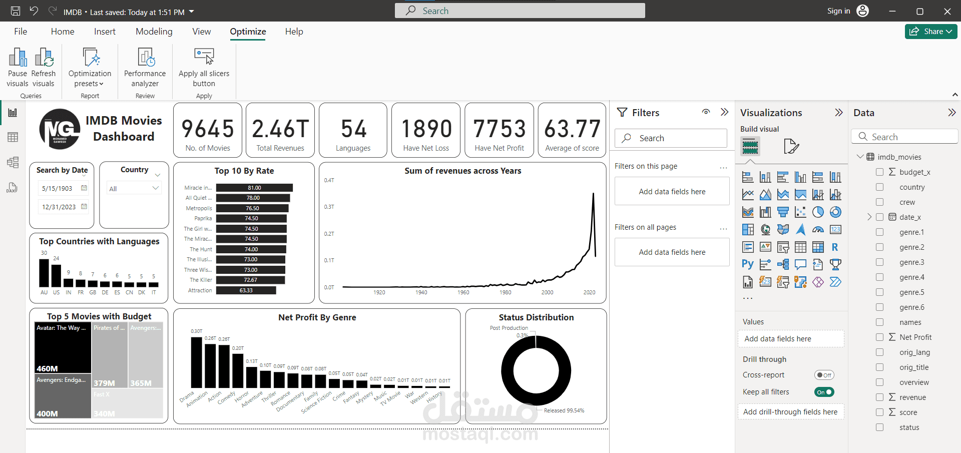 تحليل للافلام والمسلسلات علي منصة IMDB لمعرفة اعلي الاعمال تقييما واكثرهم تحقيقا للأرباح وما الي ذلك, قمت بتنظيف البيانات ومعالجتها واضافة بعض الأعمدة باستخدام Power Query.