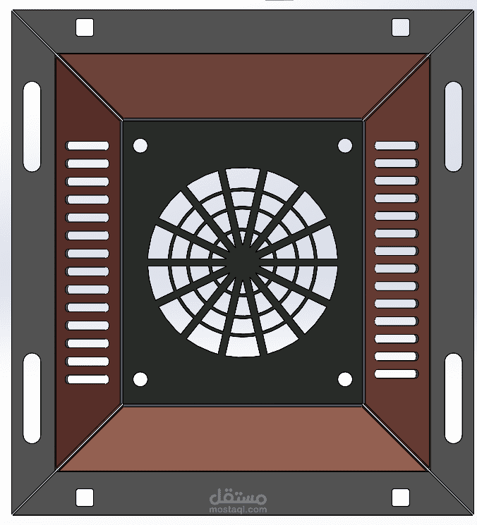 تم تصميم هذا الغطاء باستخدام SolidWorks ليكون جزءًا من نظام تهوية أو حماية لمكونات داخلية، مثل الأجهزة الإلكترونية أو الميكانيكية. يتميز التصميم بما يلي:
