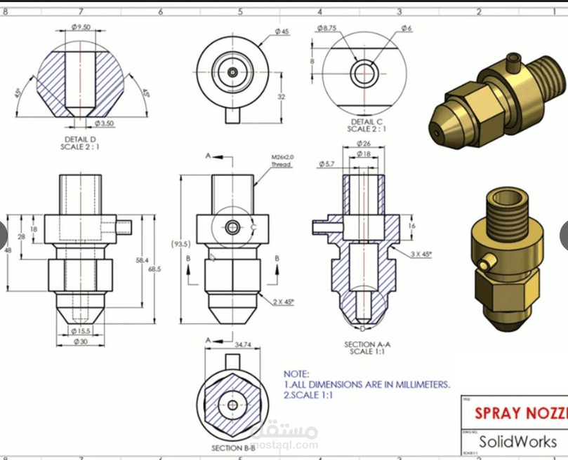 تم تصميم Spray Nozzle باستخدام برنامج SolidWorks لتوفير أداء عالي الكفاءة في تطبيقات الرش المختلفة. يهدف التصميم إلى تحقيق توزيع متساوٍ ودقيق للسائل مع تحسين كفاءة الاستهلاك.