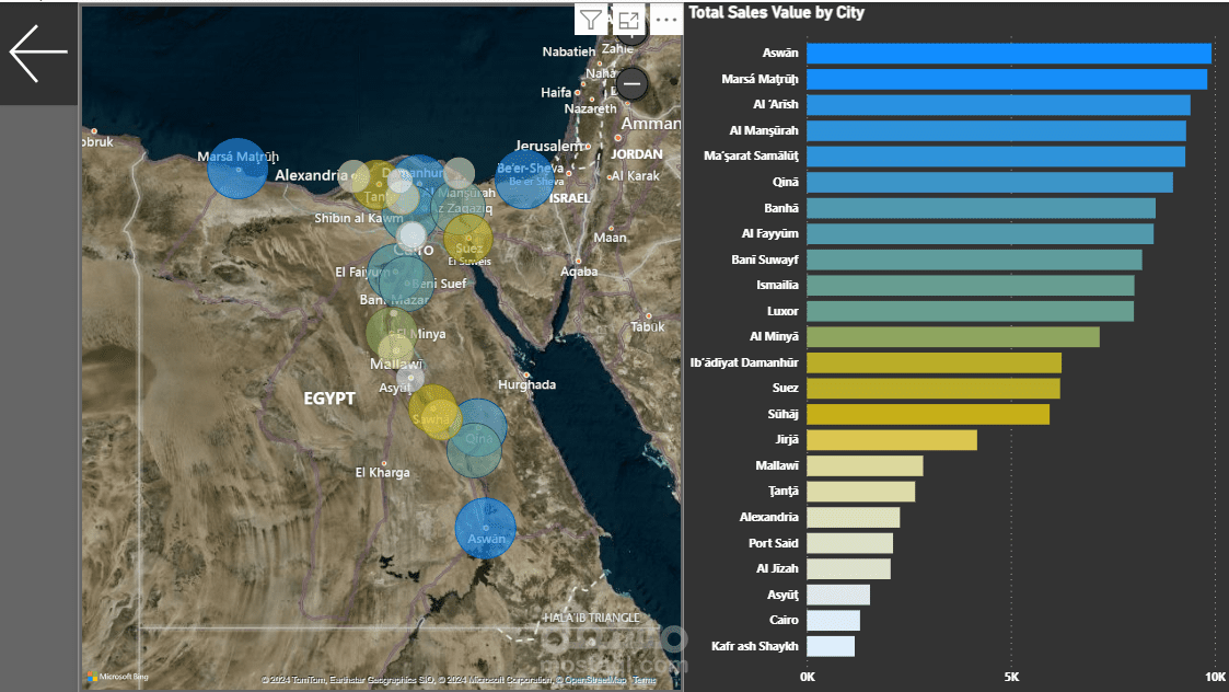 The second visualization provides a focused view of sales distribution across Egyptian cities, revealing top-performing locations such as Aswan and Marsá Maṭrūḥ.