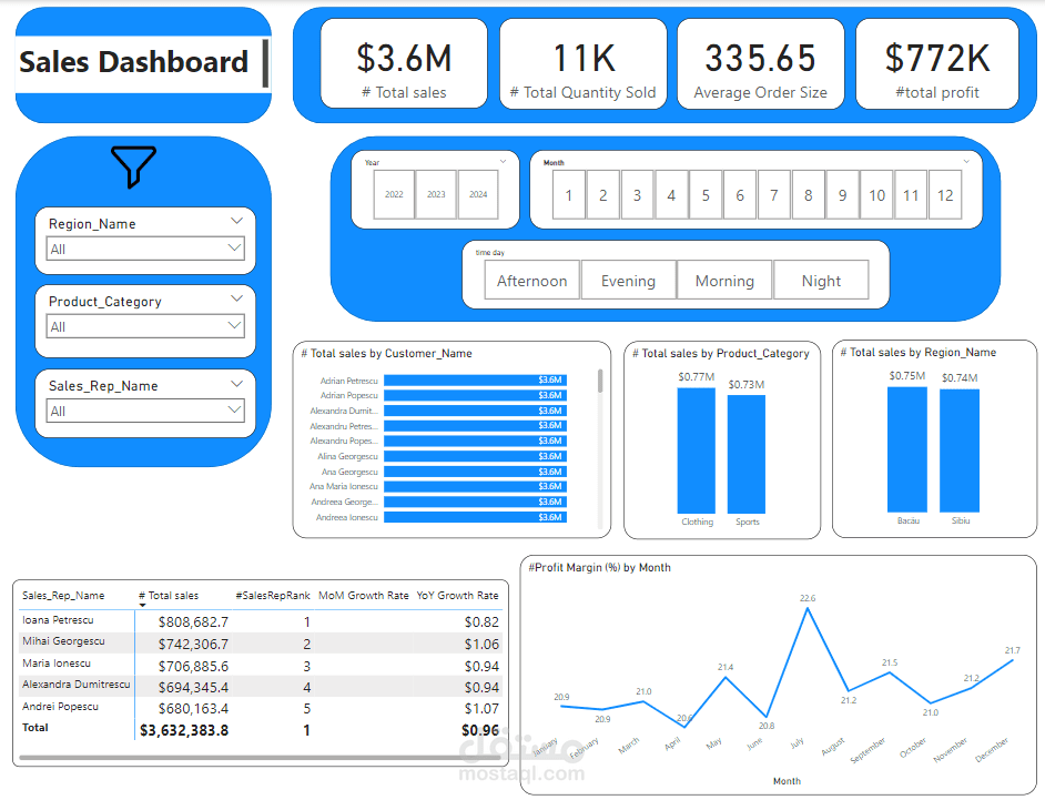 تصميم وتطوير لوحة معلومات متكاملة لمراقبة وتحليل بيانات المبيعات لوكالة تسويق. تشمل اللوحة مجموعة من المؤشرات الرئيسية (KPIs) التي توفر رؤية واضحة لأداء المبيعات، مثل إجمالي الإيرادات، وتحليل العملاء، وأداء المنتجات، وتوقعات المبيعات المستقبلية.