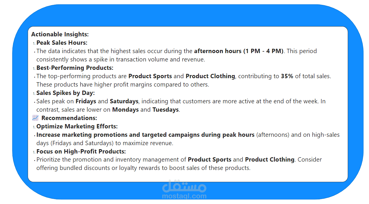 باستخدام Power BI لإنشاء تصورات تفاعلية تتيح للمستخدمين استكشاف البيانات بسهولة واتخاذ قرارات مدعومة بالبيانات. يعكس هذا المشروع مهاراتي في تحليل البيانات، تصميم لوحات المعلومات، وتقديم تقارير مرئية فعّالة تدعم نمو الأعمال.
