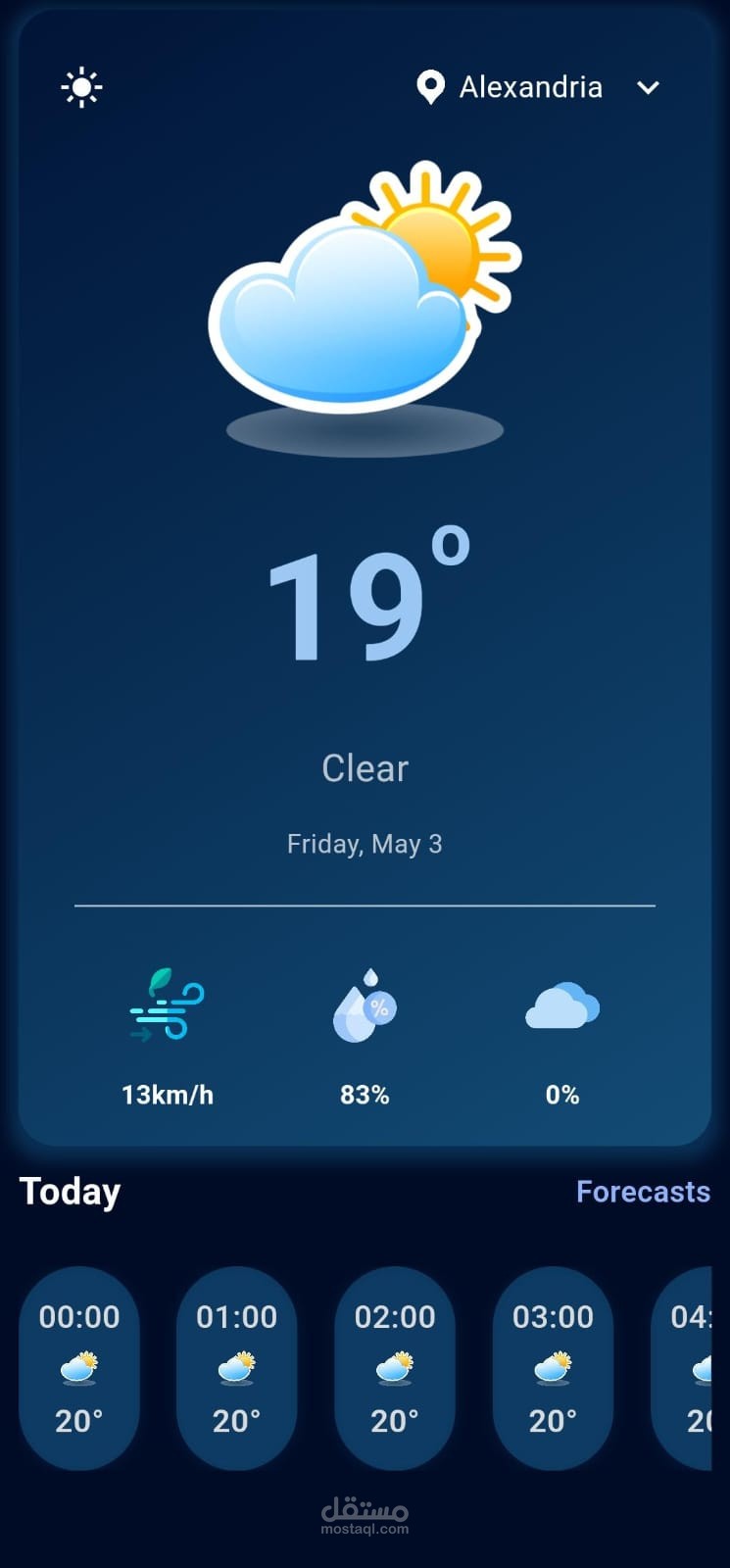 عرض الطقس الحالي: يعرض التطبيق معلومات شاملة عن حالة الطقس، بما في ذلك درجة الحرارة الحالية، حالة السماء، وسرعة الرياح في المدينة المختارة.