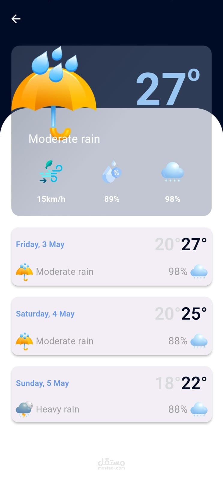 تصميم بسيط وسهل الاستخدام: يتميز التطبيق بواجهة مستخدم بسيطة وخالية من التعقيد لعرض بيانات الطقس بشكل منظم ومباشر.