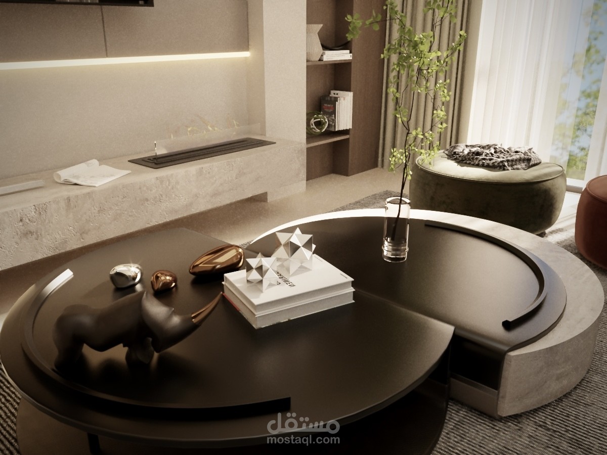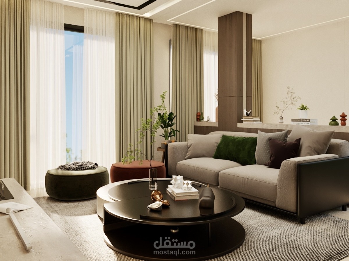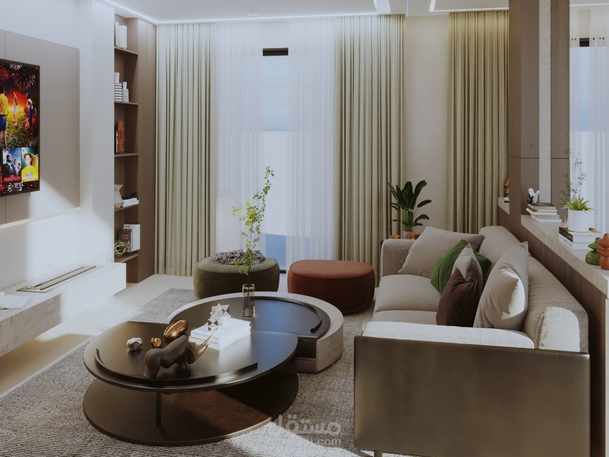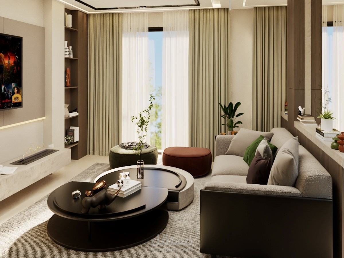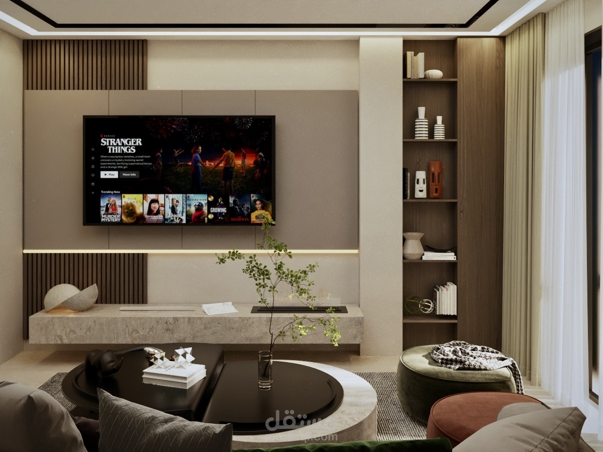 This is a modern and minimalist living room design, emphasizing clean lines, neutral tones, and subtle textures. The focal point of the space is a wall-mounted TV framed by a custom feature wall. The backdrop combines vertical wooden slats on the left and sleek matte panels on the main surface, adding depth and texture without overwhelming the space.