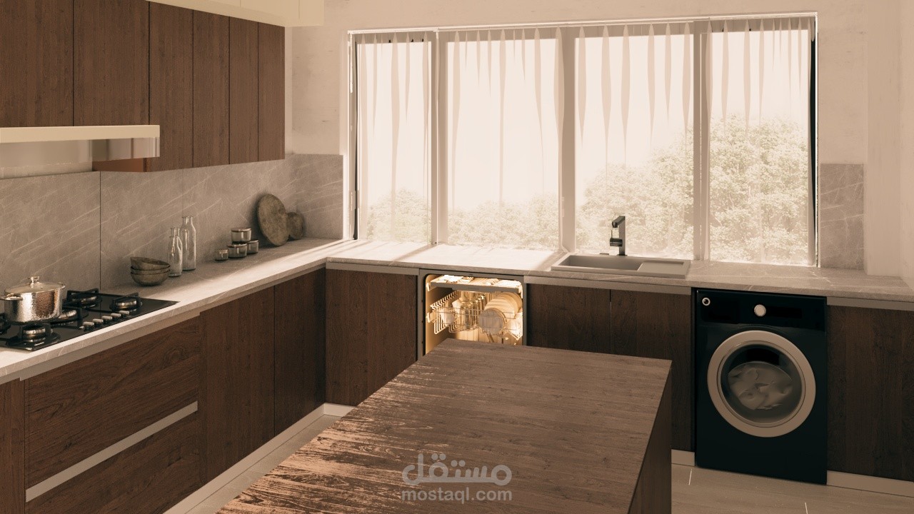 The kitchen designed in a modern style with a touch of warmth, possibly leaning towards a transitional aesthetic. The clean lines and minimalist approach are characteristic of modern design, while the use of natural wood tones adds warmth and a more traditional feel.