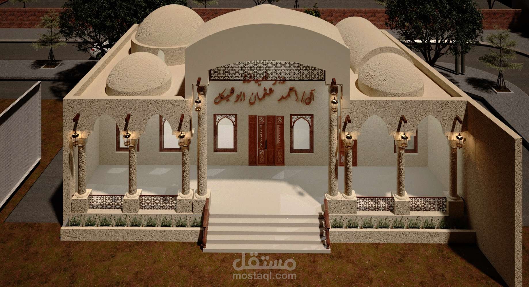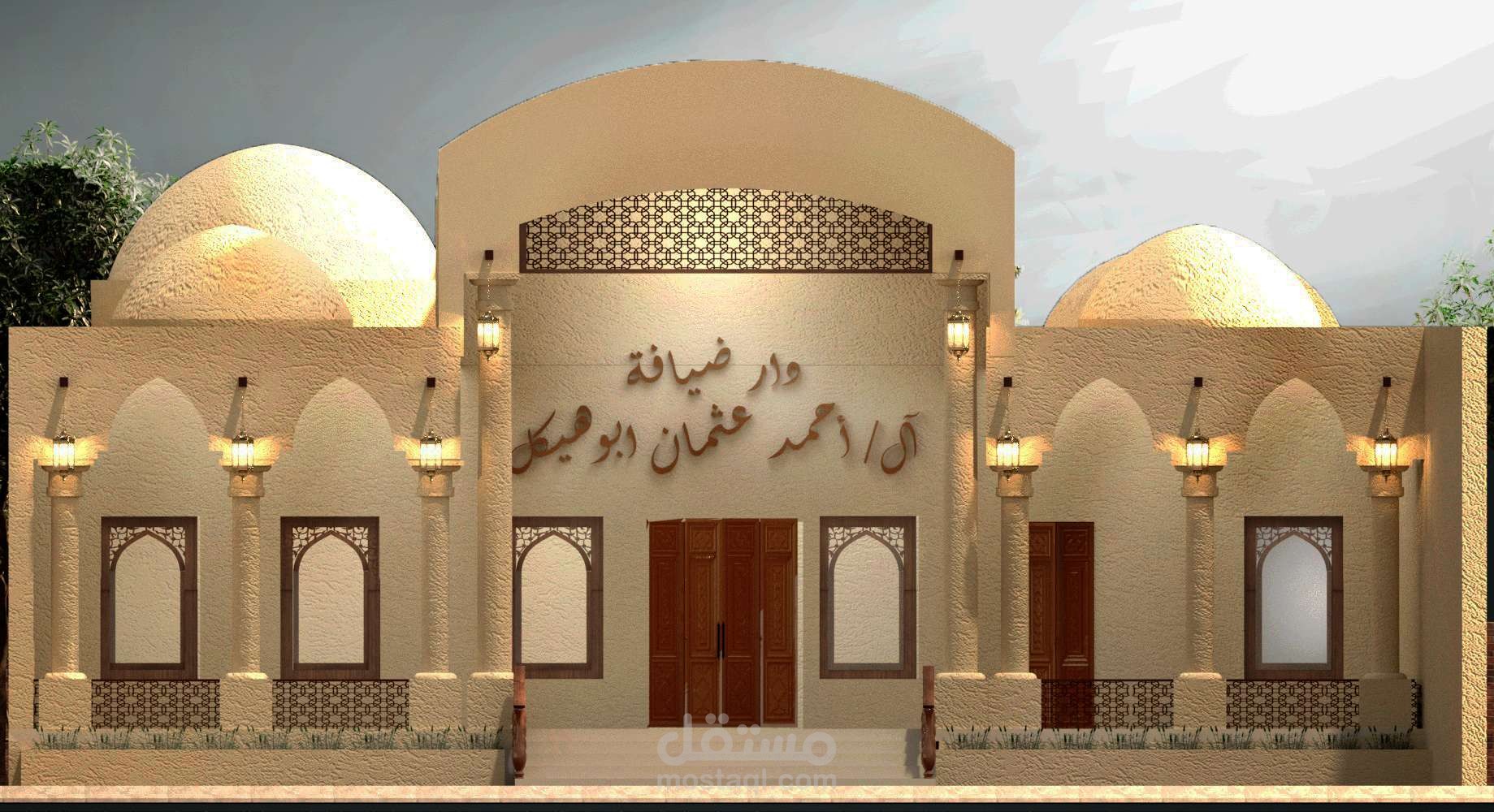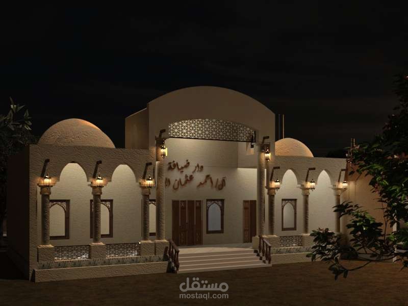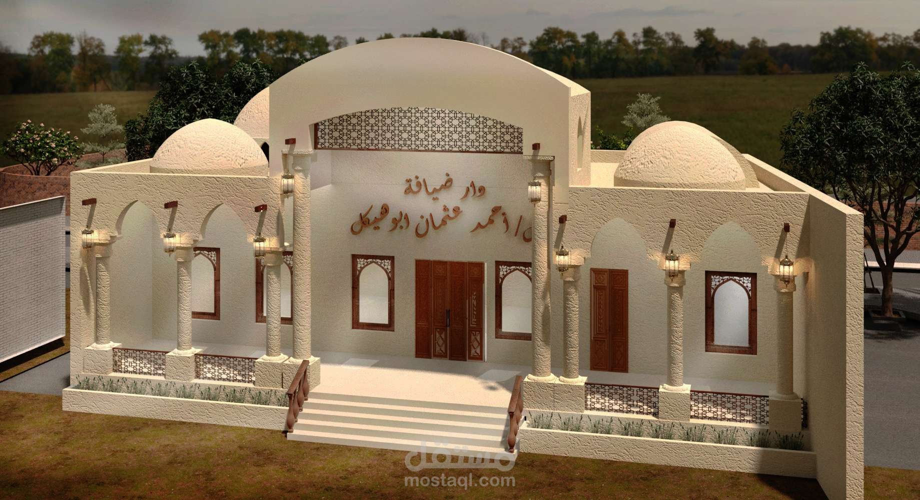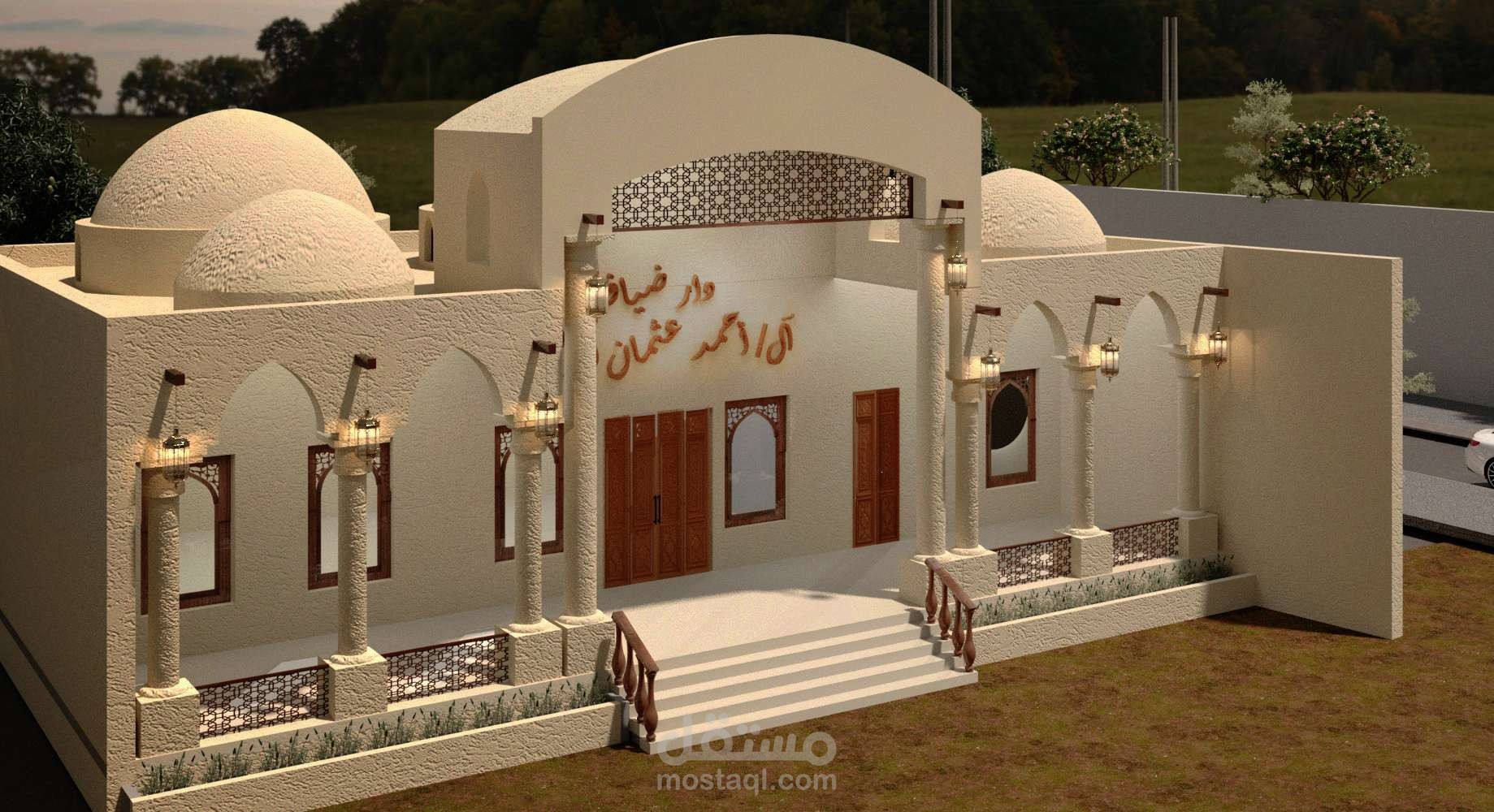 The guest house in Assiut DESINED in a Islamic traditional Egyptian-style building with a beige and brown color scheme. It has a distinct architectural style with domes, arches, and intricate detailing. The building exudes a sense of history and cultural heritage.