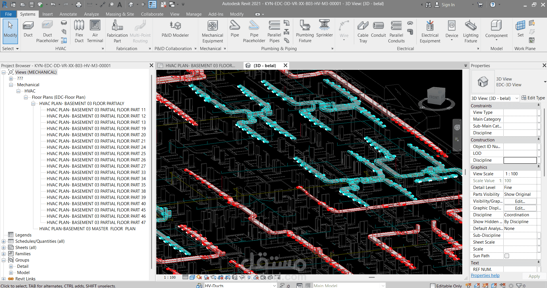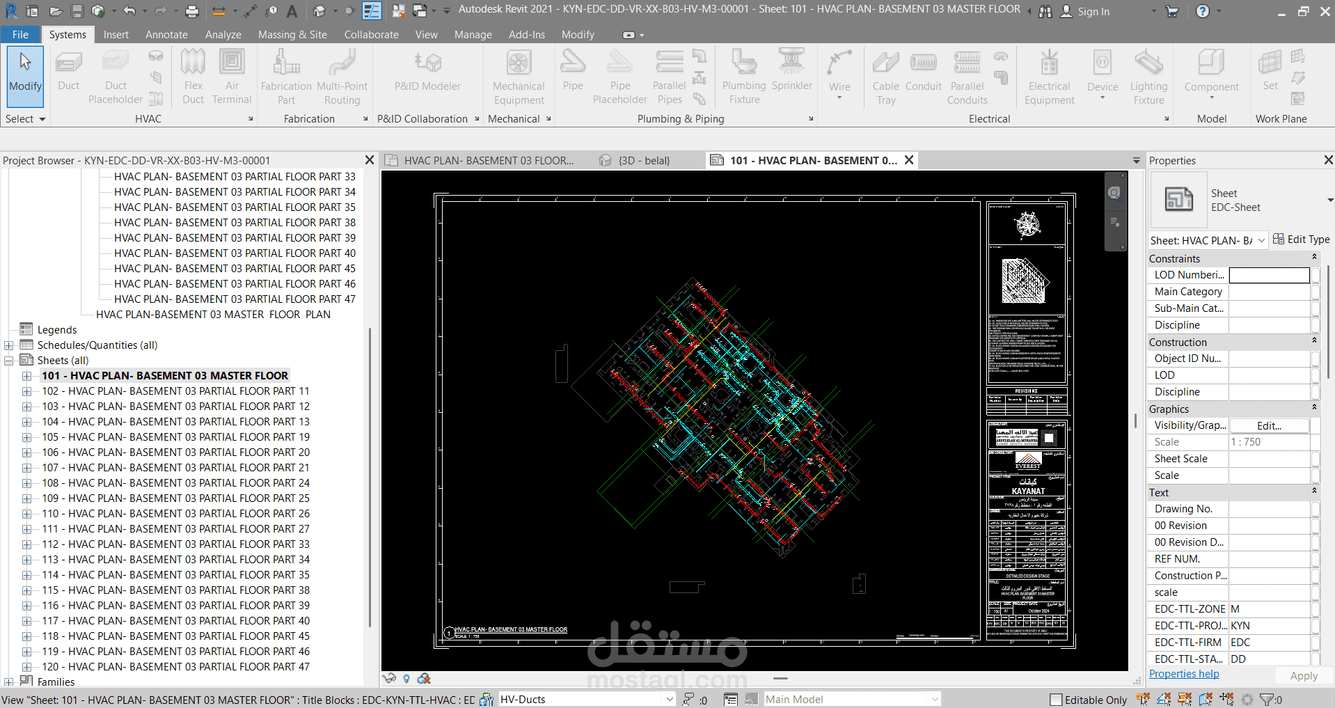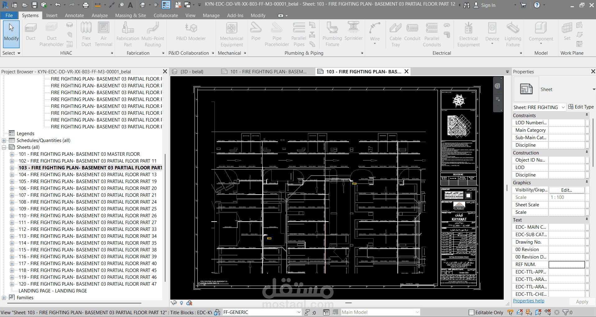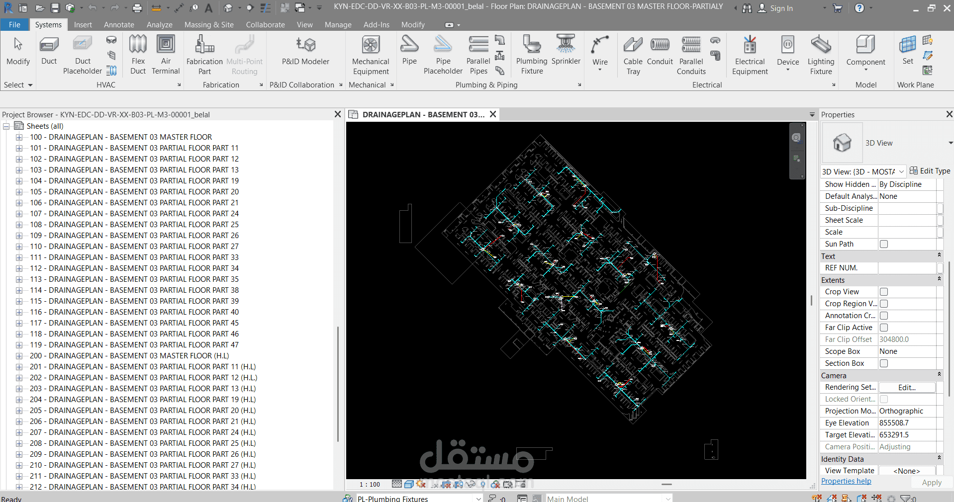 The project involves designing and modeling the HVAC, fire fighting, and plumbing systems for a shared basement level connecting 40 buildings. This basement is one of three underground levels currently under development. The design and modeling were performed using Autodesk Revit, ensuring seamless integration and coordination across all disciplines.