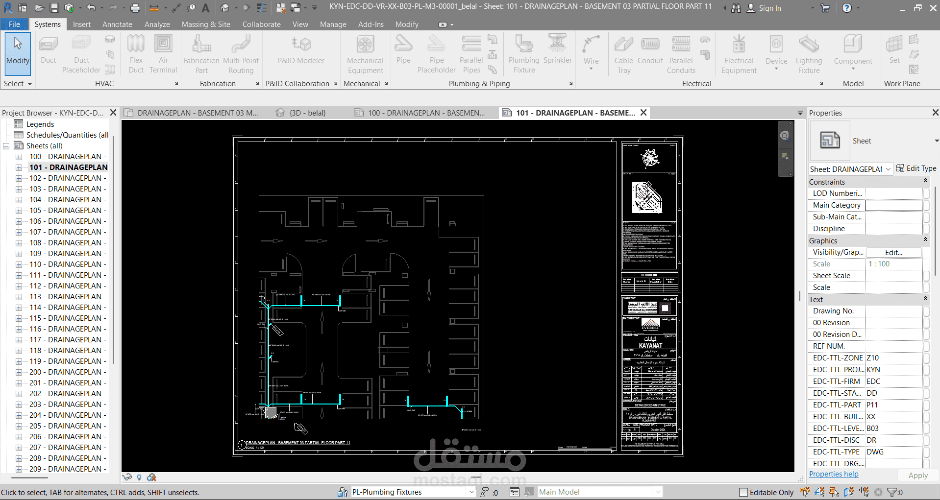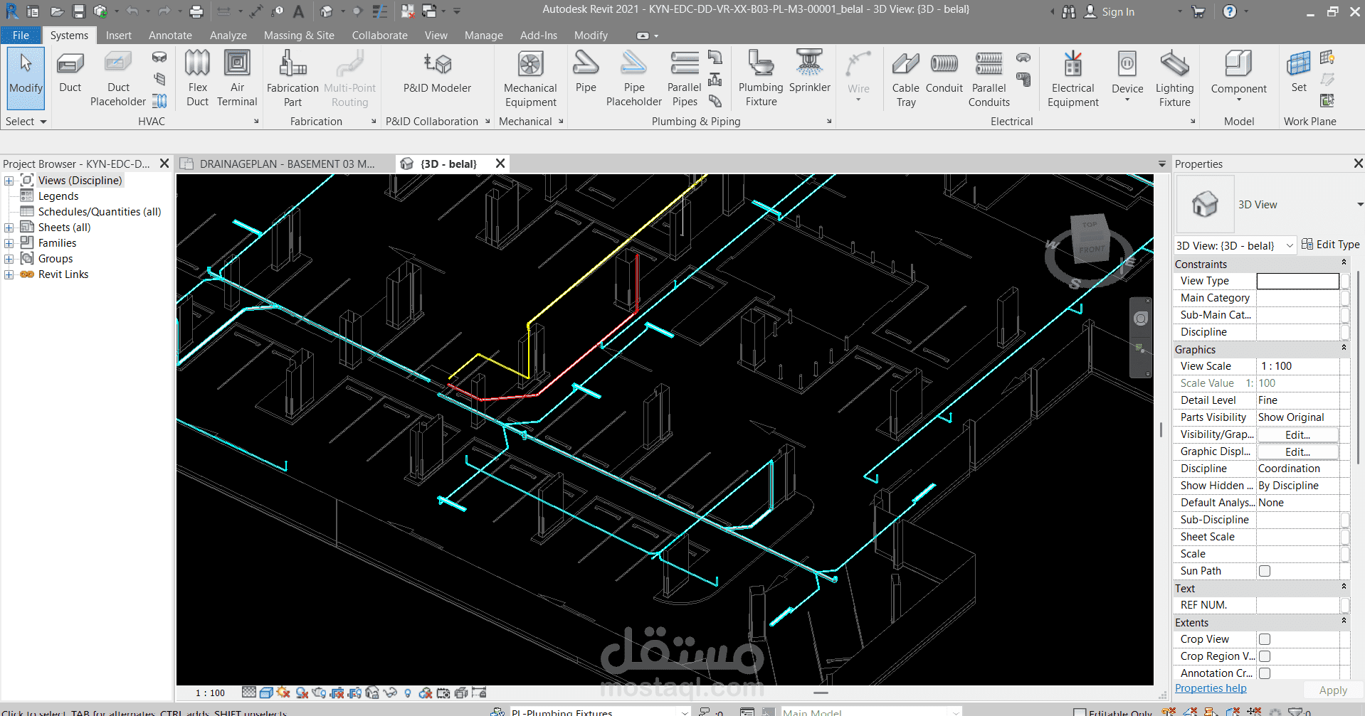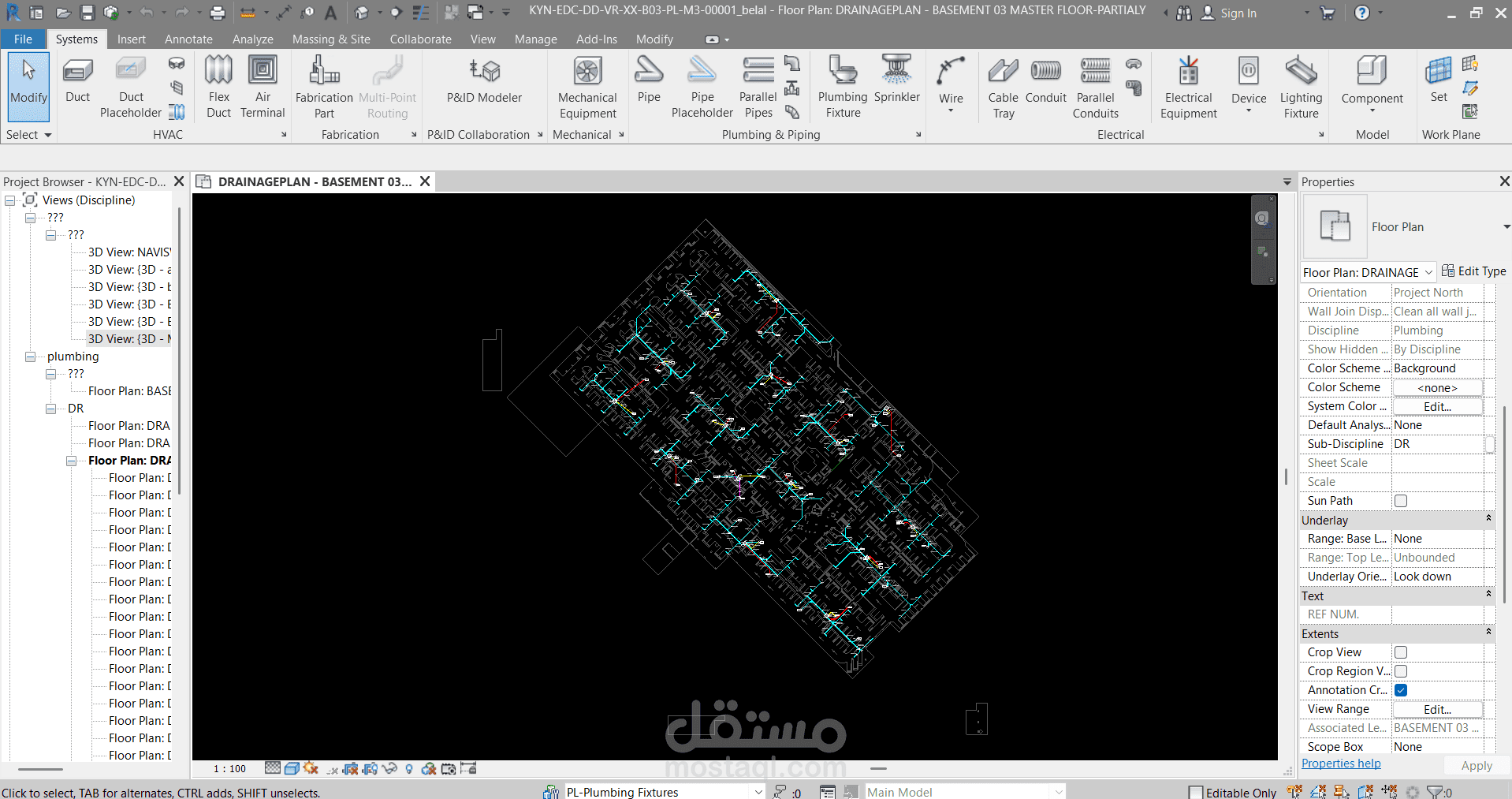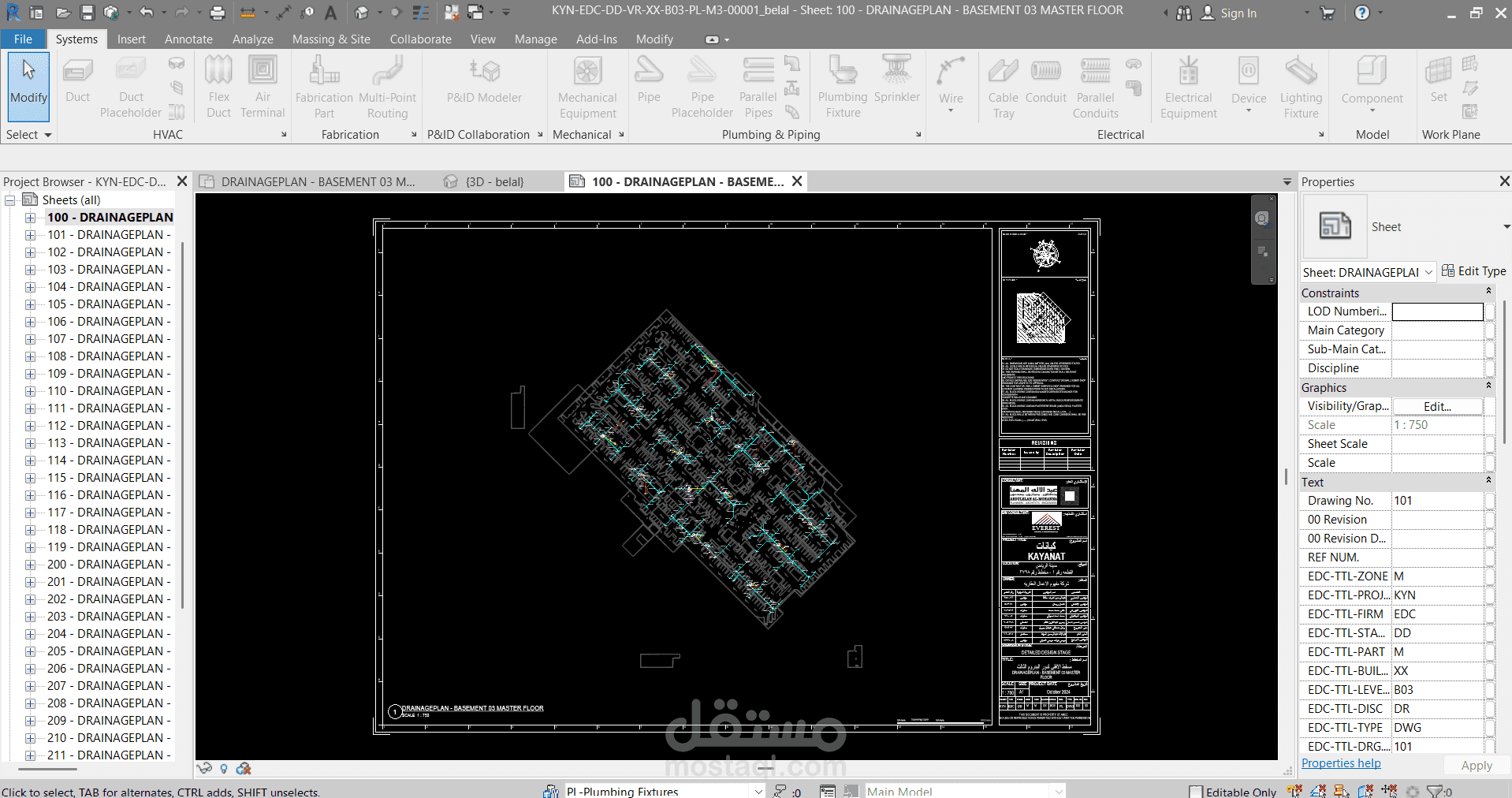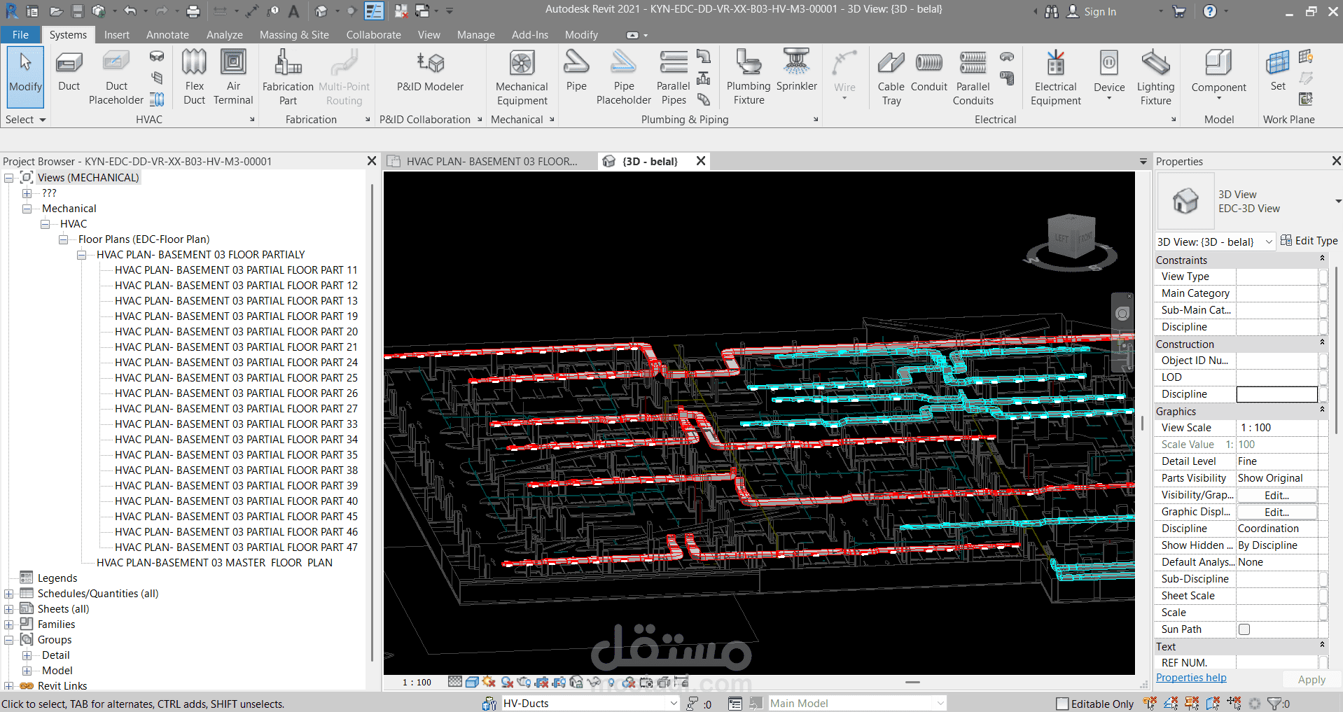 The project involves designing and modeling the HVAC, fire fighting, and plumbing systems for a shared basement level connecting 40 buildings. This basement is one of three underground levels currently under development. The design and modeling were performed using Autodesk Revit, ensuring seamless integration and coordination across all disciplines.