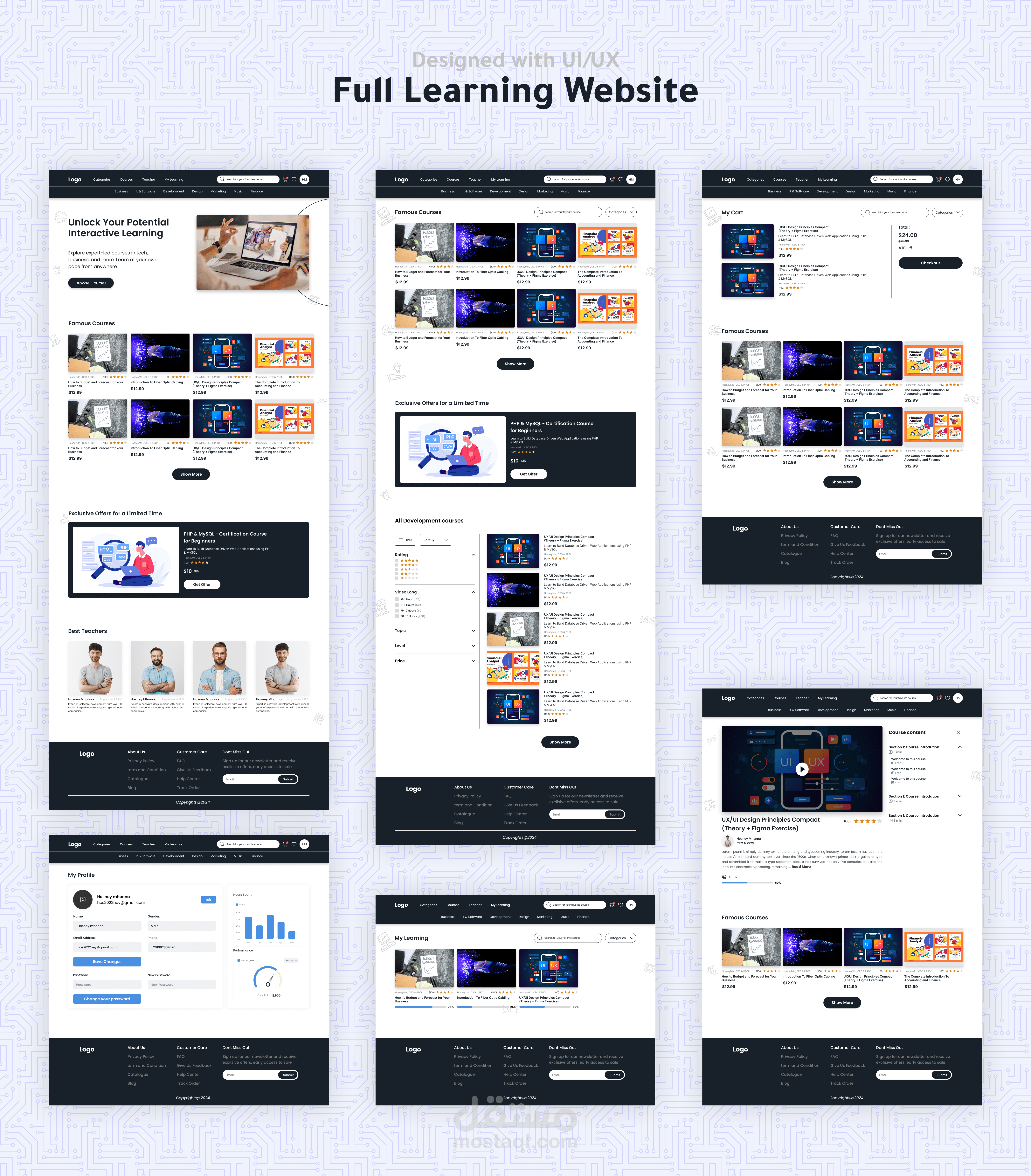 تصميم Full Learning Website يعتمد على مبادئ UI/UX لتوفير تجربة مستخدم متكاملة وسهلة الاستخدام. تم تصميم الواجهات بتركيز على التفاصيل المرئية والتنظيم لتلبية احتياجات المستخدمين، مع استخدام ألوان متناسقة (الأبيض، الأسود، والأزرق الداكن) وتصميم شبكي يضمن سهولة التنقل.