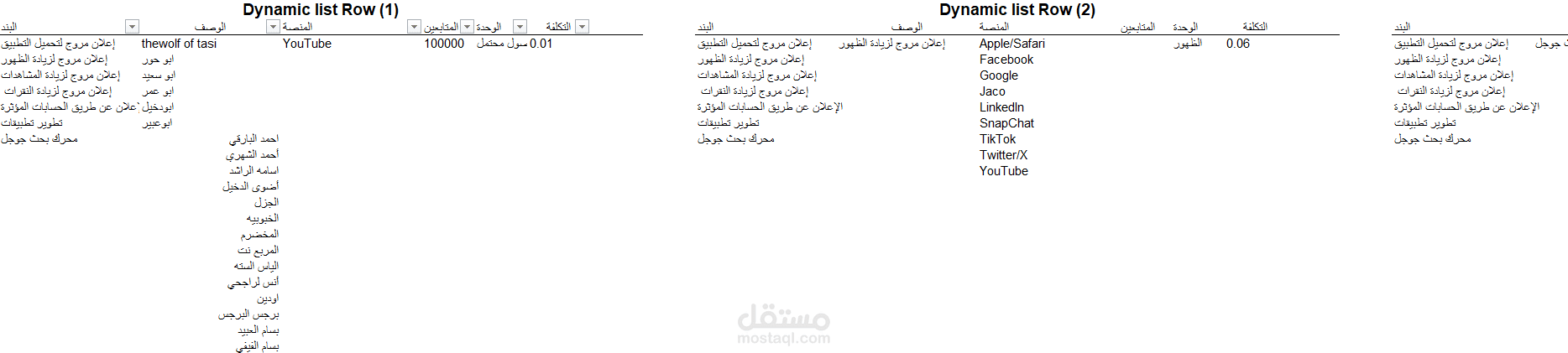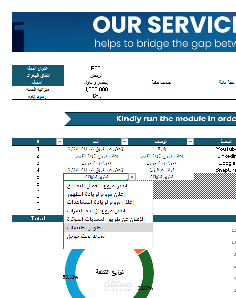 تطوير لوحة تفاعلية و نموذج باستخدام برنامج Microsoft Excel لصالح أحد العملاء. استخدمت صياغة متقدمة (Advanced Formulation) وبرمجة VBA لتصميم اللوحة، والتي تعرض توزيع الميزانية والمقاييس التحليلية المختلفة، مثل توزيع الإنفاق، أداء المنصات المختلفة (YouTube، LinkedIn، Google، وSnapchat)، بالإضافة إلى الرسوم البيانية لتوضيح البيانات
