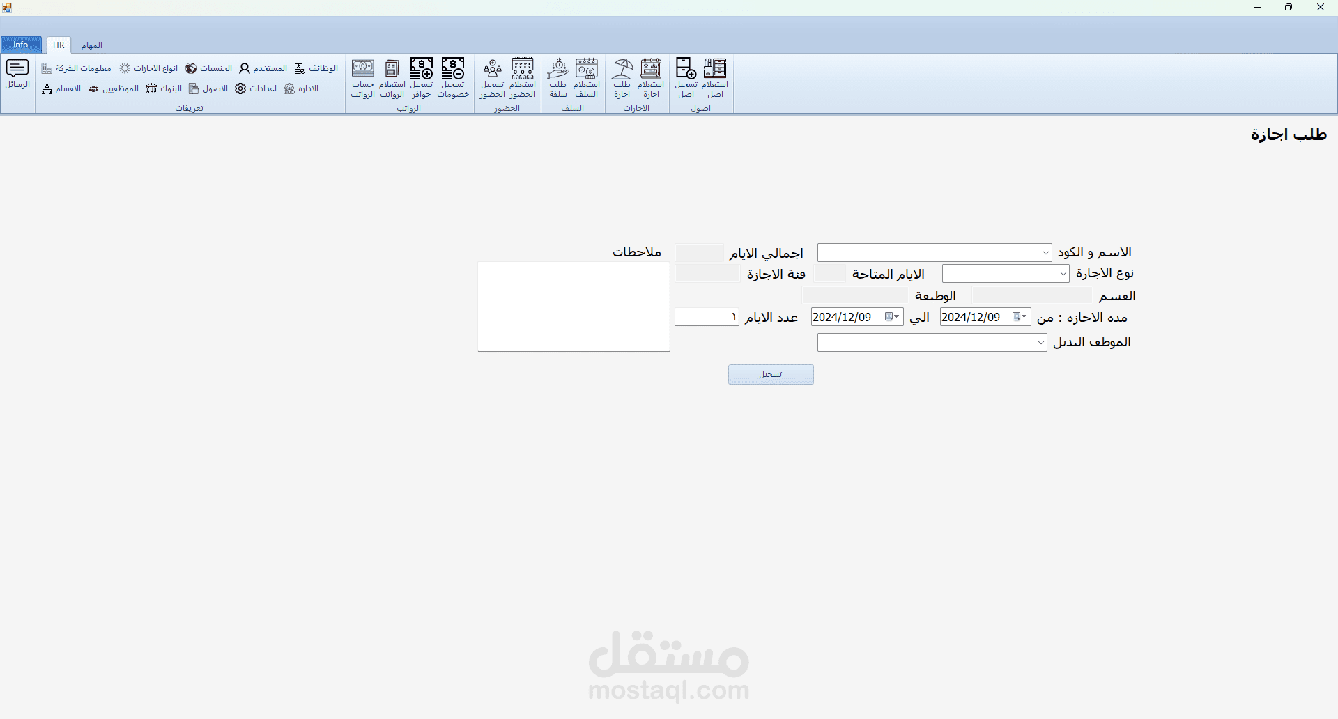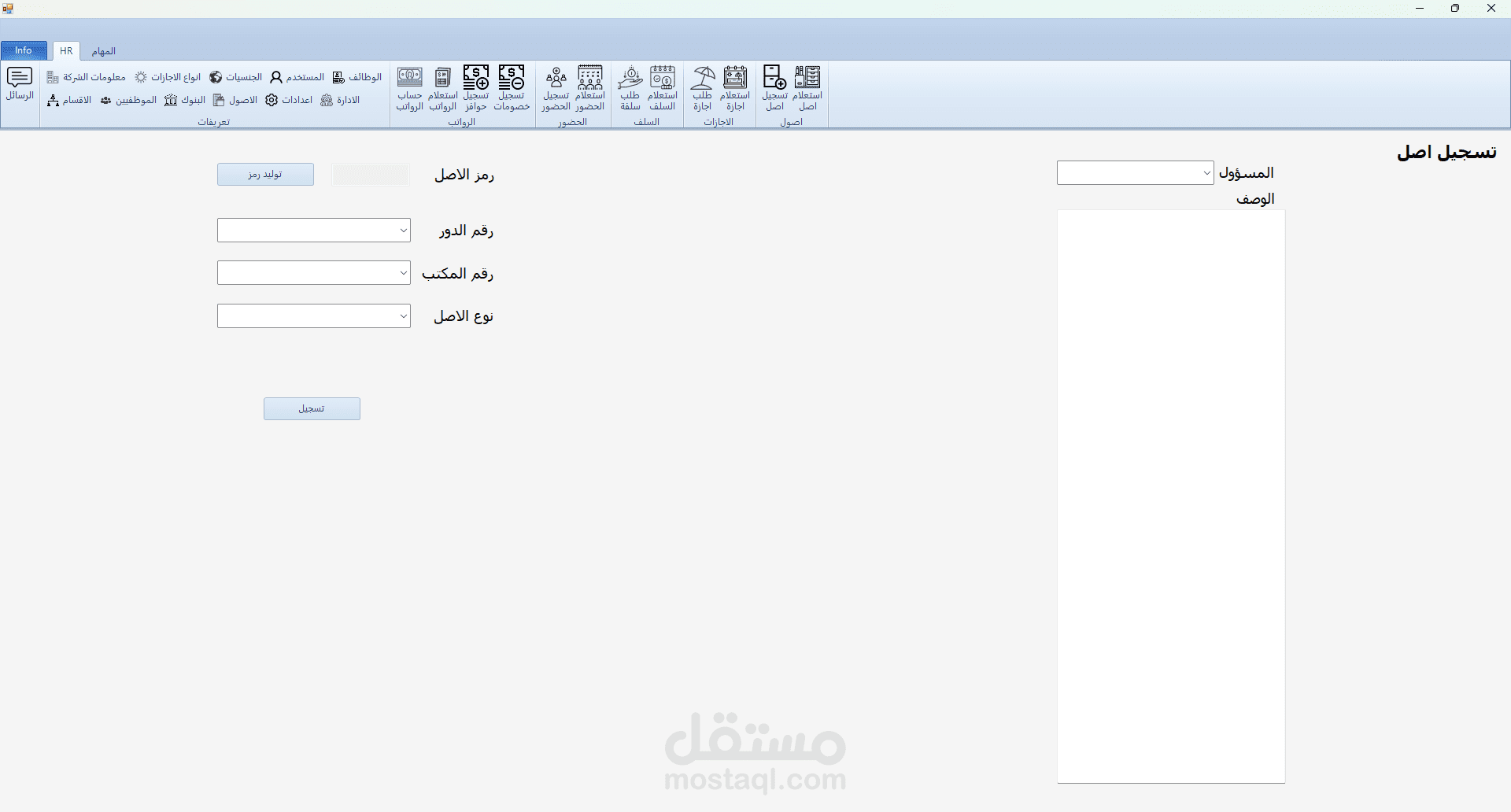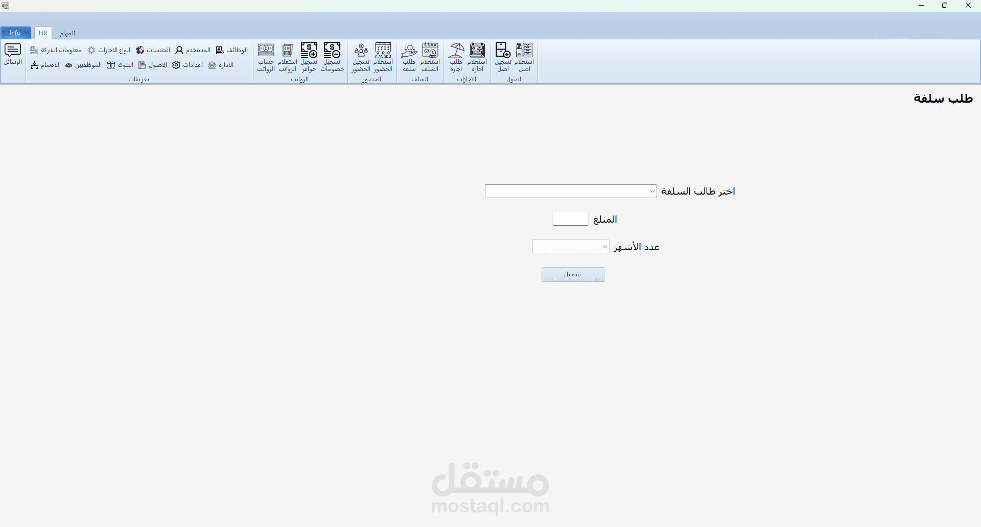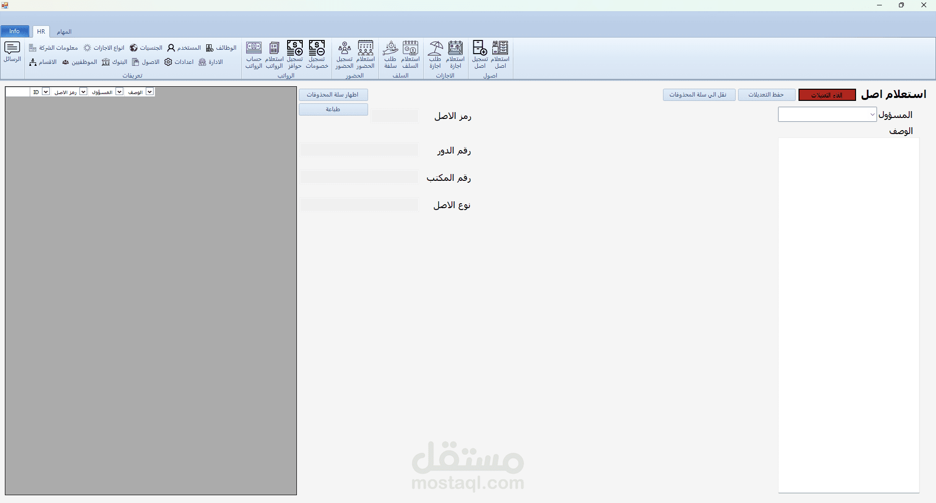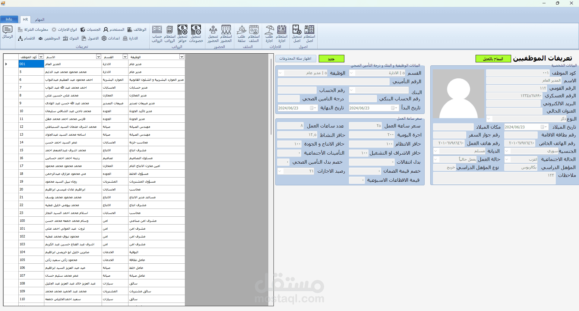 برنامج HR هو برنامج تم تطويره بلغة C# مع الربط بقاعدة بيانات من نوع sql server و لقد قمت بأنشائه لكي يقوم حساب الحضور و الانصراف و تسجيل السلف و الاجازات و علي هذا يقوم البرنامج بحساب مرتبات الموظفين و يقوم بعرض بيانات جميع الموظفين و يقوم ايضا بتسجيل ما تم اخذه من الشركه ك عهدة (اصل) علس سبيل المشال في حالة تم اعطاء الشركة احد الموظفين جهاز لابتوب تقوم الشركة بتسجيل هذا في البرنامج و تقوم بطباعته كما هو موضح في الصور و يقوم الموظف المسؤول بالتوقيع علي هذه الورقة و ايضا في حالة كانت احد الموظفين يرد ان يأخذ اجازة يقوم بفتح البرنامج و التقديم علي طلب اجازة و في هذه الحالة يقوم البرنامج بأضافتها الي الاجازات لكن لا يتم اعتماد هذه الاجازة الي في حالة موافقة المسؤولون و في حالة تمت الموافقة يقوم البرنامج بخصمها من المرتب