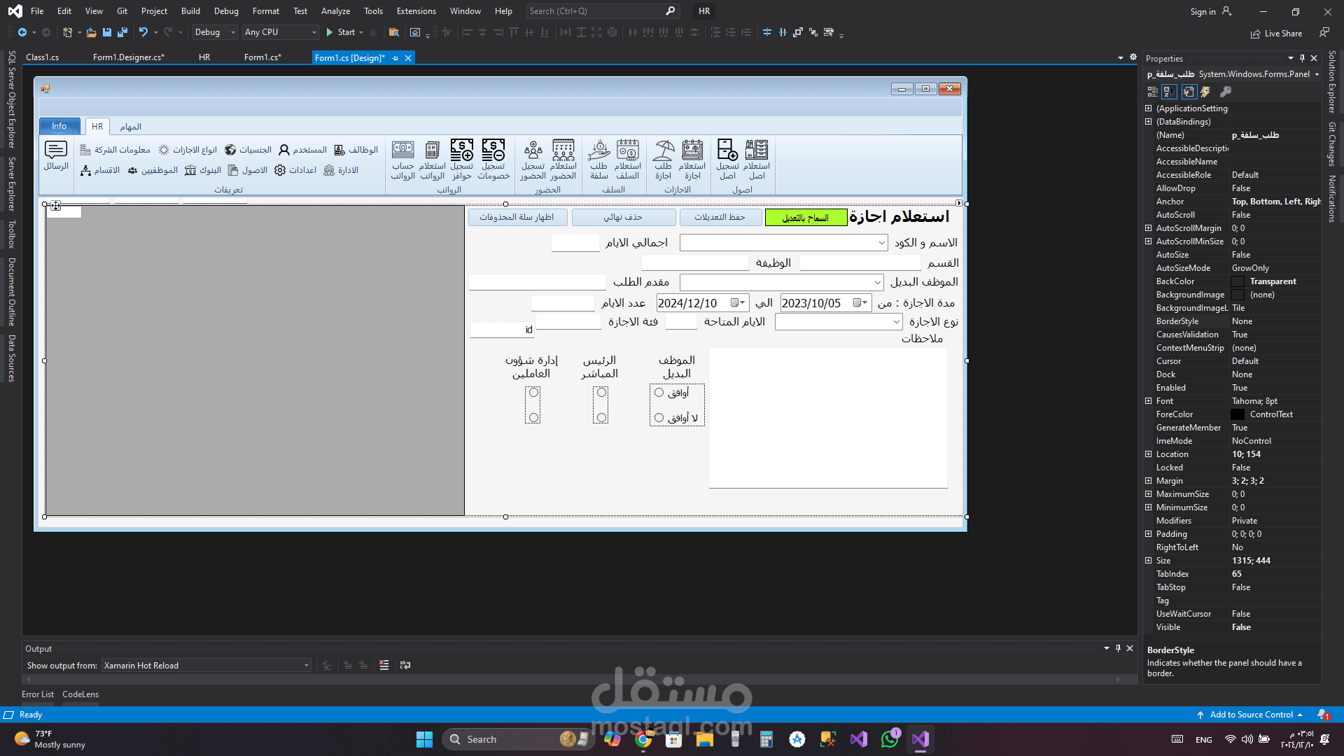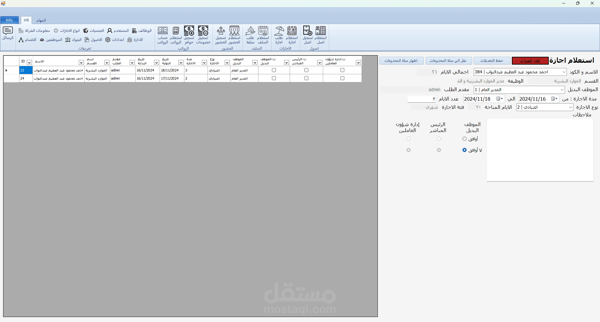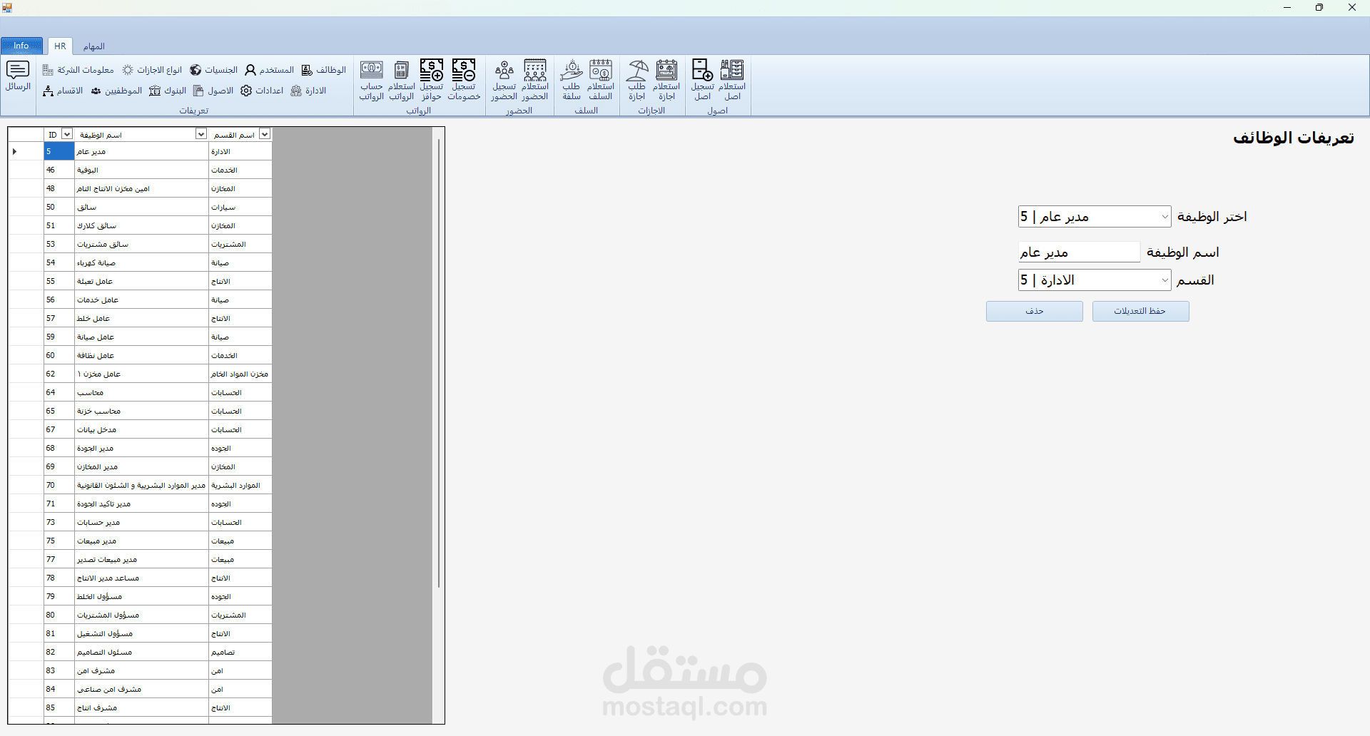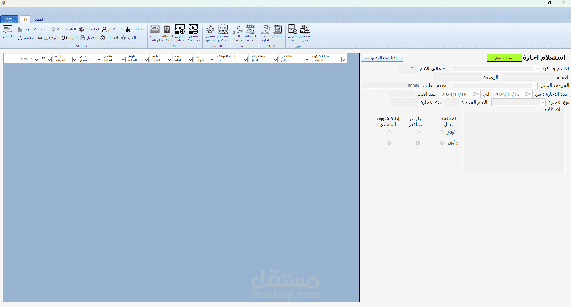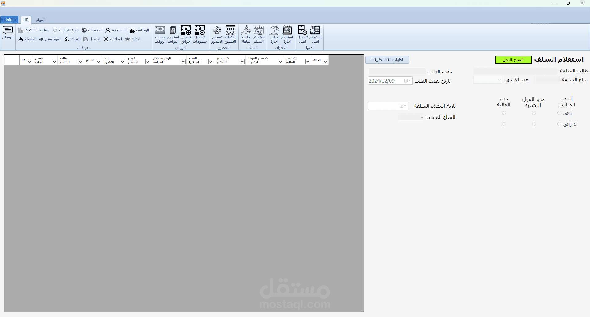 برنامج HR هو برنامج تم تطويره بلغة C# مع الربط بقاعدة بيانات من نوع sql server و لقد قمت بأنشائه لكي يقوم حساب الحضور و الانصراف و تسجيل السلف و الاجازات و علي هذا يقوم البرنامج بحساب مرتبات الموظفين و يقوم بعرض بيانات جميع الموظفين و يقوم ايضا بتسجيل ما تم اخذه من الشركه ك عهدة (اصل) علس سبيل المشال في حالة تم اعطاء الشركة احد الموظفين جهاز لابتوب تقوم الشركة بتسجيل هذا في البرنامج و تقوم بطباعته كما هو موضح في الصور و يقوم الموظف المسؤول بالتوقيع علي هذه الورقة و ايضا في حالة كانت احد الموظفين يرد ان يأخذ اجازة يقوم بفتح البرنامج و التقديم علي طلب اجازة و في هذه الحالة يقوم البرنامج بأضافتها الي الاجازات لكن لا يتم اعتماد هذه الاجازة الي في حالة موافقة المسؤولون و في حالة تمت الموافقة يقوم البرنامج بخصمها من المرتب