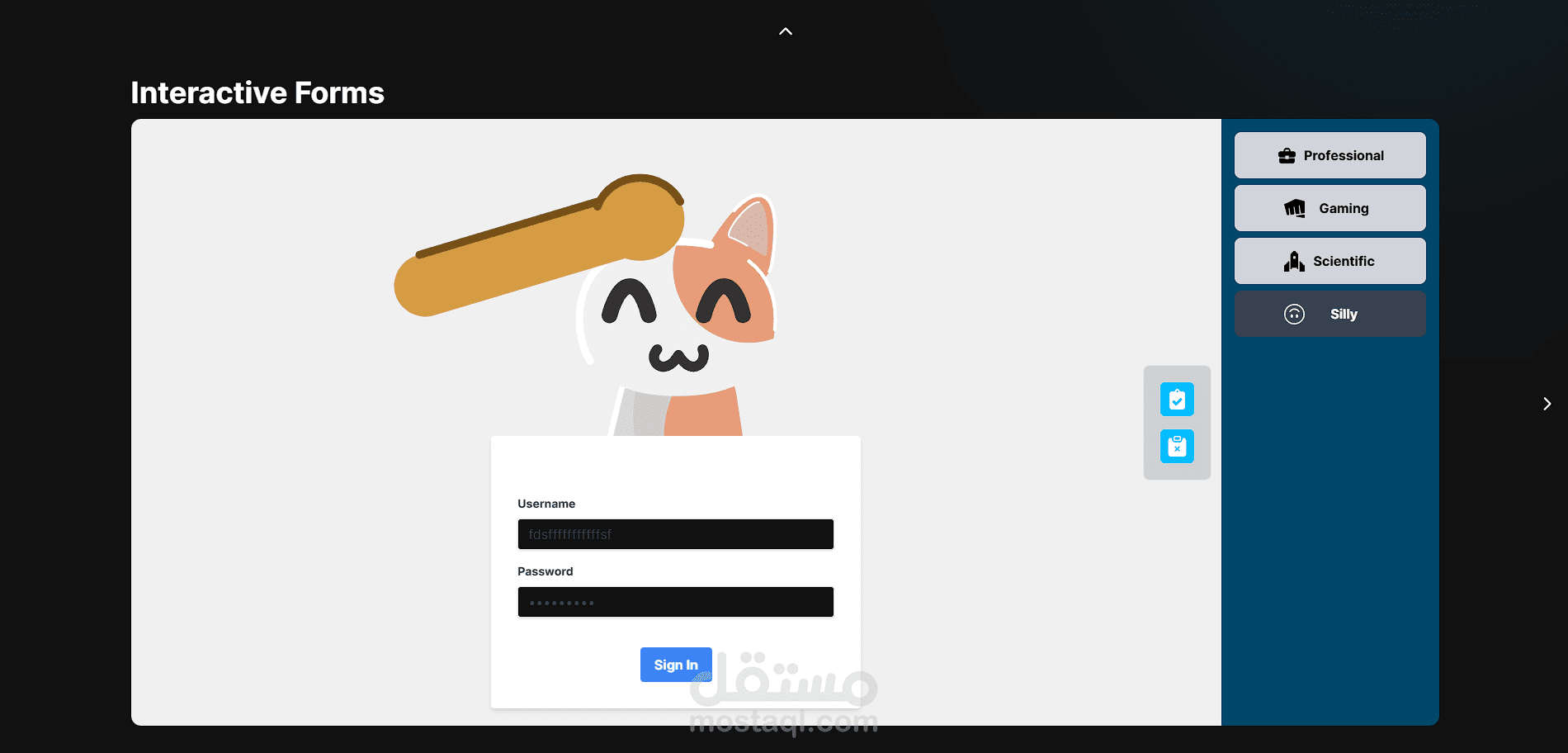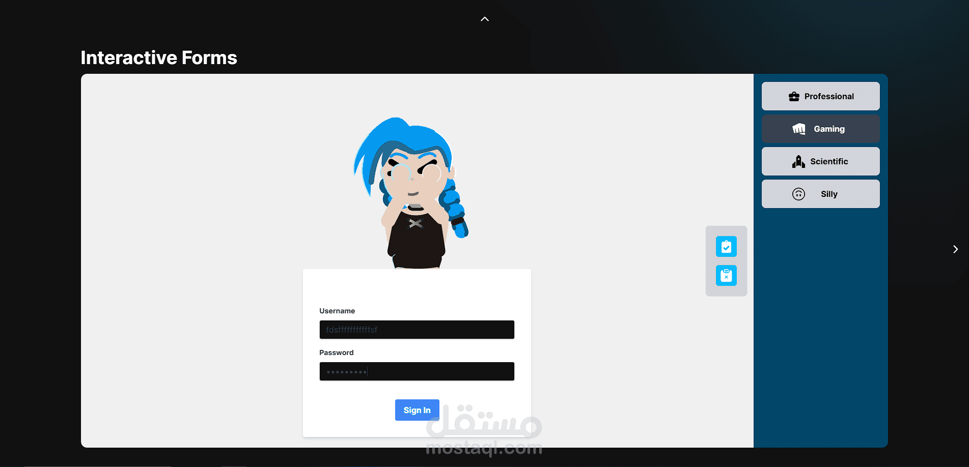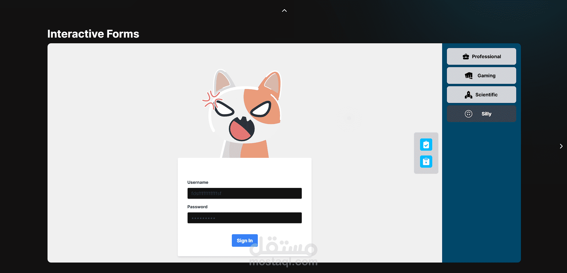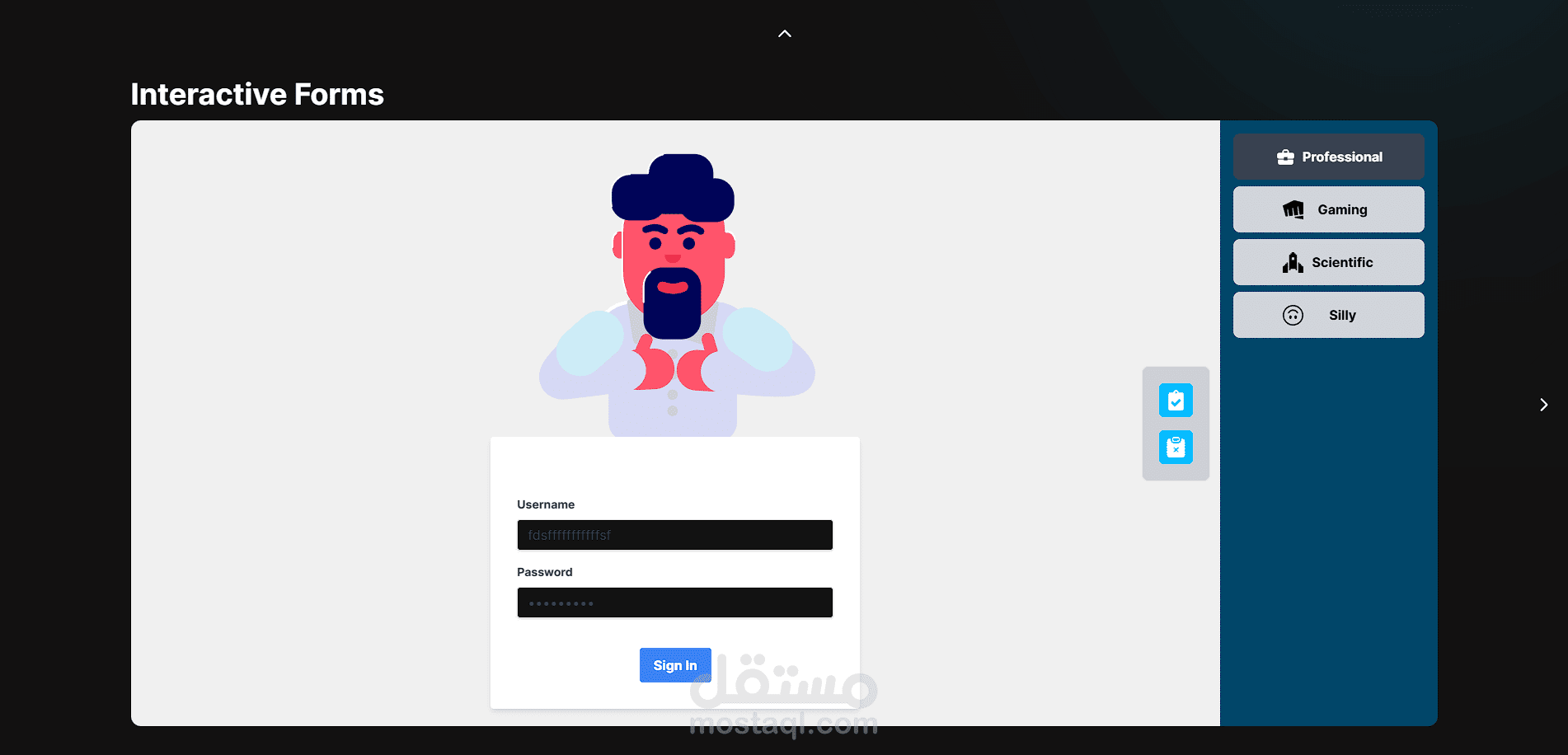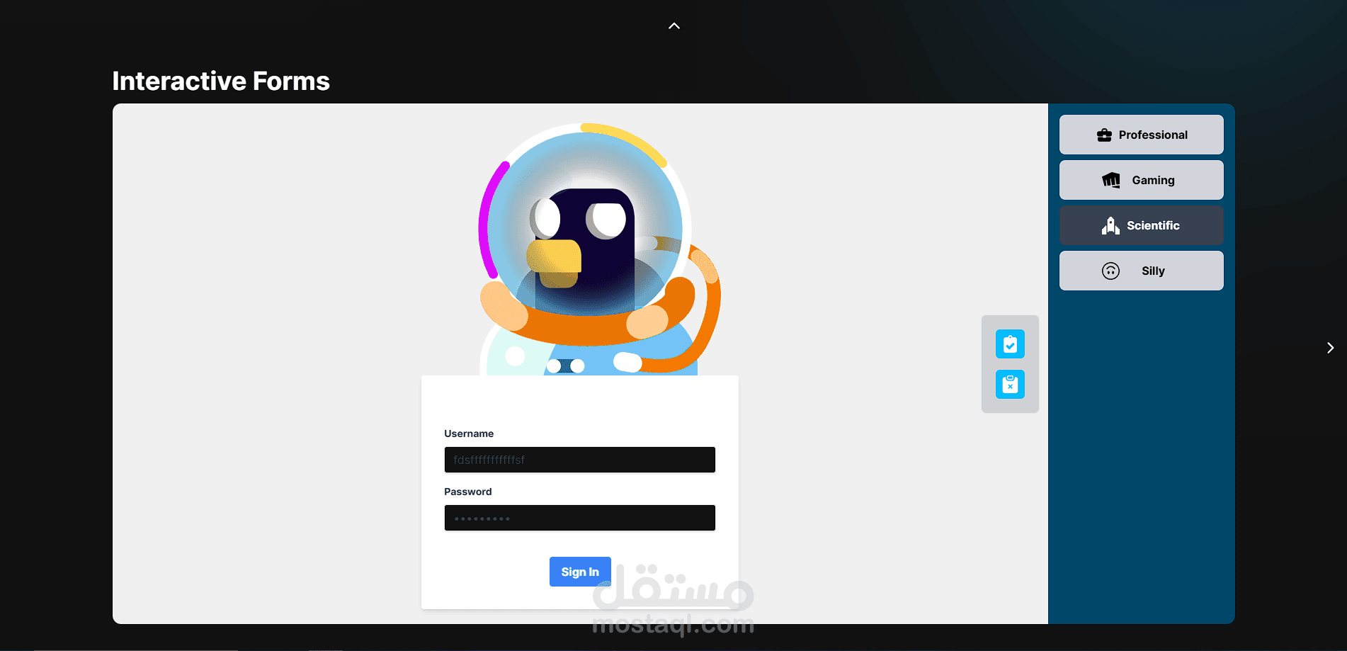 مجموعة من شخصيات UI التفاعلية التي تتفاعل مع المستخدم، وتتميز بحالات معقدة مثل النجاح، الكتابة، الفشل، التأثيرات عند التحويم، وغيرها، مما يضيف تجربة ديناميكية وغنية لواجهة المستخدم.