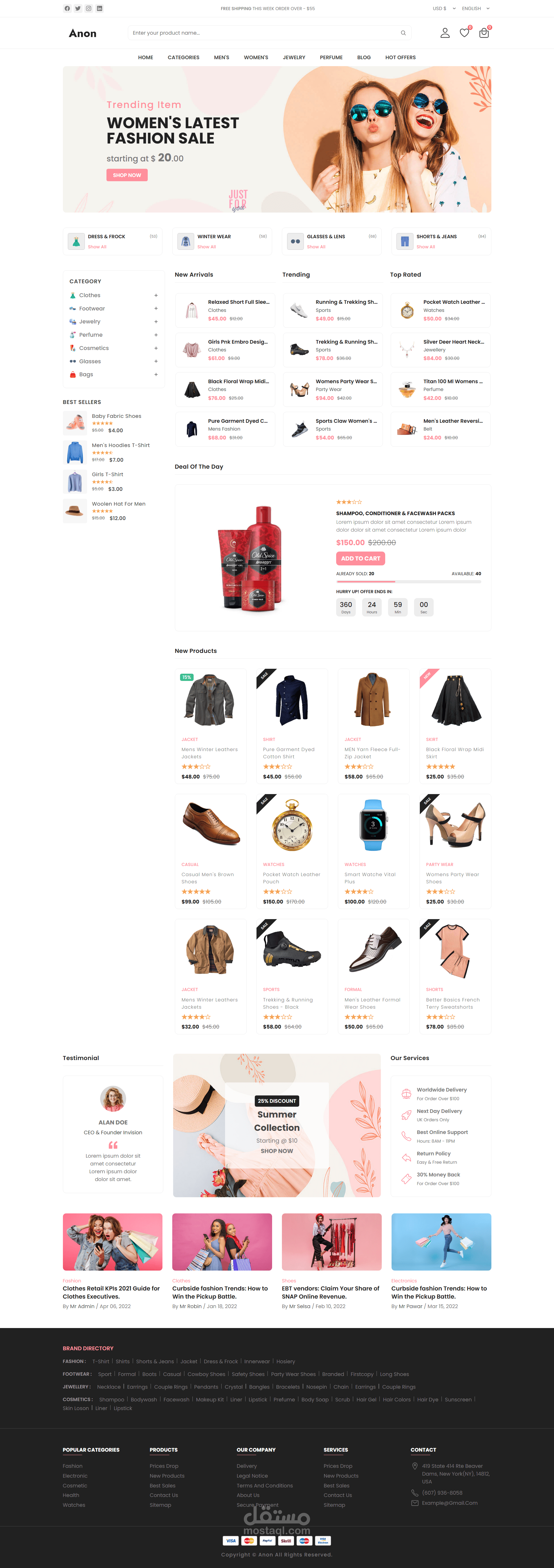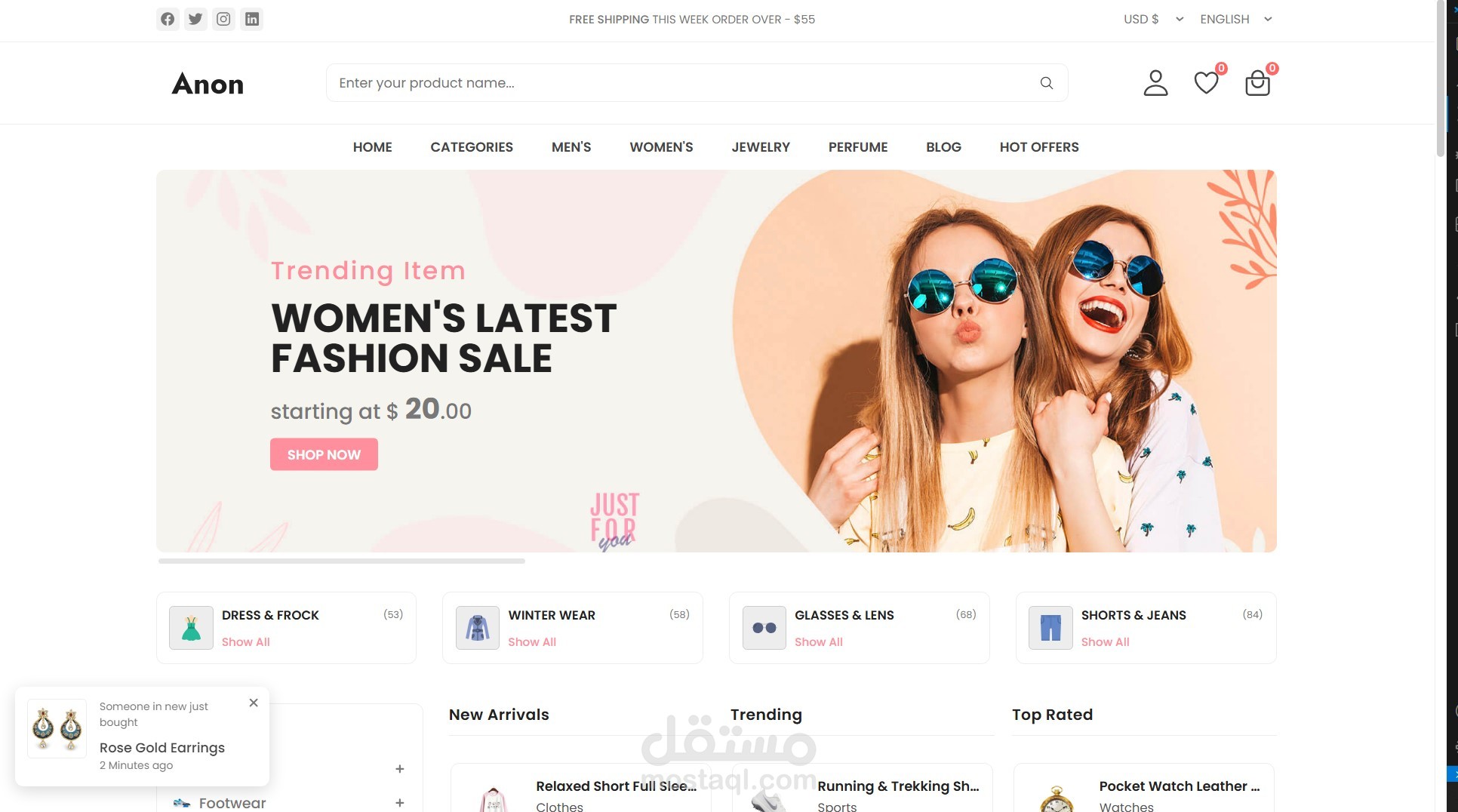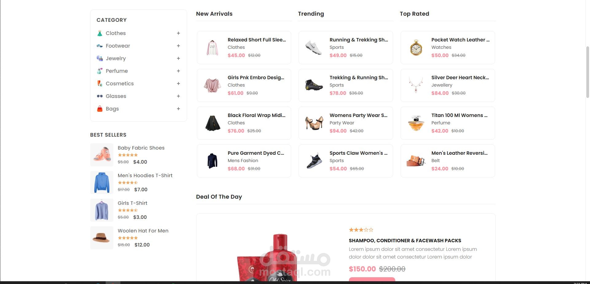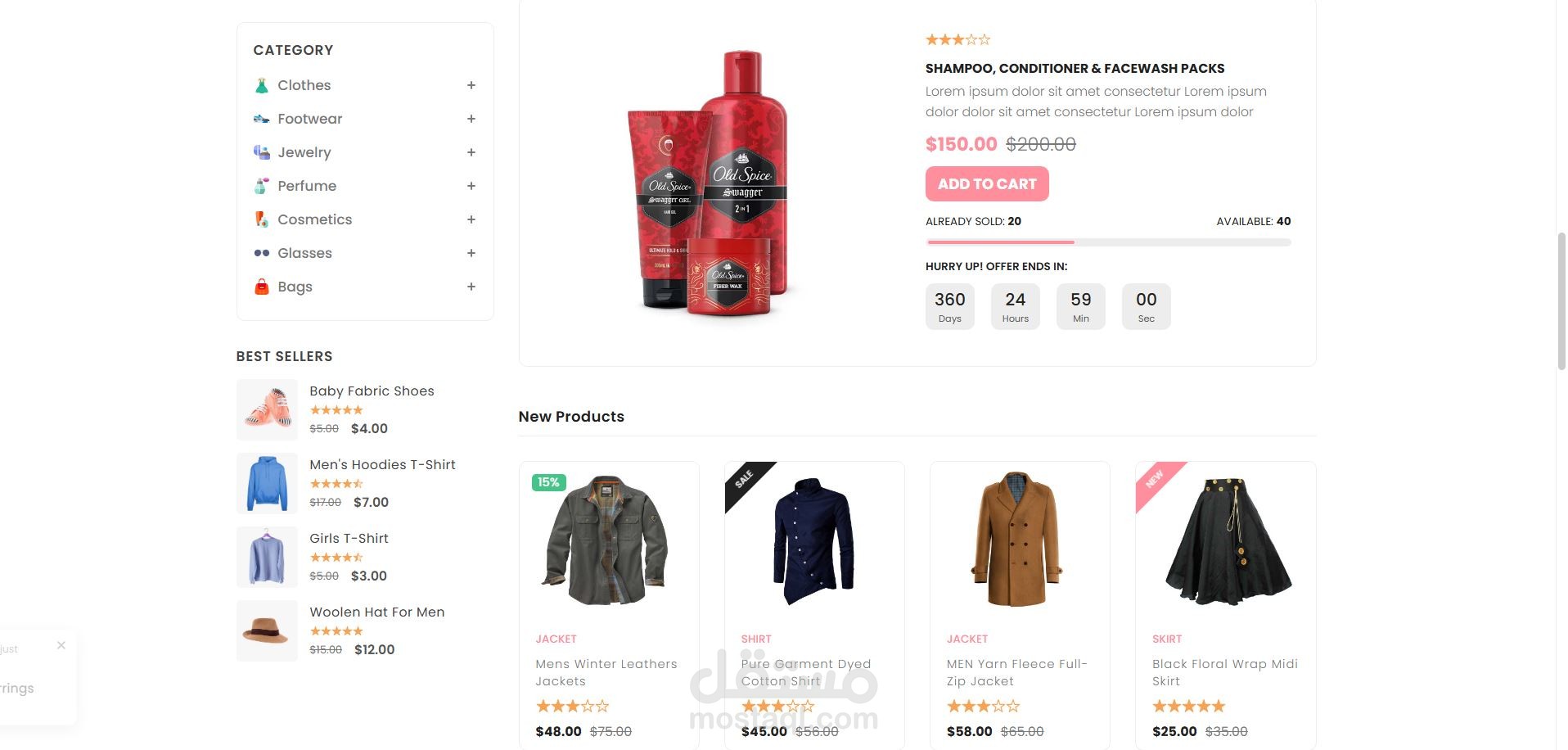 التصنيفات (Categories): عرض المنتجات وفقًا للتصنيفات مثل "رجالي"، "نسائي"، "عطور"، "مجوهرات"، مع إمكانية تصفية المنتجات.