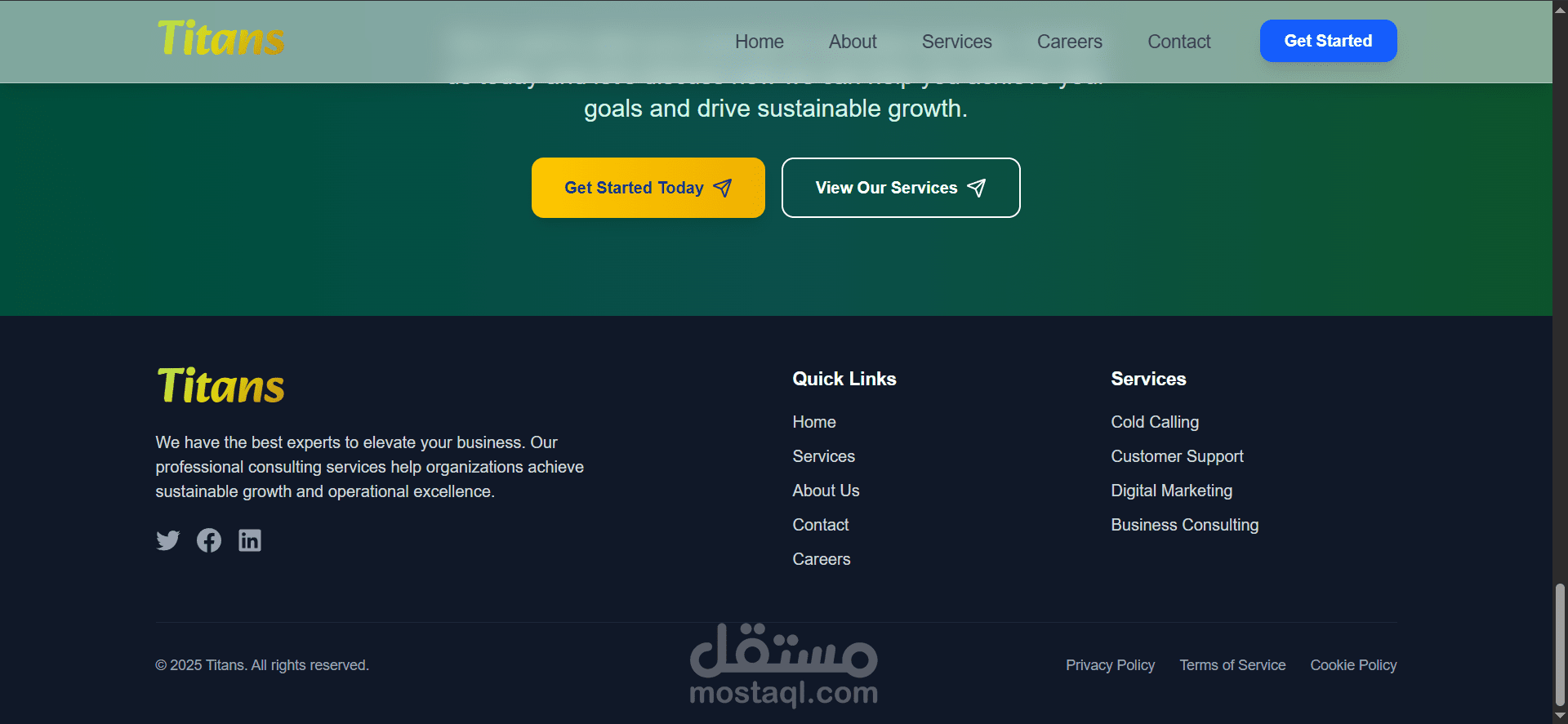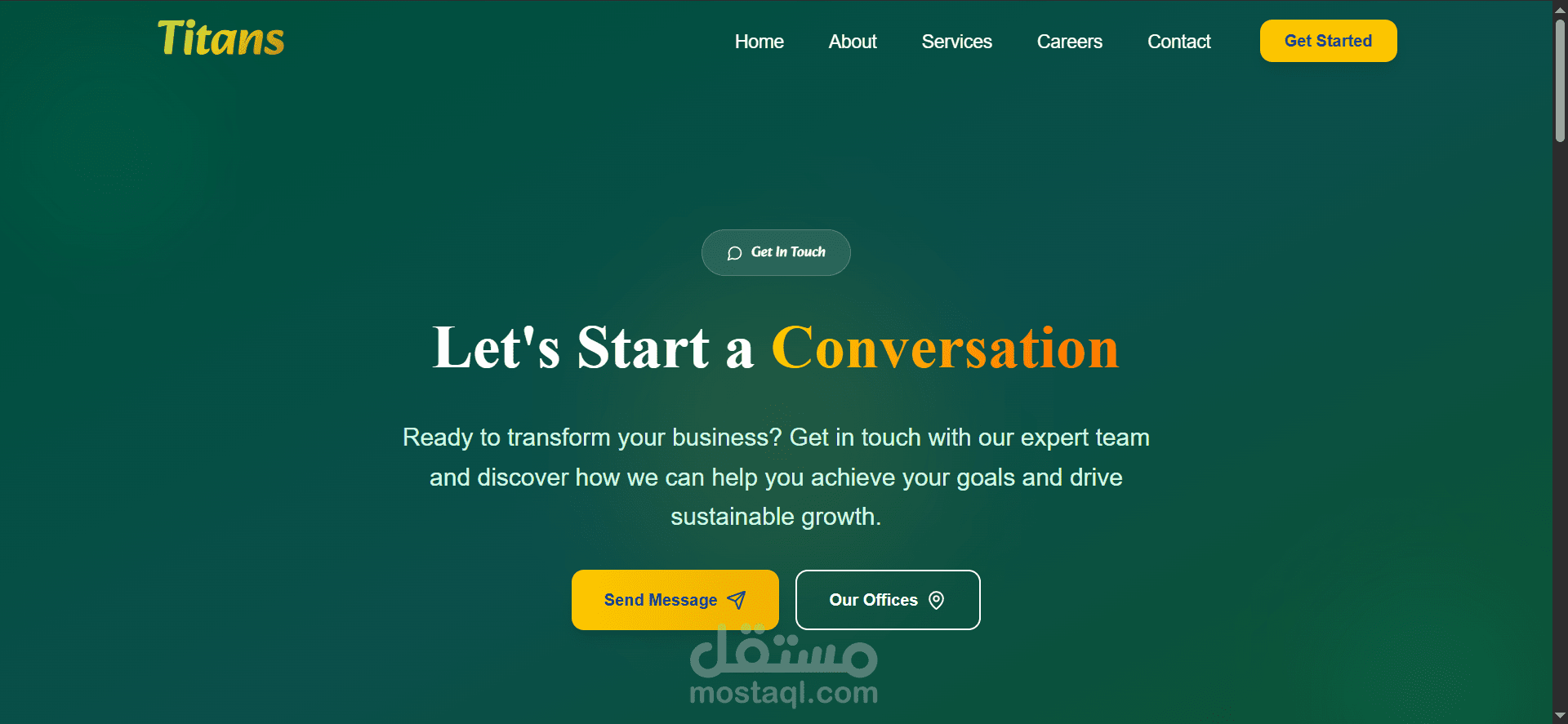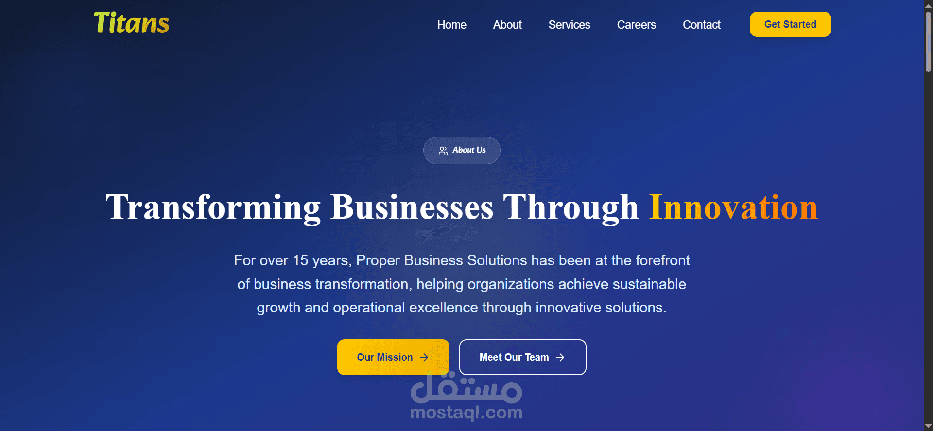 • Titans هو موقع إلكتروني لشركة حلول أعمال، يتميز بتصميم عصري وتجربة مستخدم سلسة. يتكامل الموقع مع جداول بيانات جوجل لإدارة عمليات إرسال النماذج وإدارة البيانات بكفاءة.