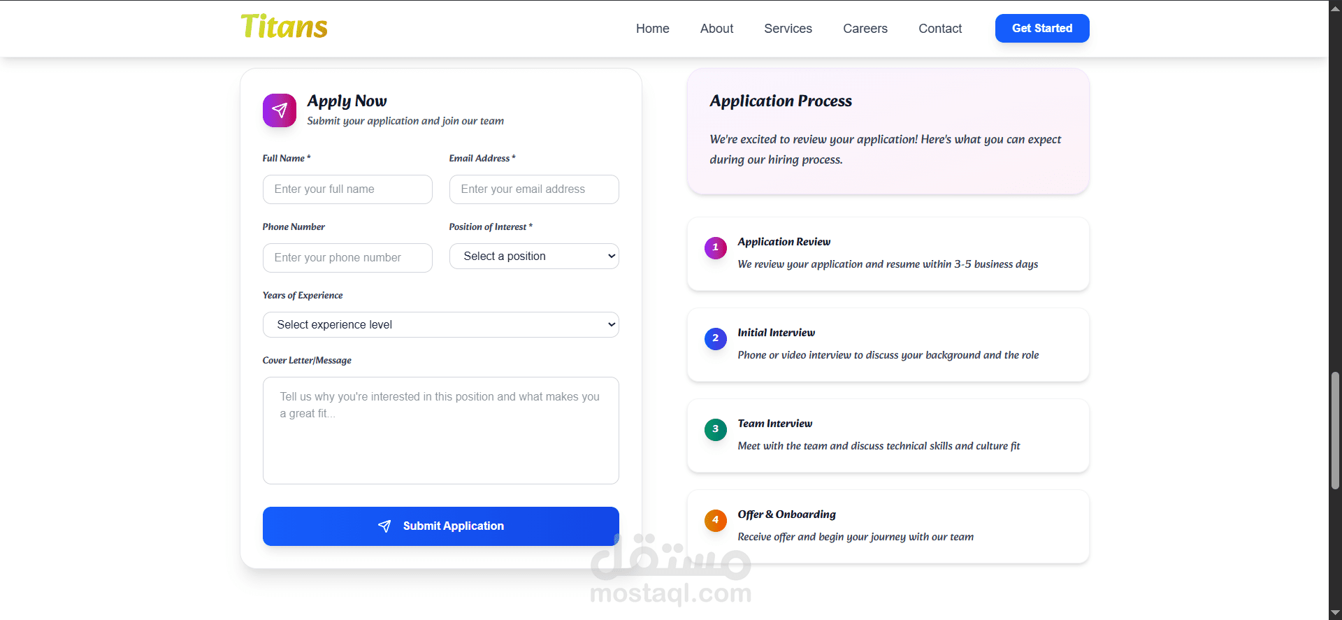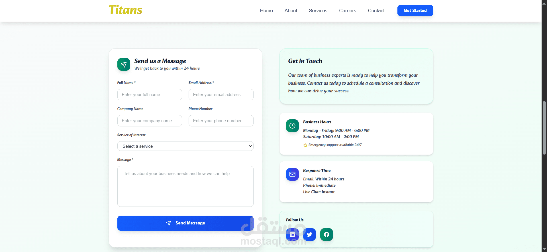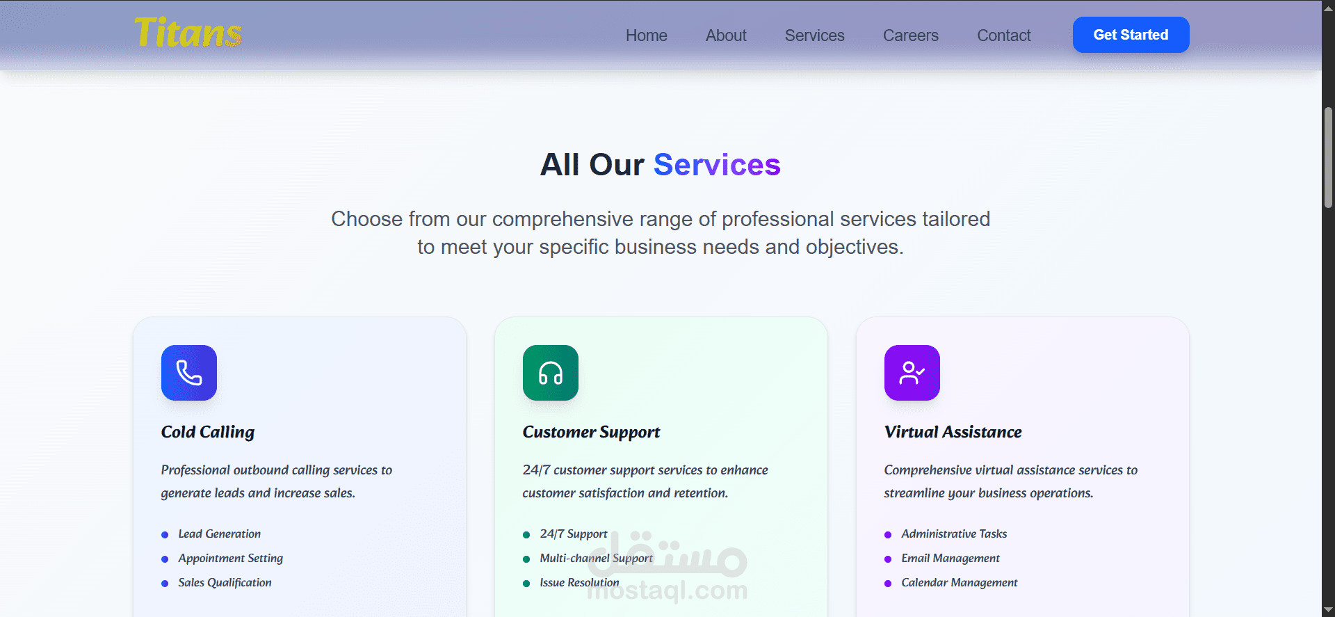 • Titans هو موقع إلكتروني لشركة حلول أعمال، يتميز بتصميم عصري وتجربة مستخدم سلسة. يتكامل الموقع مع جداول بيانات جوجل لإدارة عمليات إرسال النماذج وإدارة البيانات بكفاءة.