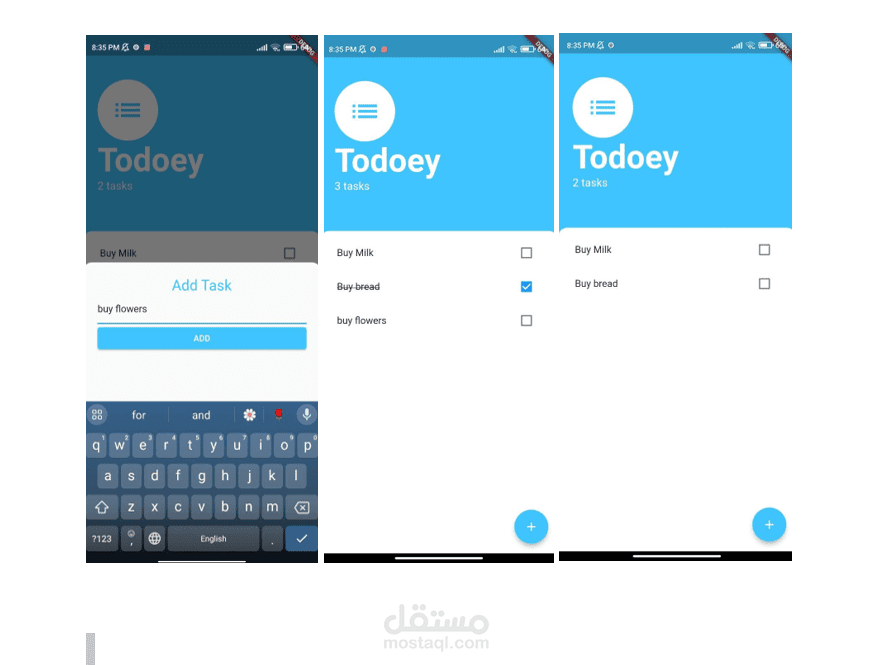 User interaction is fluid and efficient: a long press on any task will remove it from the list. A floating action button (FAB) is prominently placed at the bottom of the screen, which, when pressed, opens a bottom sheet containing a simple form to add new tasks. This form includes a text input field for the task name and a button to confirm the action. Once added, the new task is seamlessly inserted into the task list, ensuring a smooth experience for the user.