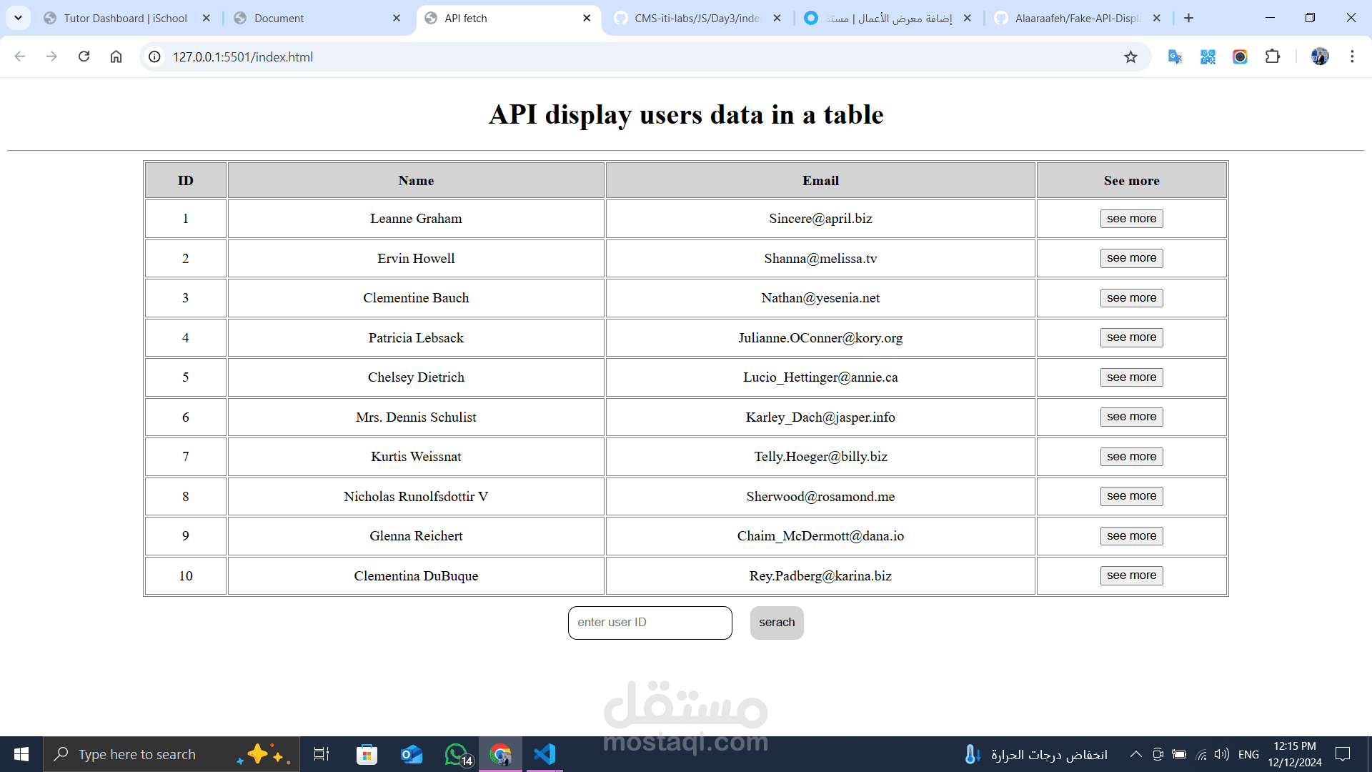 هذا المشروع يتيح لك عرض بيانات المستخدمين في جدول أنيق ومتفاعل باستخدام JavaScript و AJAX. بمجرد تحميل الصفحة، يتم تحميل بيانات المستخدمين من API خارجي ويتم عرضها في جدول يحتوي على الأعمدة التالية: "ID"، "Name"، "Email"، و "See More". بالإضافة إلى ذلك، يوفر المشروع زرًا لعرض تفاصيل المستخدم بشكل منفصل عند الضغط عليه.