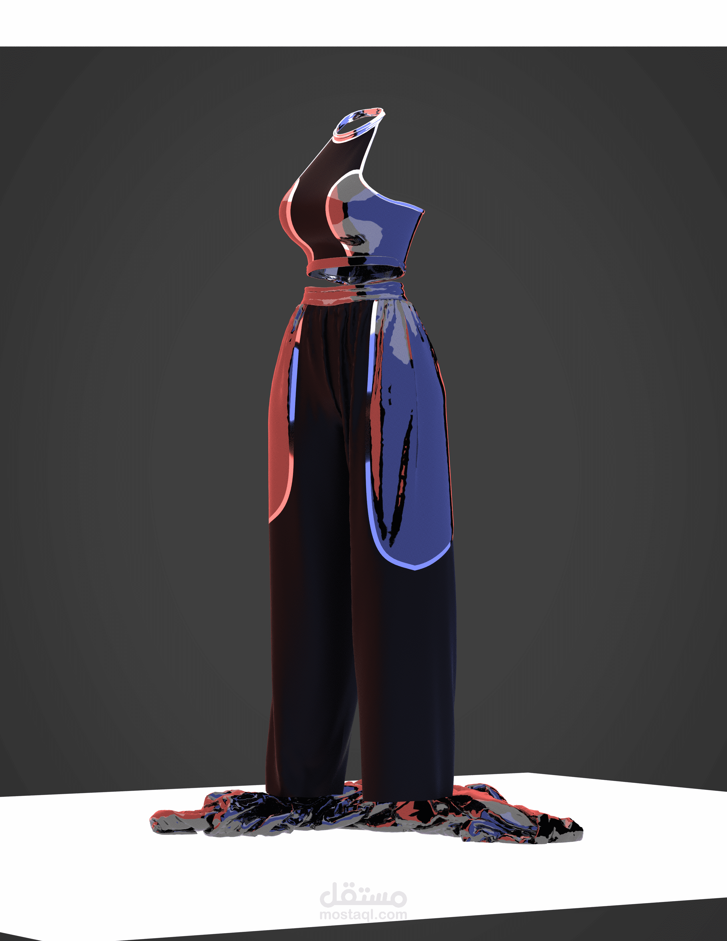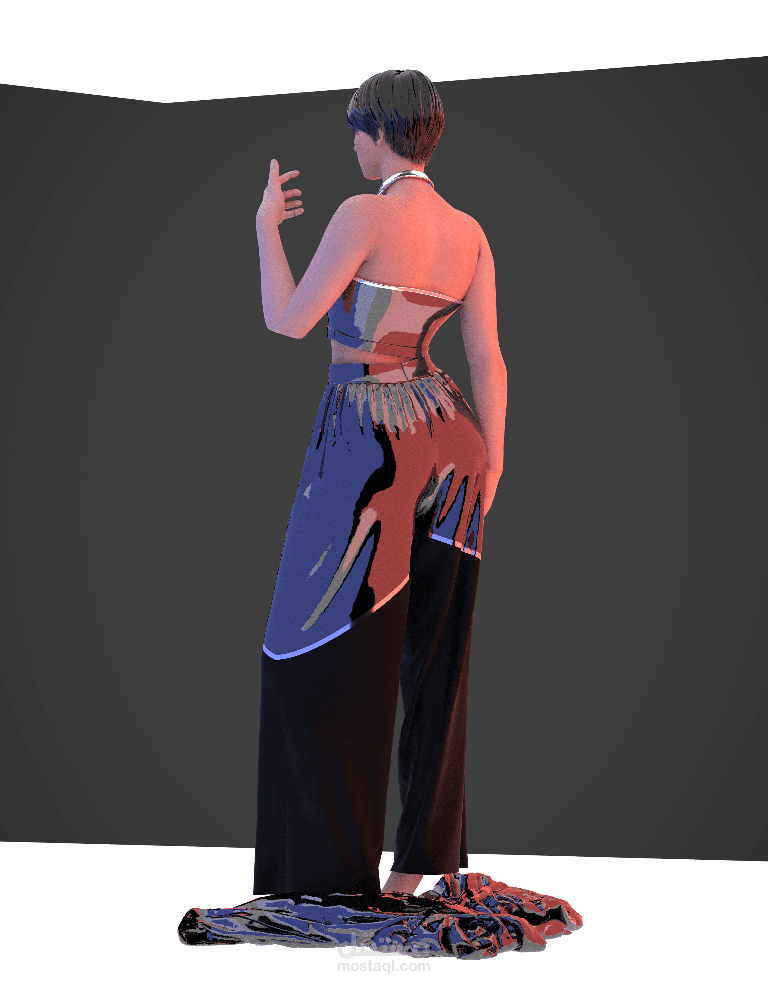 الستايل يمزج بين العصرية والجرأة، مكوّن من توب قصير بقصّة رياضية لكن مصمم بخطوط معدنية لامعة مستوحاة من المستقبل، مع بنطلون واسع عالي الخصر يوازن الراحة بالأناقة. القطعة الخارجية الفضفاضة المصنوعة من نفس القماش اللامع تضيف بعد فني، ليصبح الطقم أقرب إلى موضة ستريت وير مستقبلية (futuristic streetwear) بروح أڤان غارد.