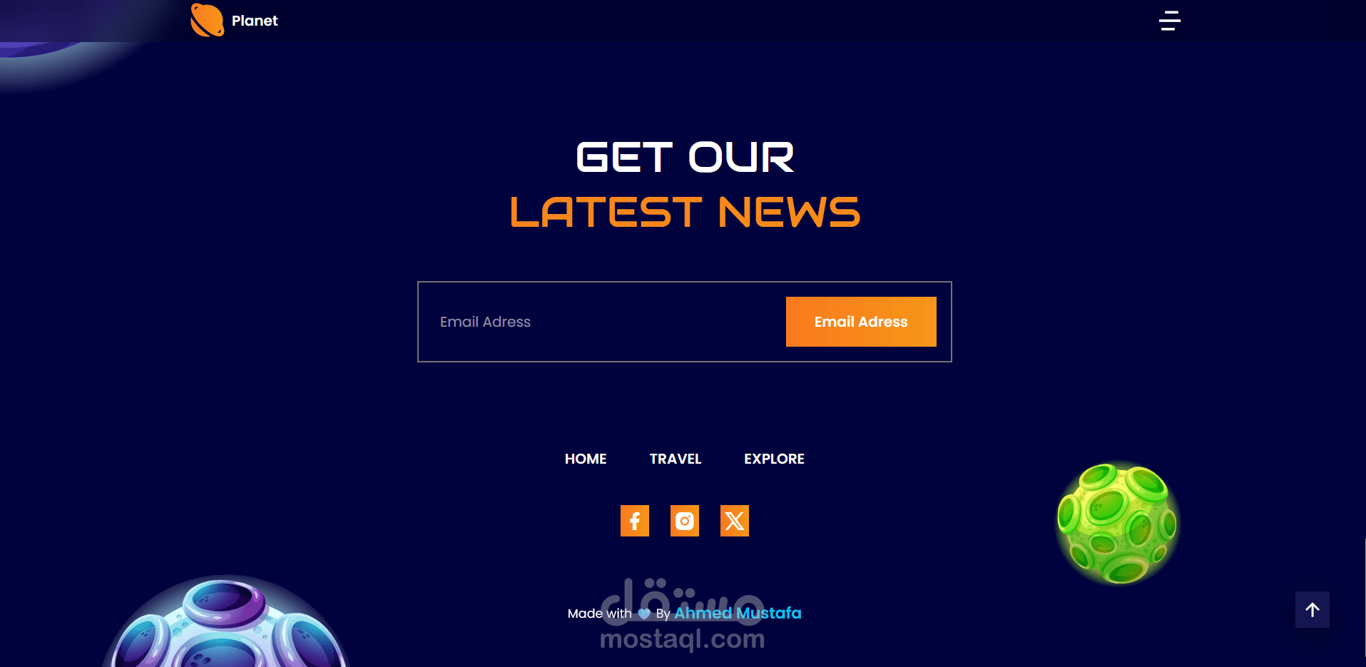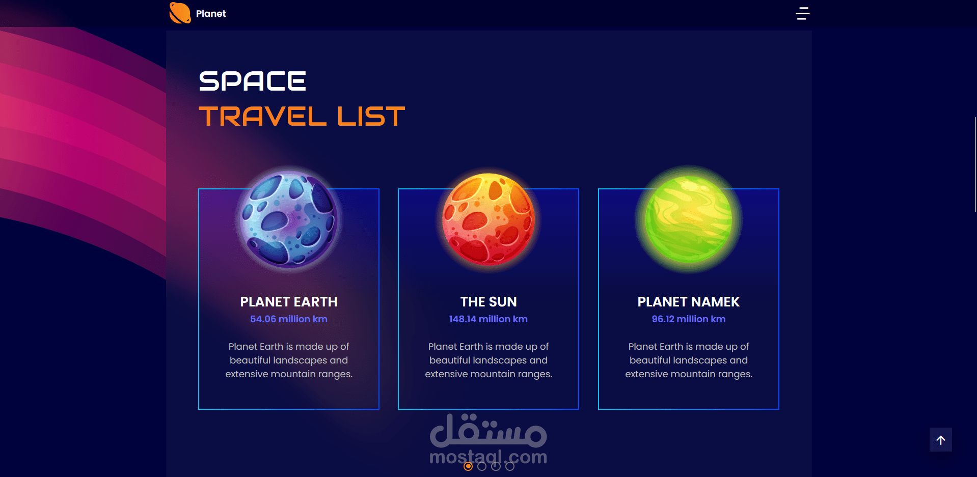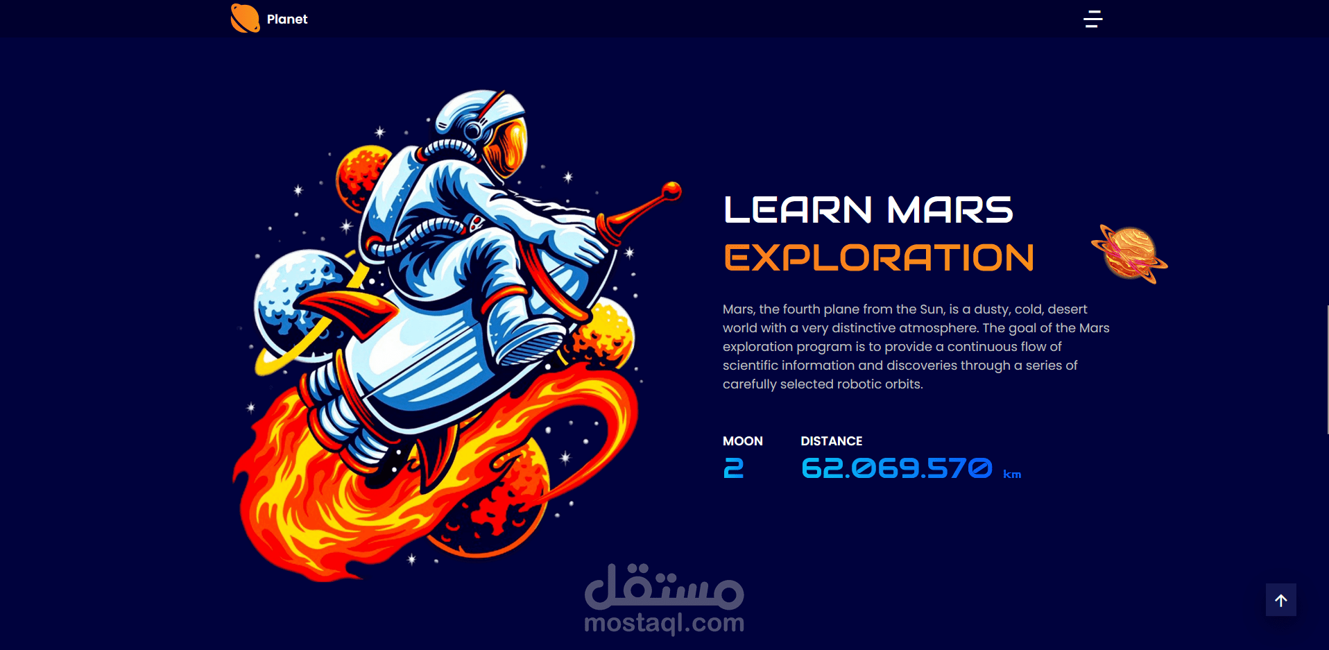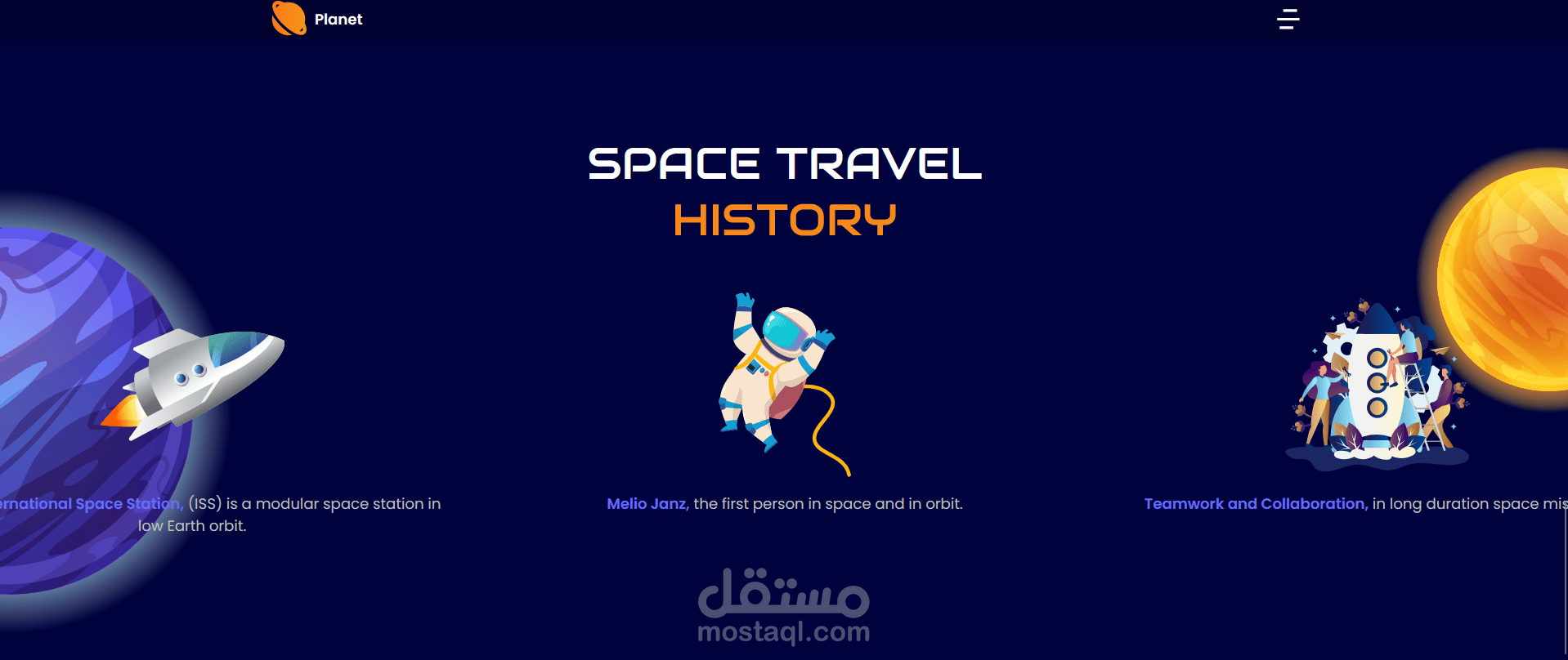 تصميم ابداعي لموقع به بعض المعلومات عن الفضاء
