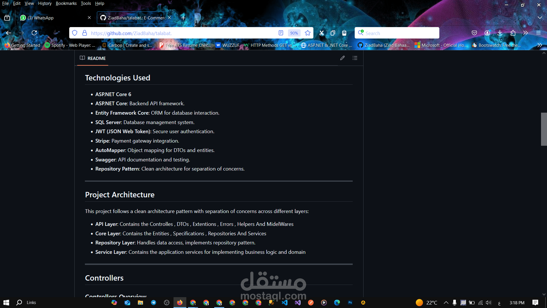 API Layer: يحتوي على الـ Controllers، الـ DTOs، الـ Extensions، الأخطاء (Errors)، المساعدات (Helpers)، والوسيطات (Middlewares).