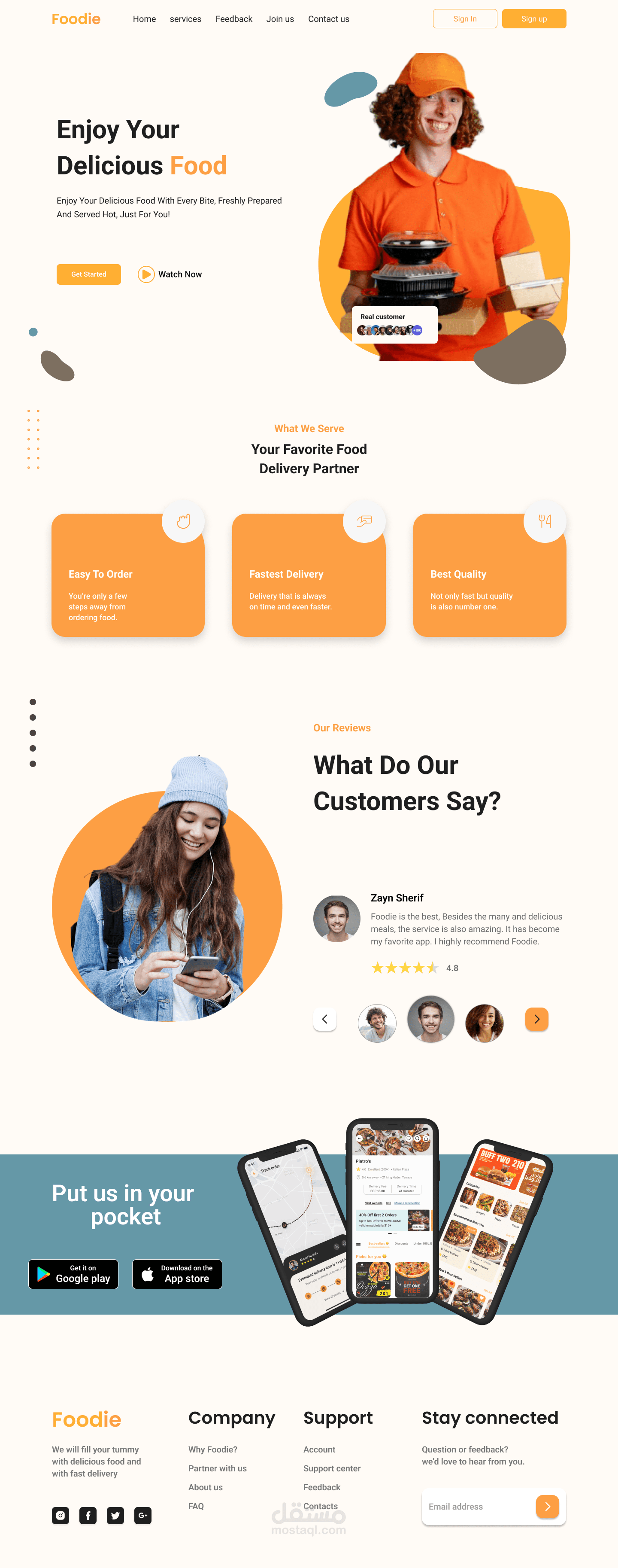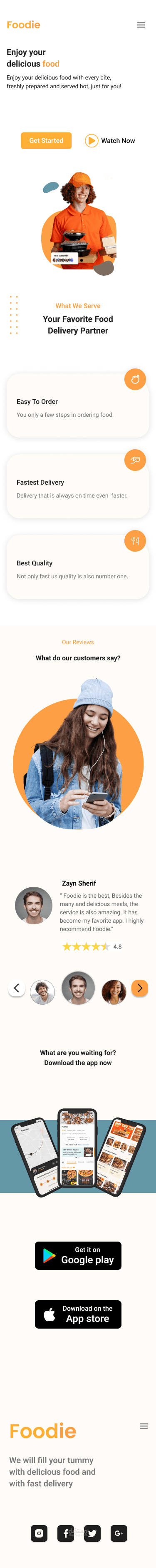 The landing page for the food delivery app is designed to create an engaging first impression while effectively showcasing the app's value proposition. Its modern, visually appealing layout ensures easy navigation and maximizes user engagement.