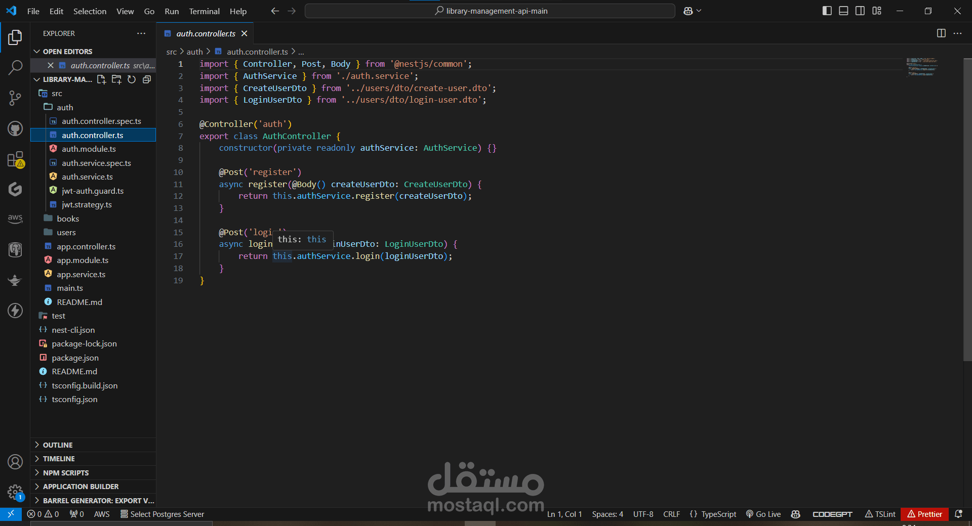 auth.controller.ts: Defines the authentication controller.