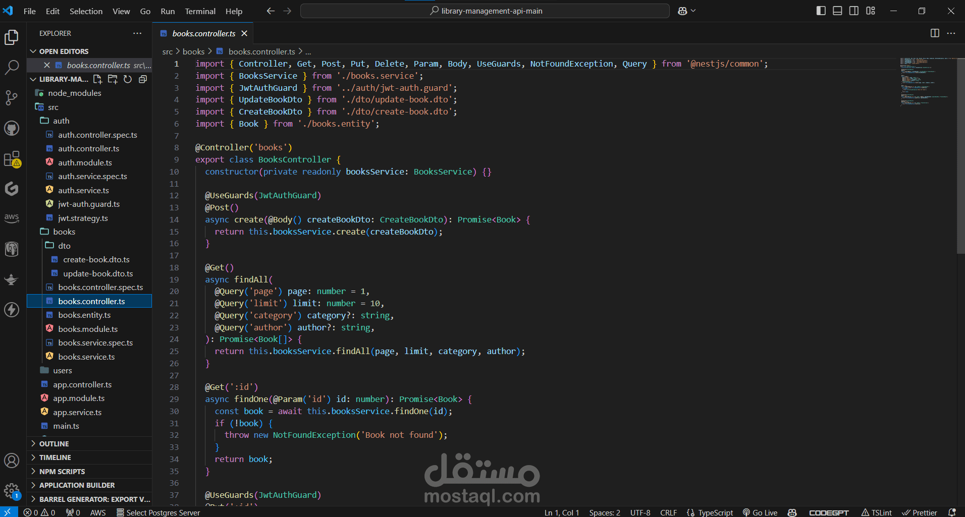 books.controller.ts: Defines the books controller.