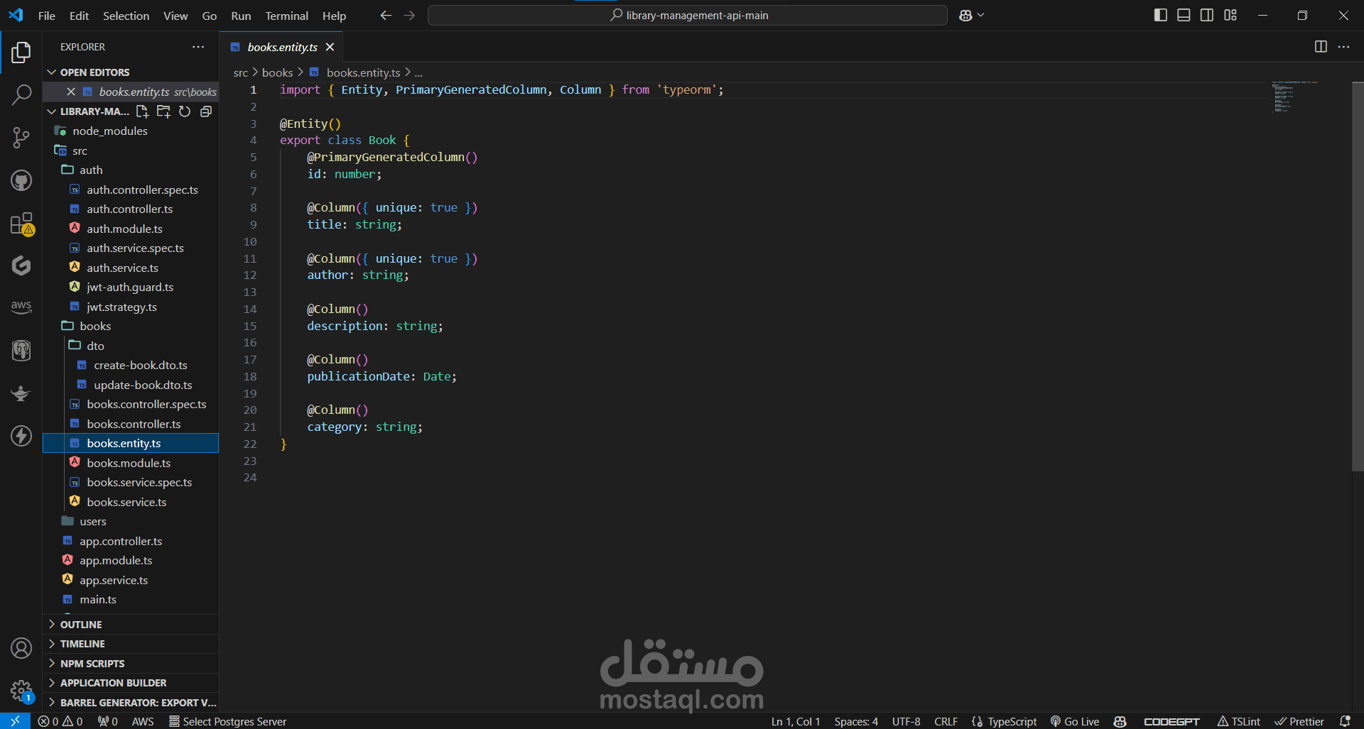 books.entity.ts: Defines the book entity for TypeORM.