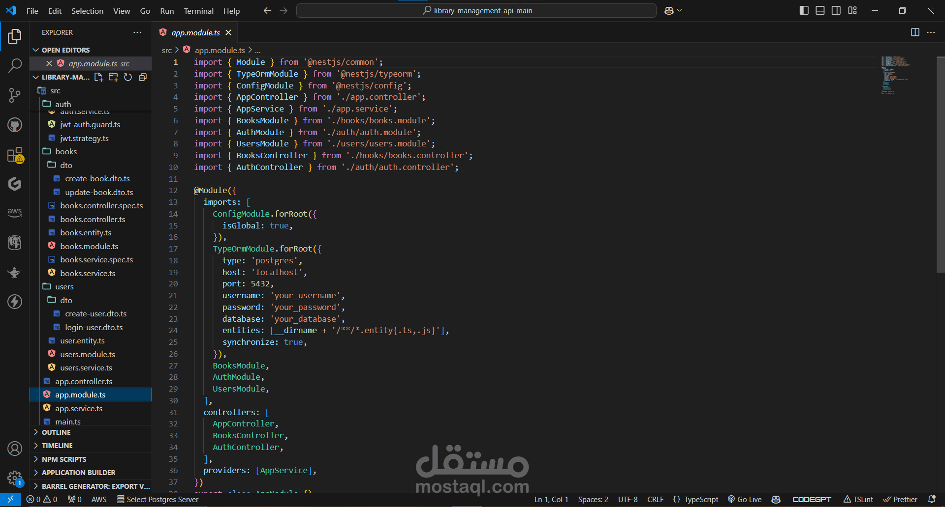 AppModule: The root module that imports other modules such as BooksModule, AuthModule, and UsersModule. It also sets up global configurations and database connections using ConfigModule and TypeOrmModule.