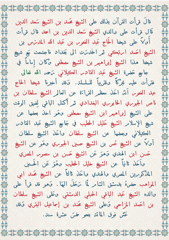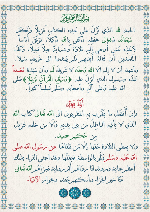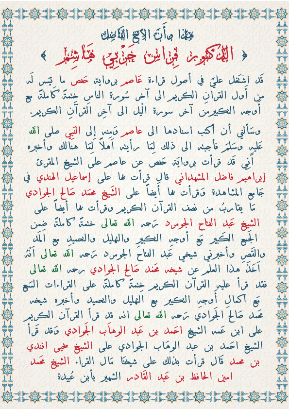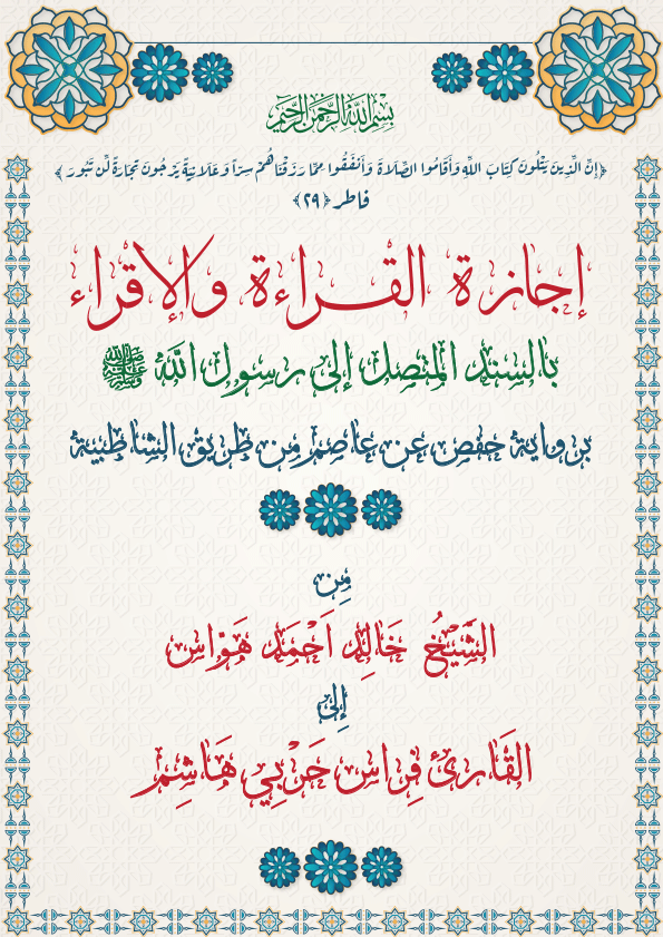 تحياتى لكم جميعاً . هذا التصميم عبارة عن إجازة قرانية في القراءة والإقراء بما ينص محتوى التصميم