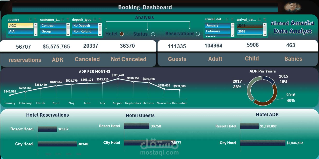 - Average Daily Rate (ADR): This section includes visualizations that display the ADR on a monthly and yearly basis. This metric is crucial for tracking the financial performance of hotels, identifying peak seasons, and adjusting pricing strategies to optimize profitability.