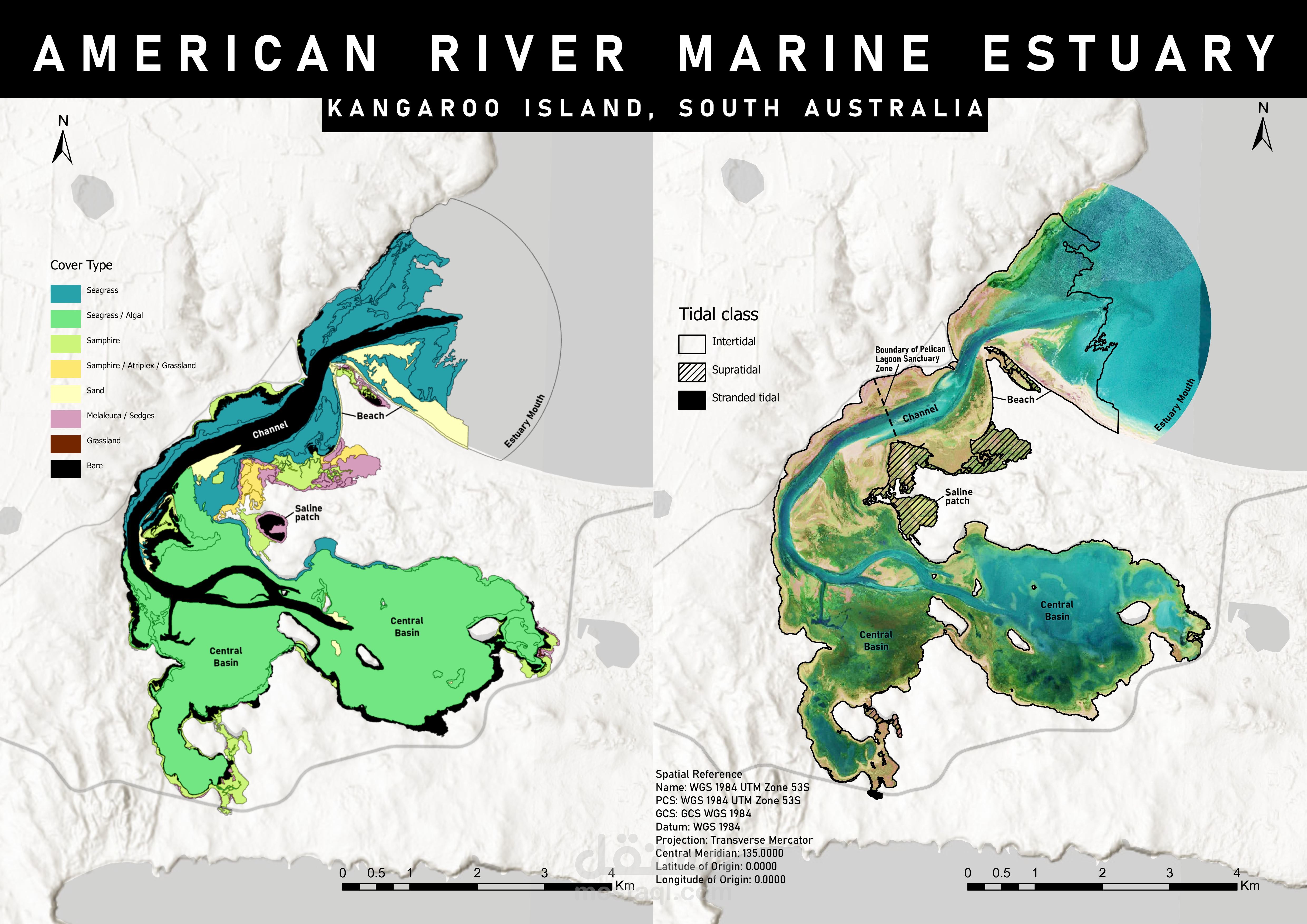 This project involves a geospatial analysis of the American River Marine Estuary on Kangaroo Island, South Australia. The analysis includes the classification of cover types, such as grasslands, bare ground, and seagrasses, and the mapping of tidal zones (stranded tidal, supratidal, and intertidal) using the WGS 1984 UTM Zone 53S spatial reference. The work supports environmental conservation efforts and habitat mapping within the Pelican Lagoon Sanctuary Zone